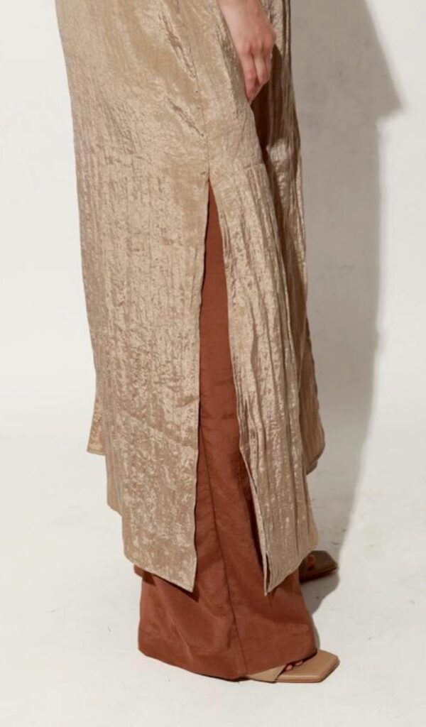 フロントは二枚仕立てのデザインで、歩くたびに軽やかに揺れる立体感が生まれ、シンプルながら表情豊かに装います。
