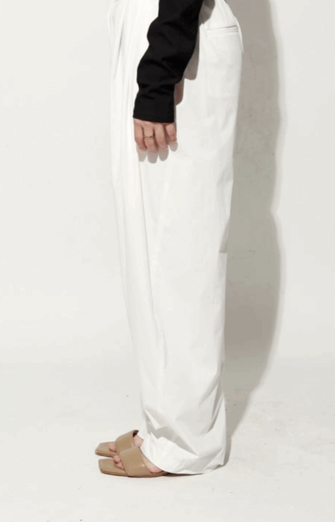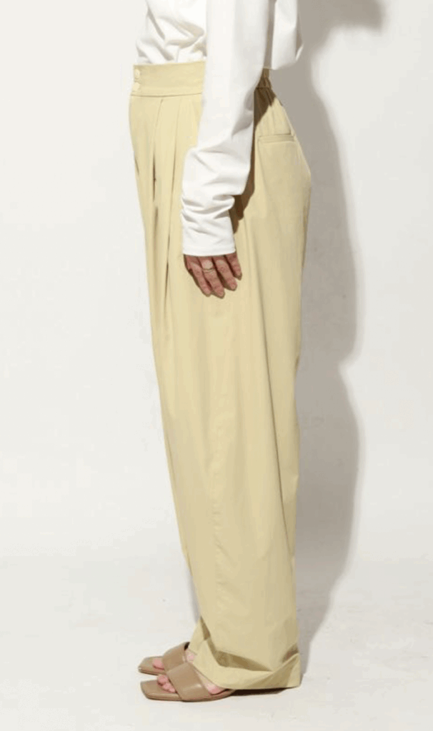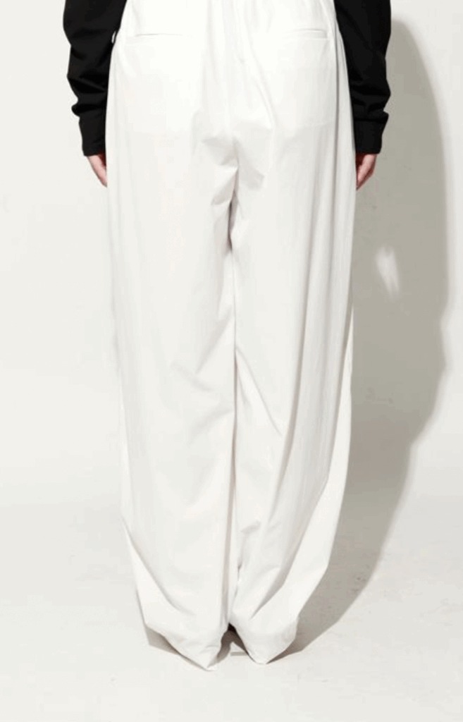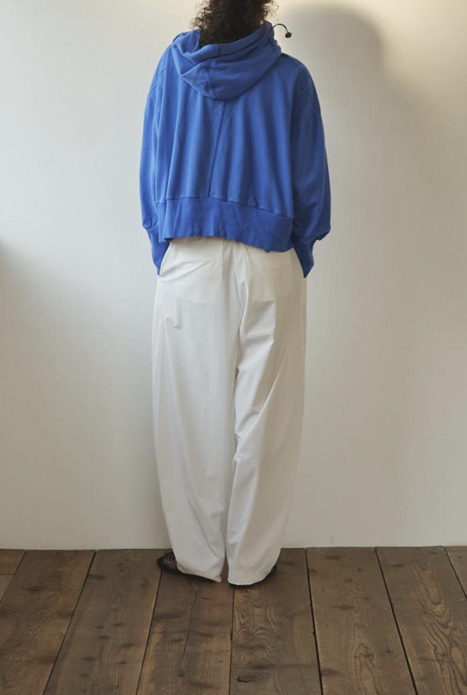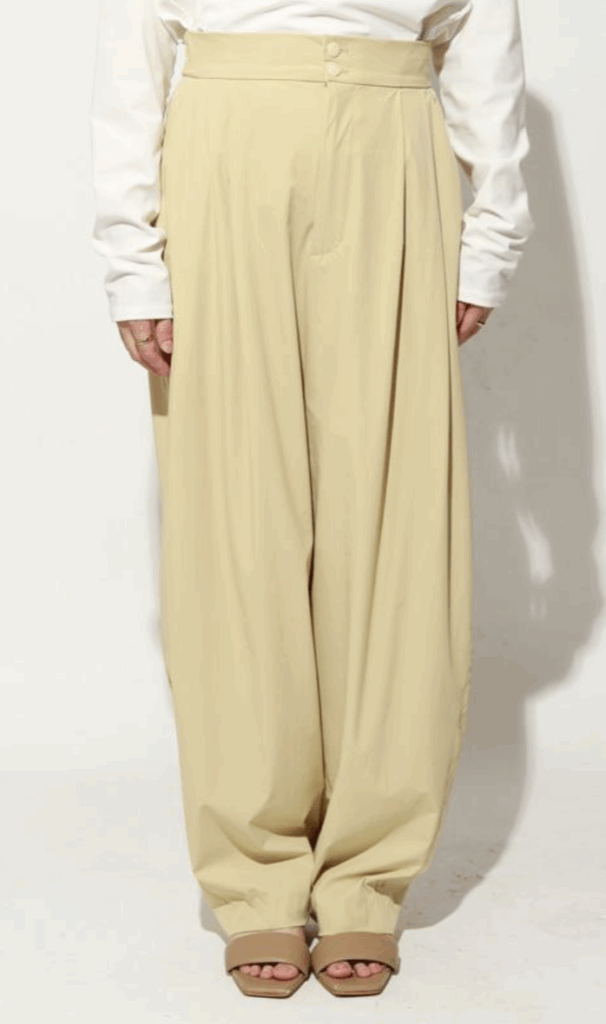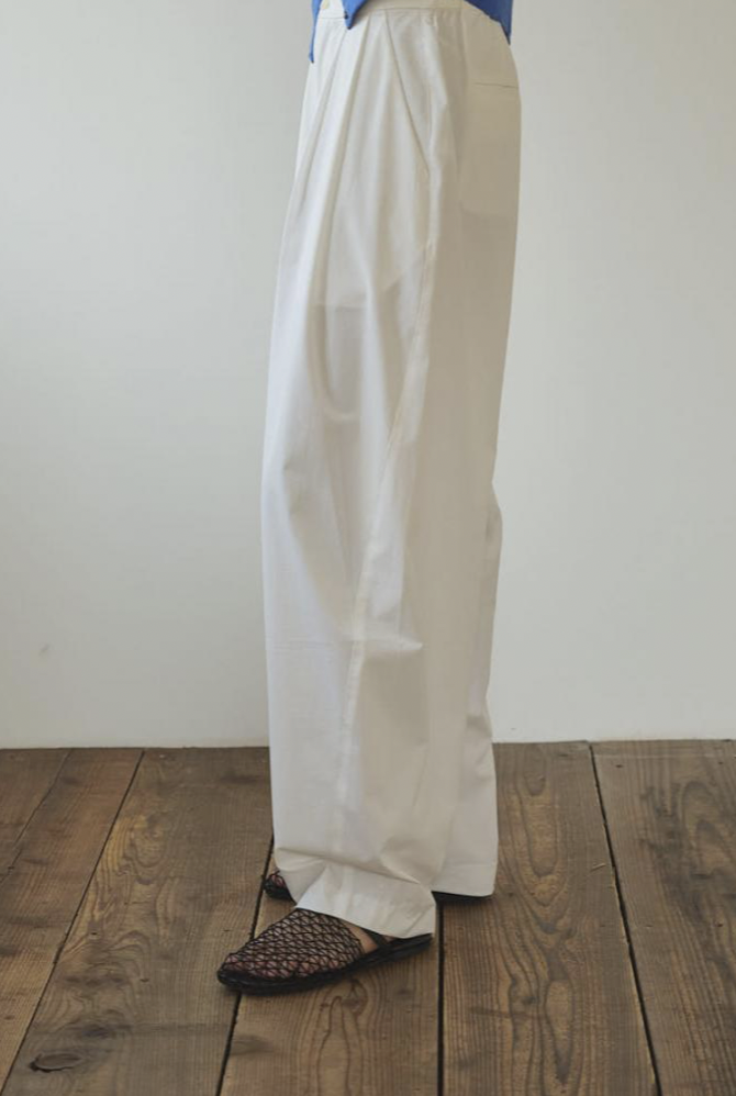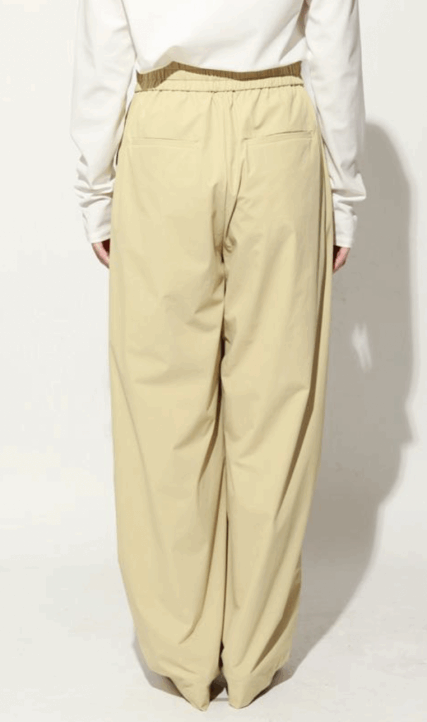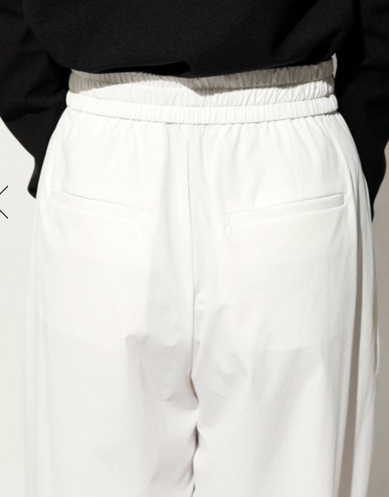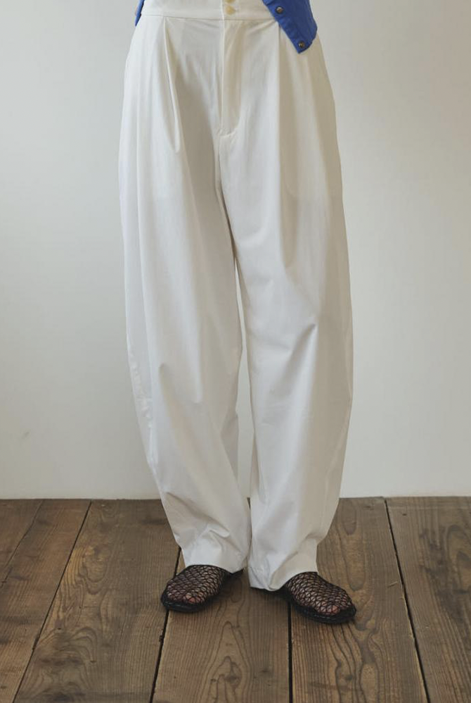 ゆったりとした腰周りから裾にかけて緩やかに絞られたテーパードラインが魅力。