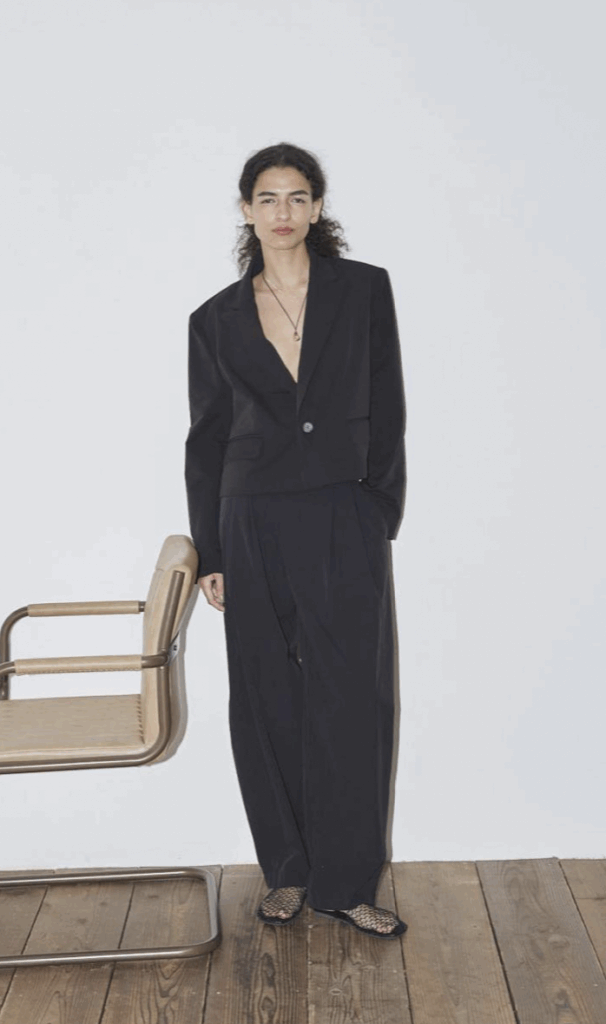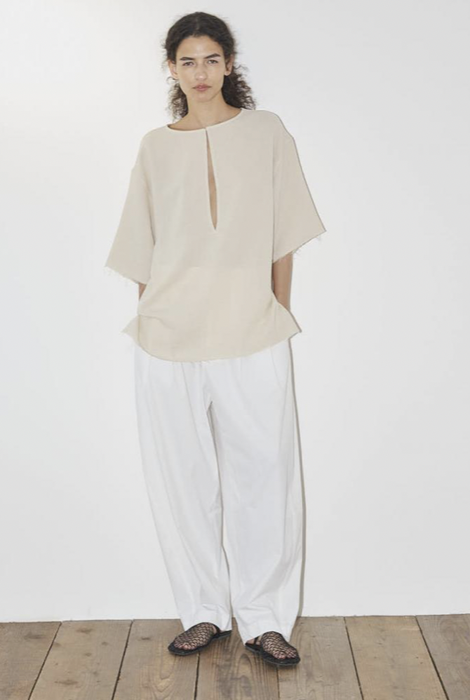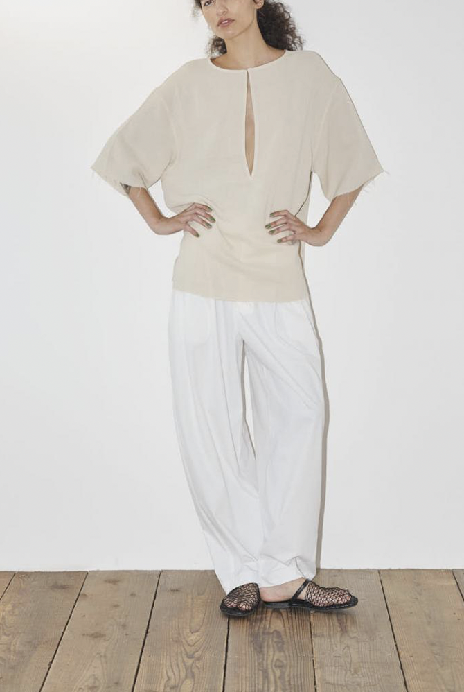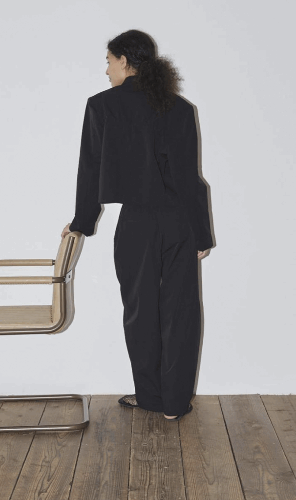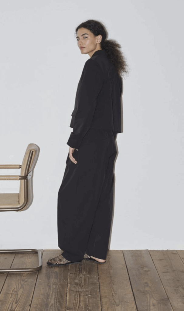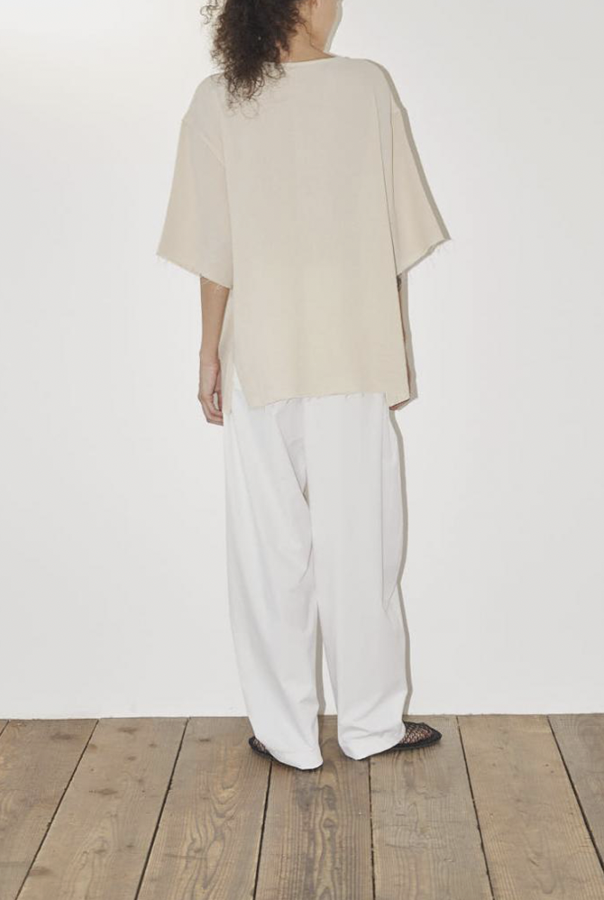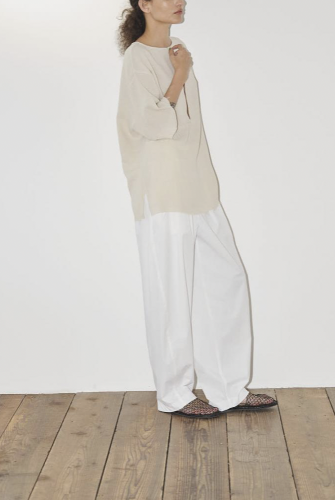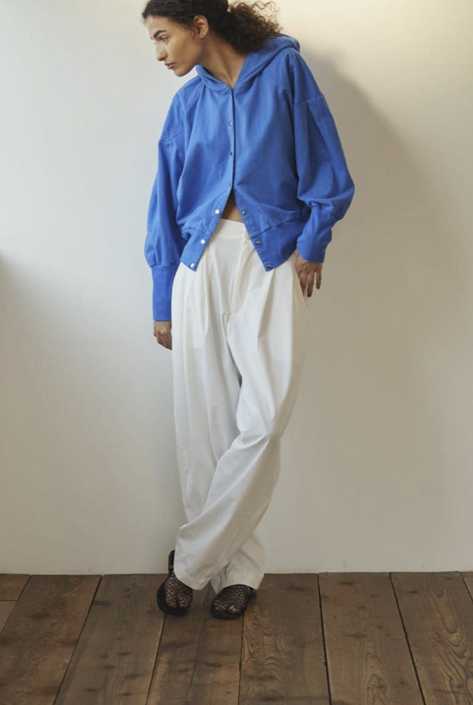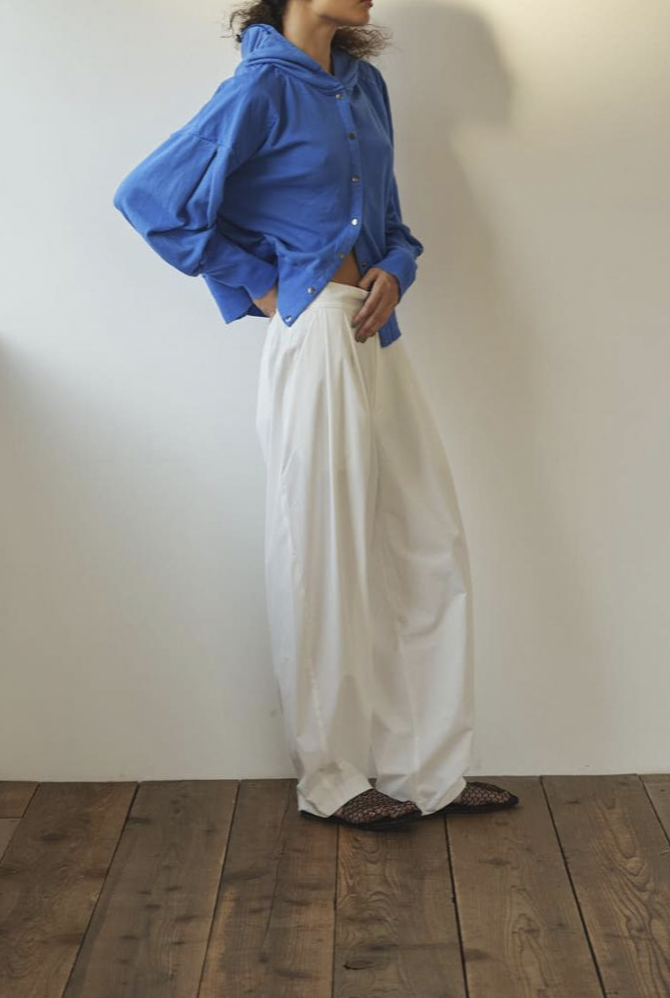 ゆったりとした腰周りから裾にかけて緩やかに絞られたテーパードラインが魅力。