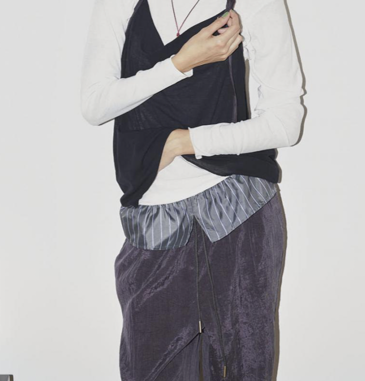 別布を見せてコンパクトなトップスをインすれば、ウエストデザインが主役のモードな着こなしに。