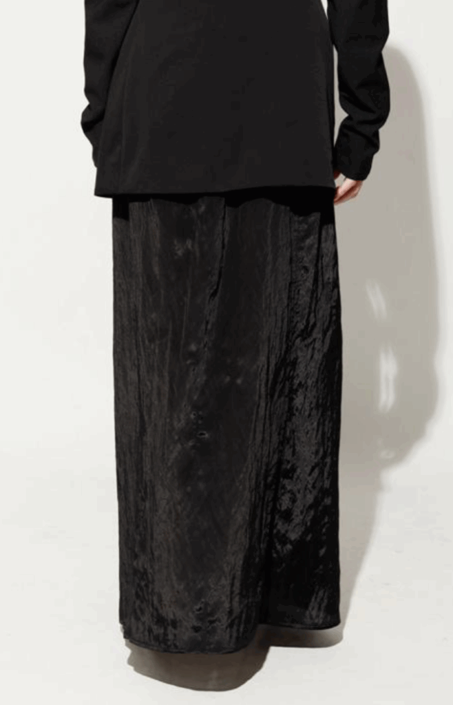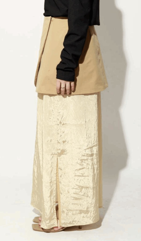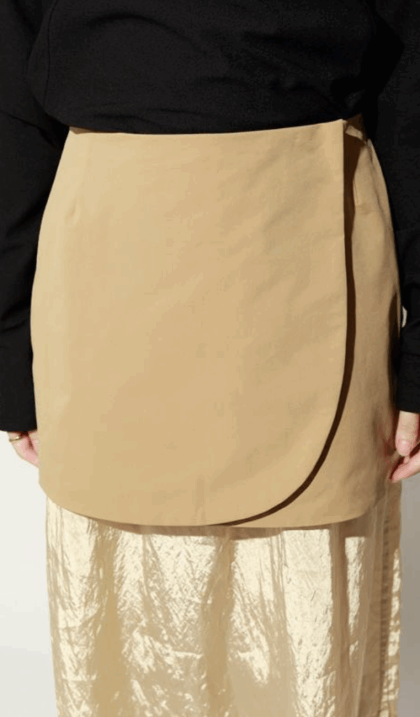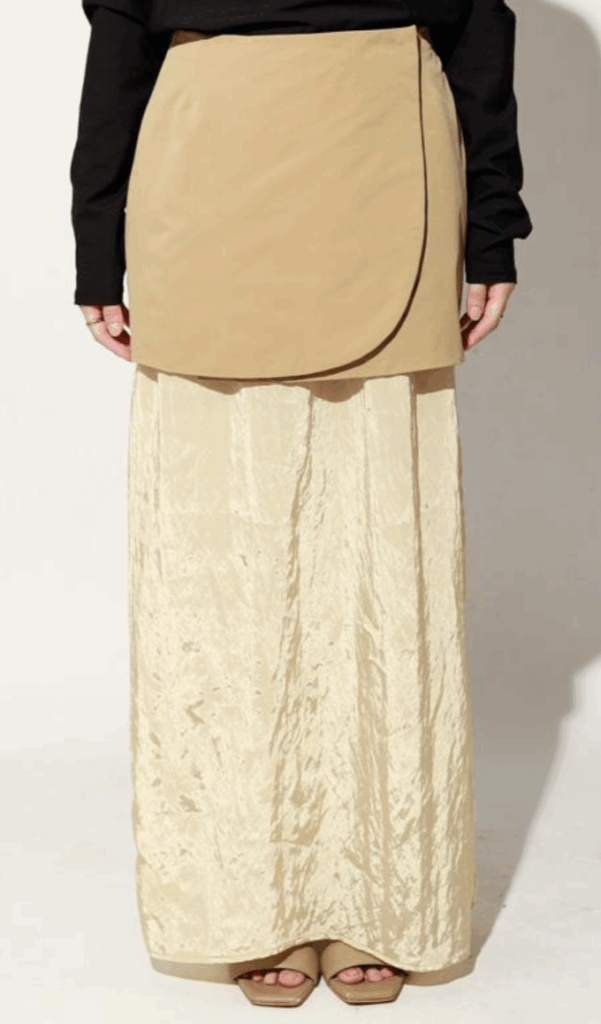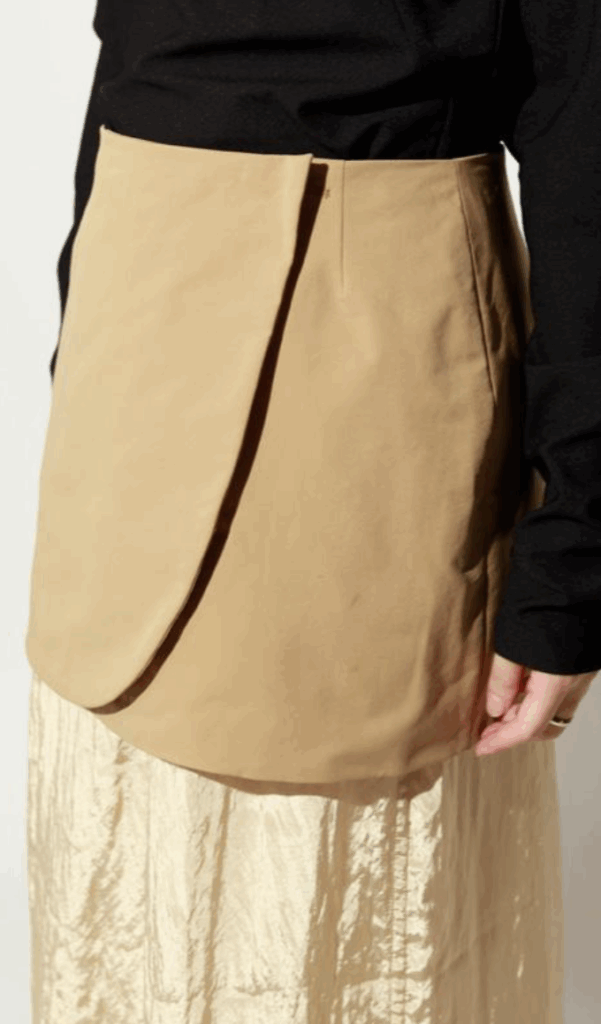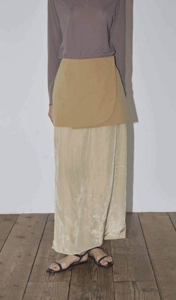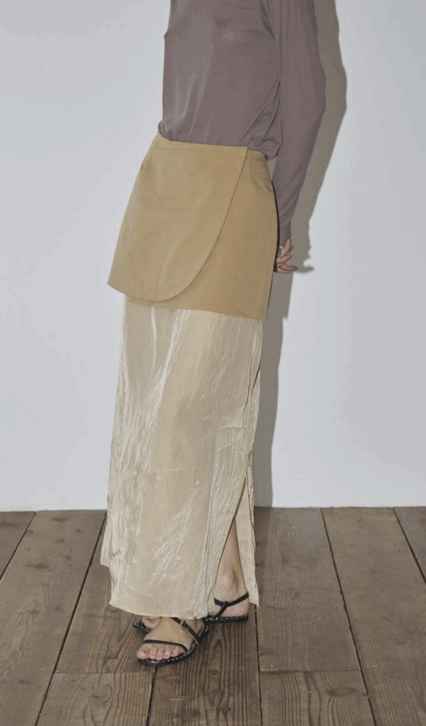 上層は上品な表面感、下層はシアー素材で軽やかに揺れ、動くたびに優雅な表情を見せる、二枚重ねで仕立てたデザインスカート。