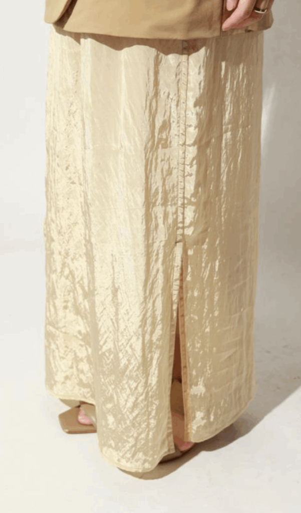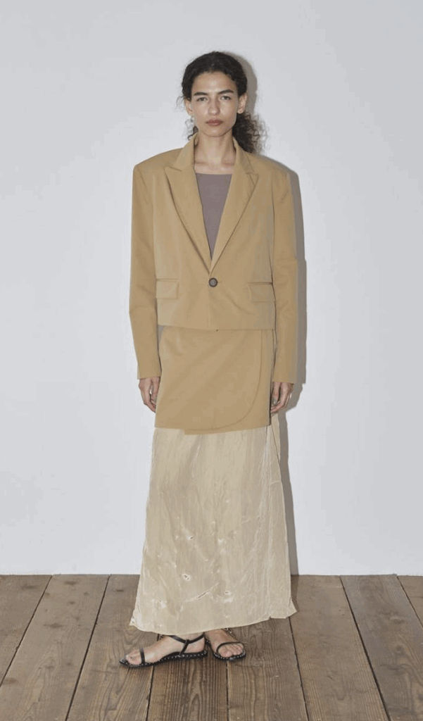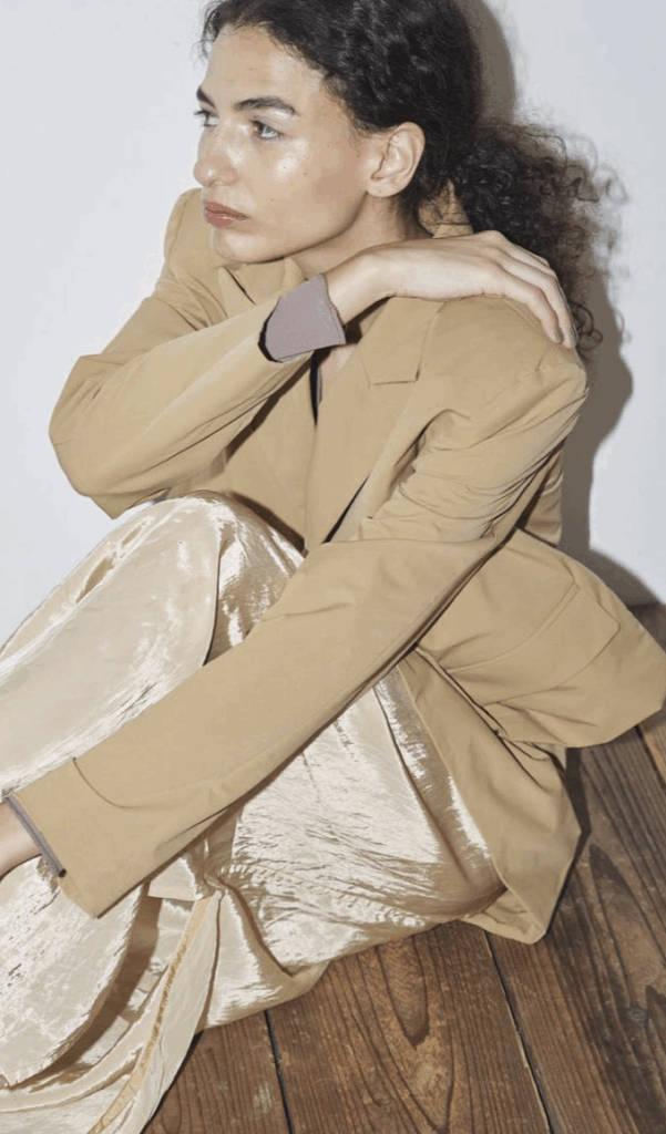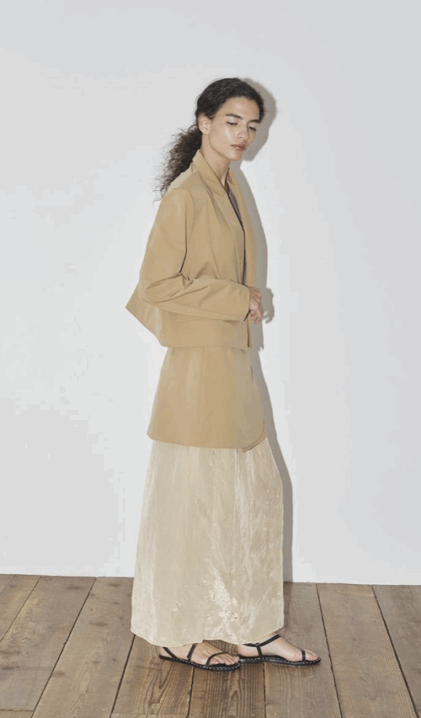 肩パット入りトップスと合わせれば、セットアップでも単品でも上品で旬のスタイリングを楽しめます。
