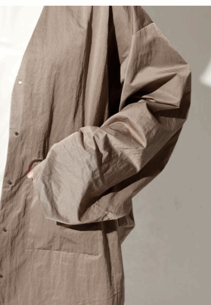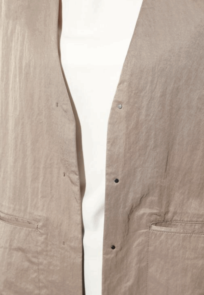 フロントは隠しドットボタン仕様で、無駄をそぎ落としたミニマルなデザインが際立つ一着です。