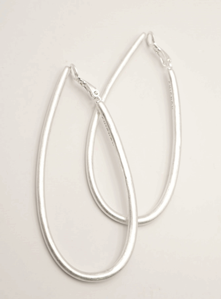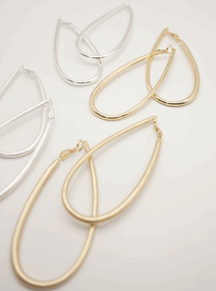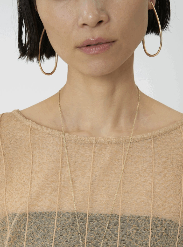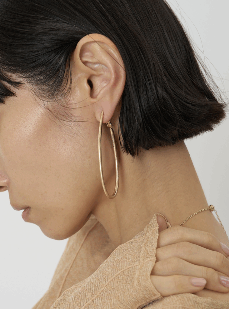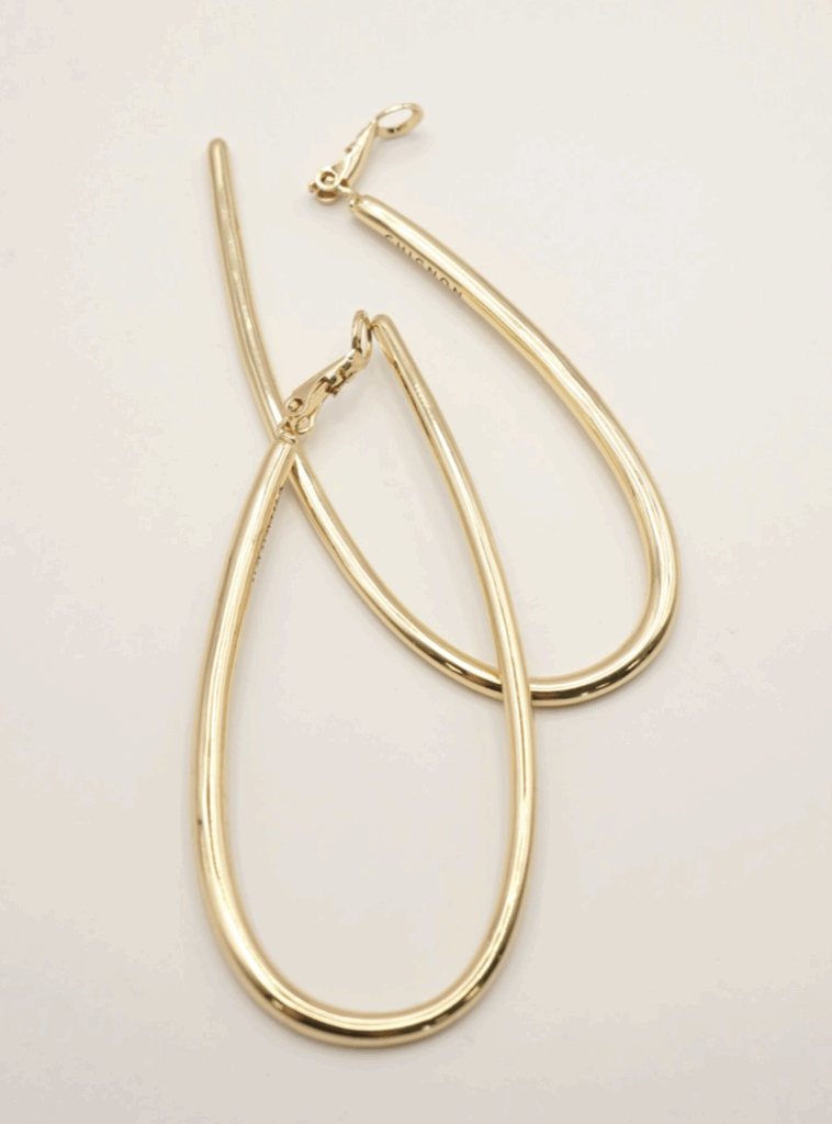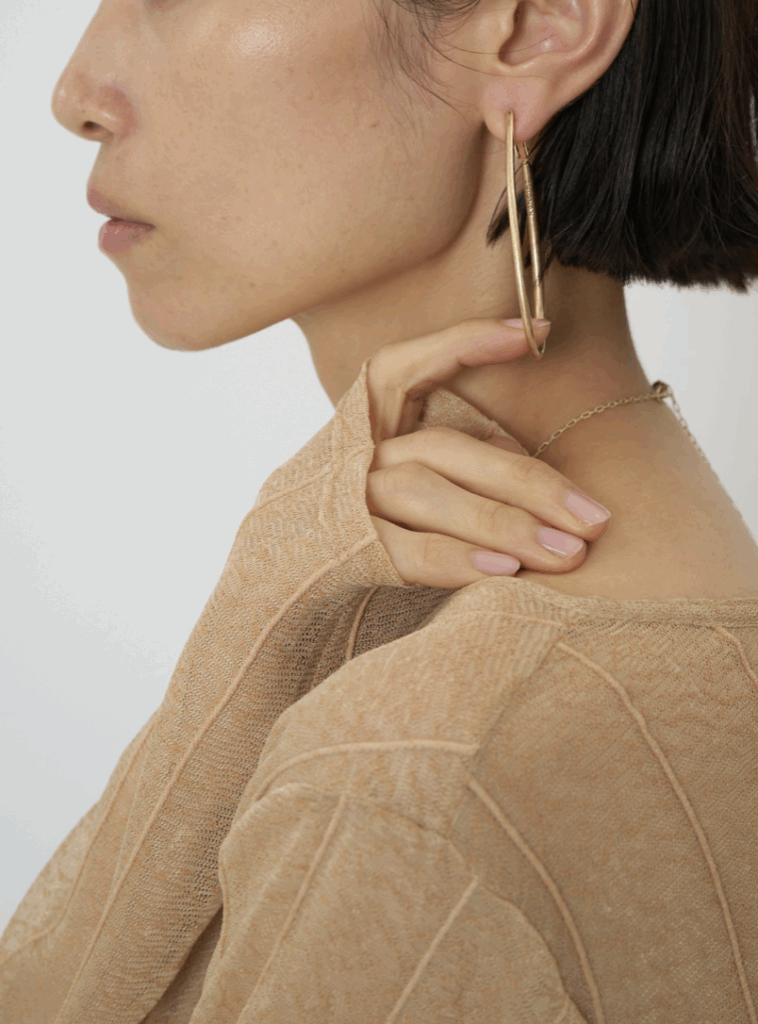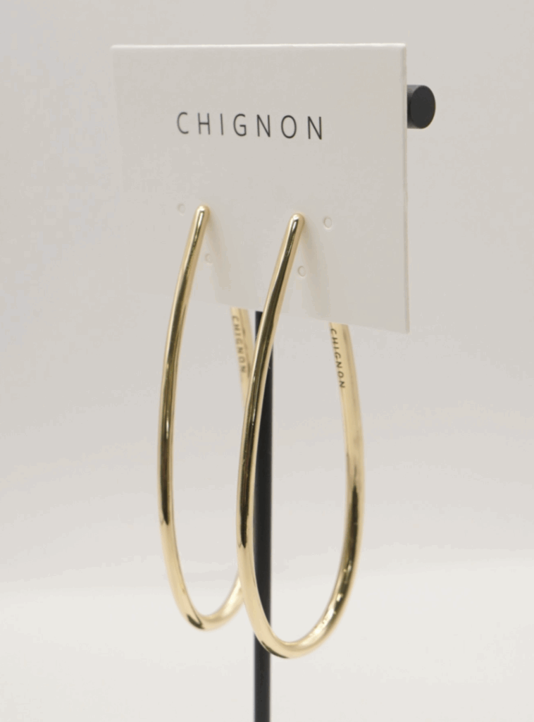 ドロップ型の大振りフープイヤリングは、前から見るとピアスをつけているようなシンプルな仕様にしています。線径の太さを箇所によって少しずつ変えているので単調になりすぎず&独特なニュアンス感が出過ぎないようにスッキリしたデザインに仕上げています。大振りなサイズなので小顔効果も◎背面内側には「CHIGNON」の刻印入り。同型ピアスもご用意いたしております。