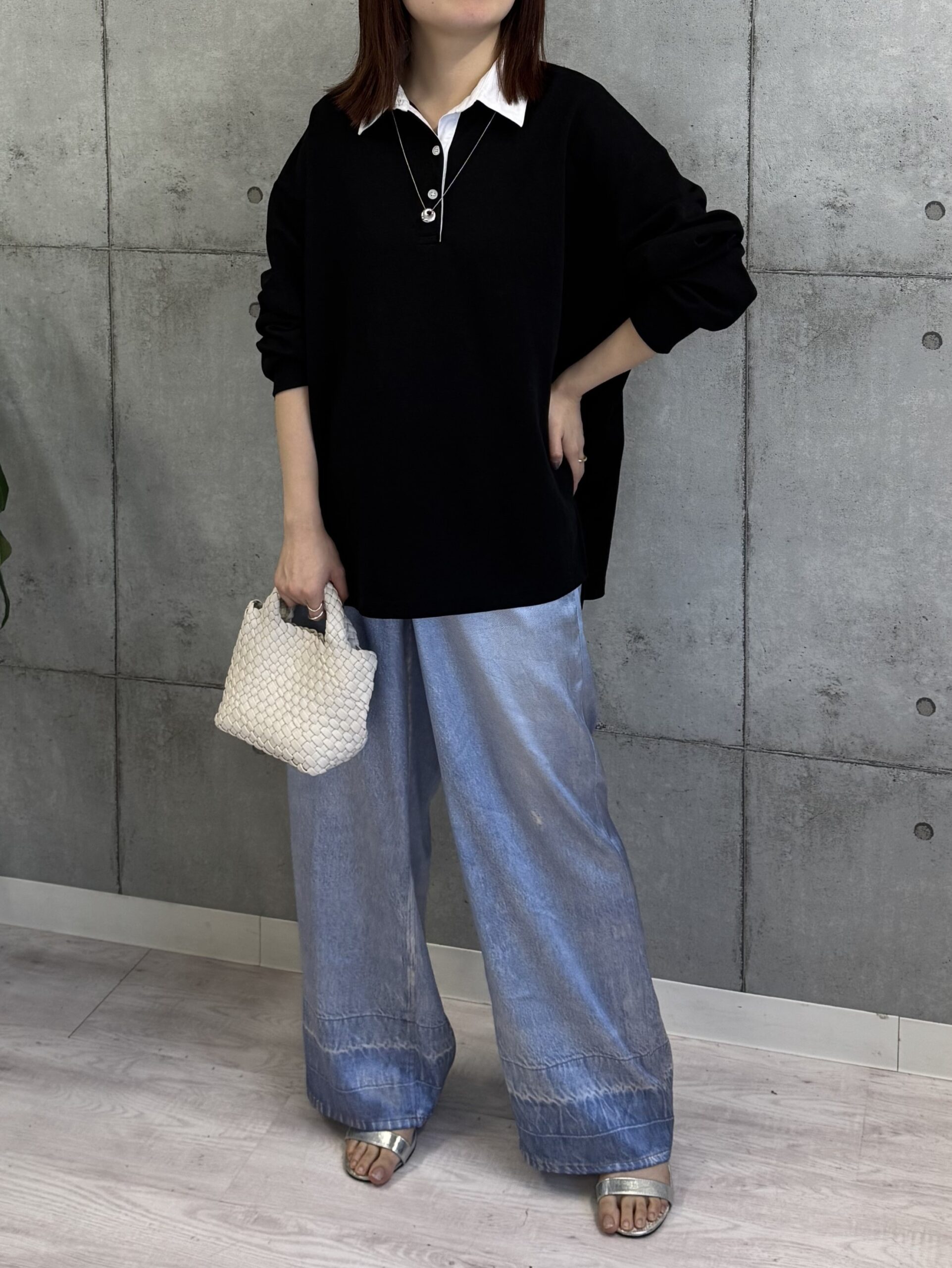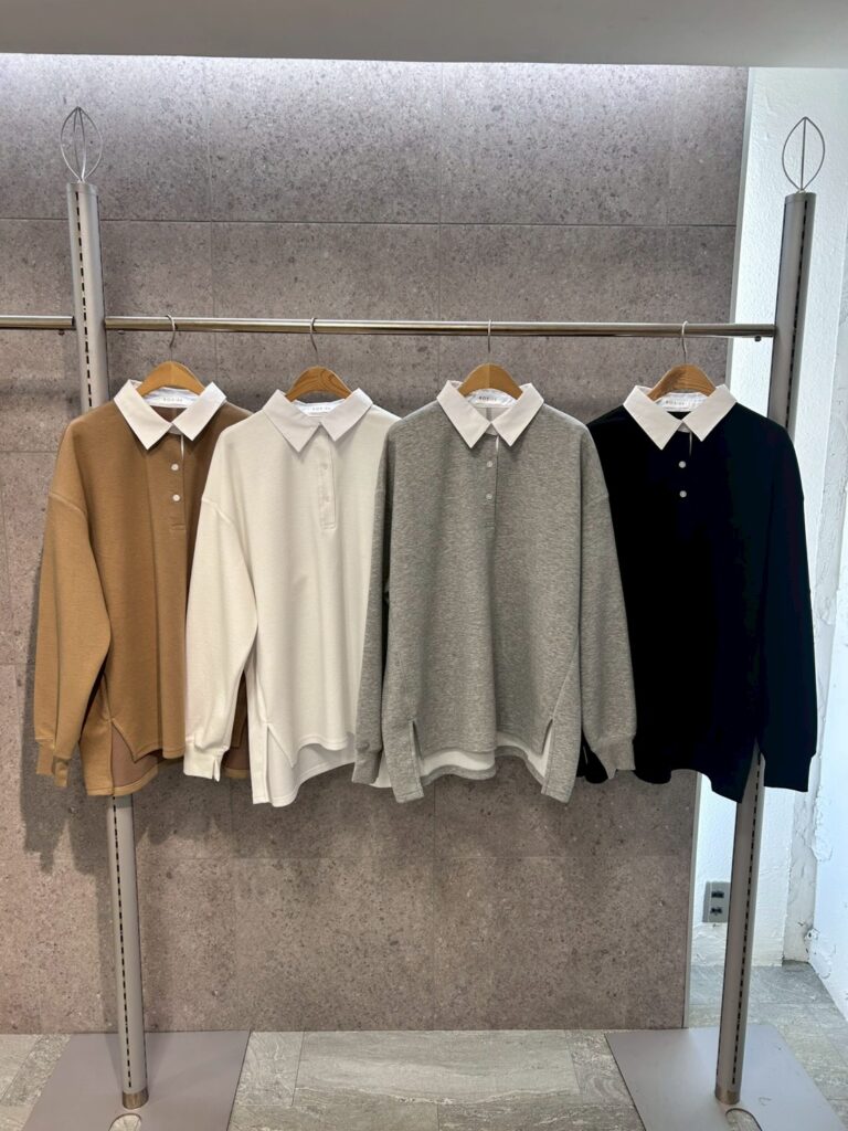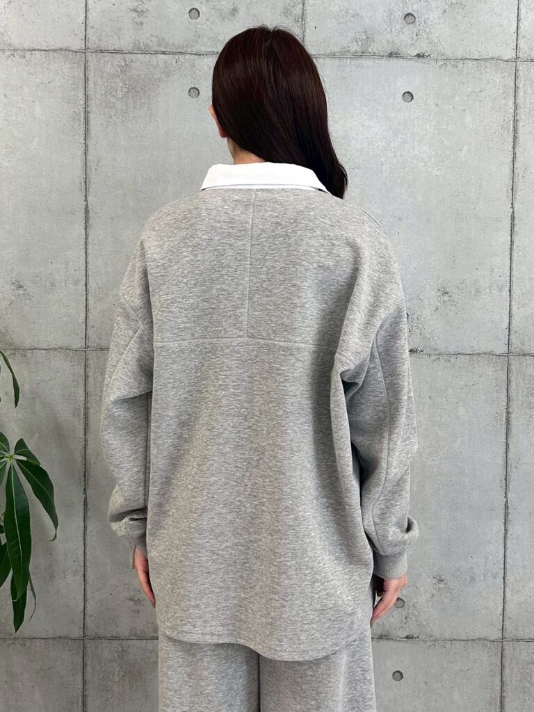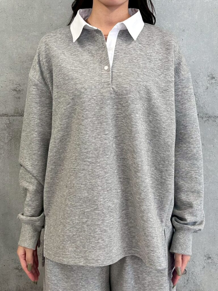 衿付きスウェットトップス。トレンド感のあるポロネックデザインが目を引く衿付きスウェット。衿のバイカラーが程よいアクセントになり、1枚でこなれた印象に仕上がります。ゆったりとしたシルエットで体型カバーも叶い、抜け感のあるリラックススタイルを楽しめるアイテムです。