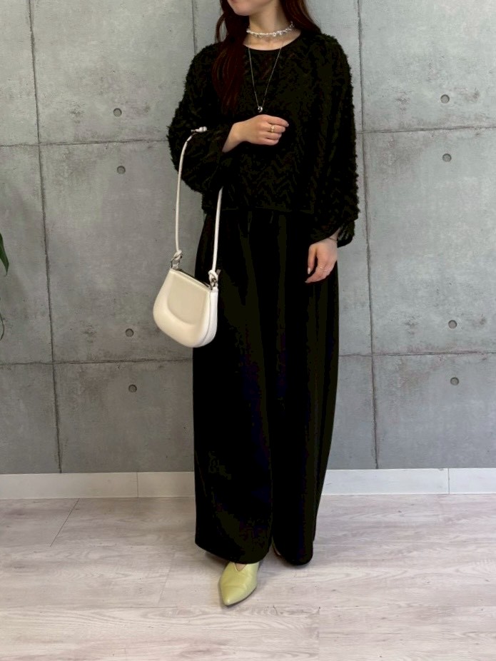 シックな柄で取り入れやすく、フリンジ部分の立体感が一枚で華やかさをプラス。