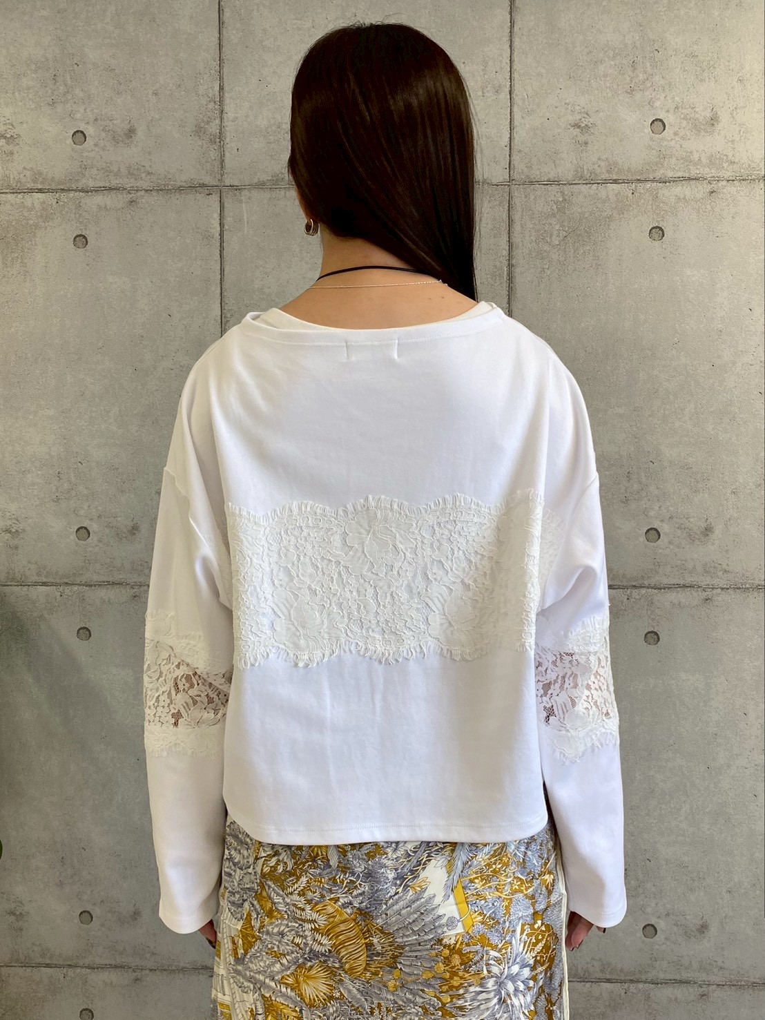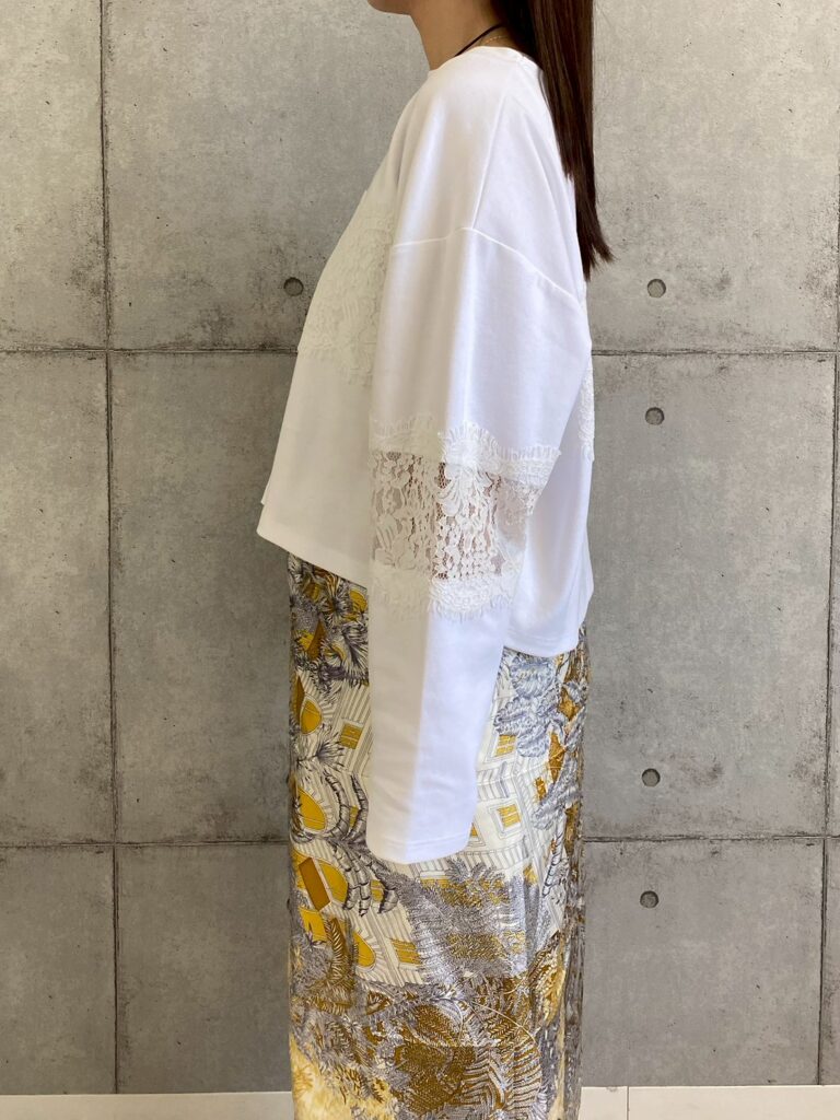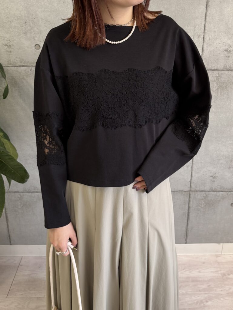 レース切り替えトップス。上品な印象を与えるカットソー素材に、存在感のあるレースを身頃と袖にドッキングした華やかなデザイントップス。