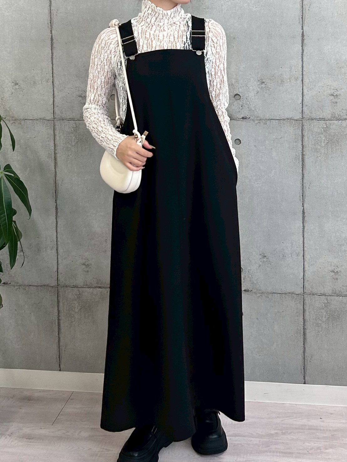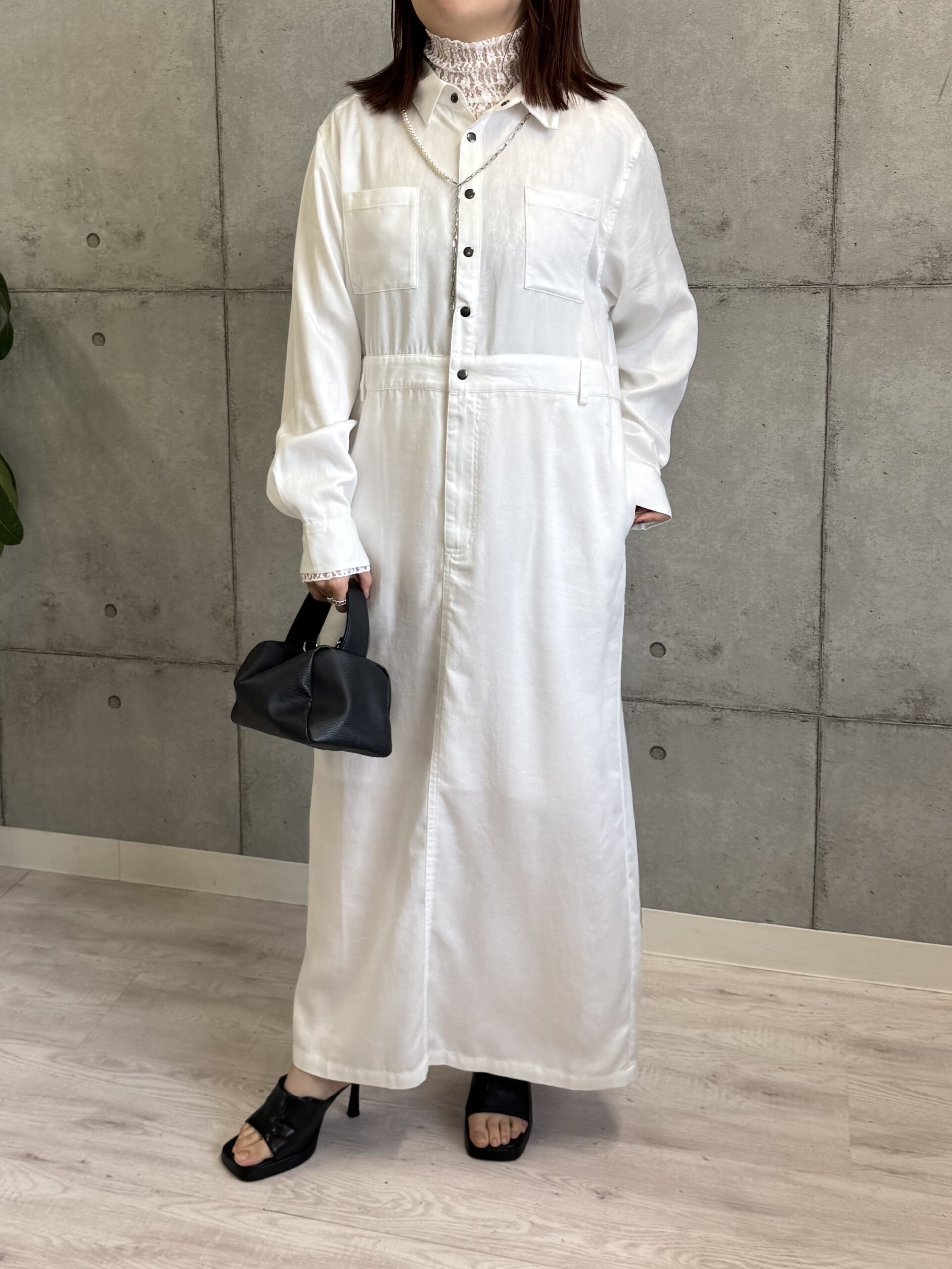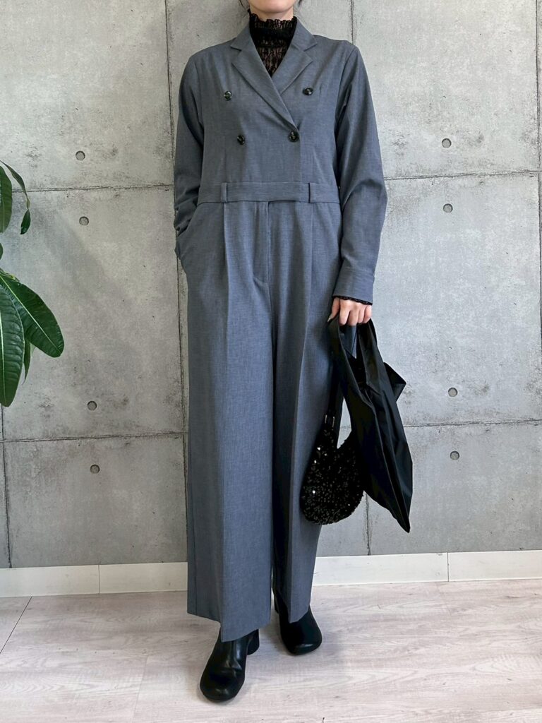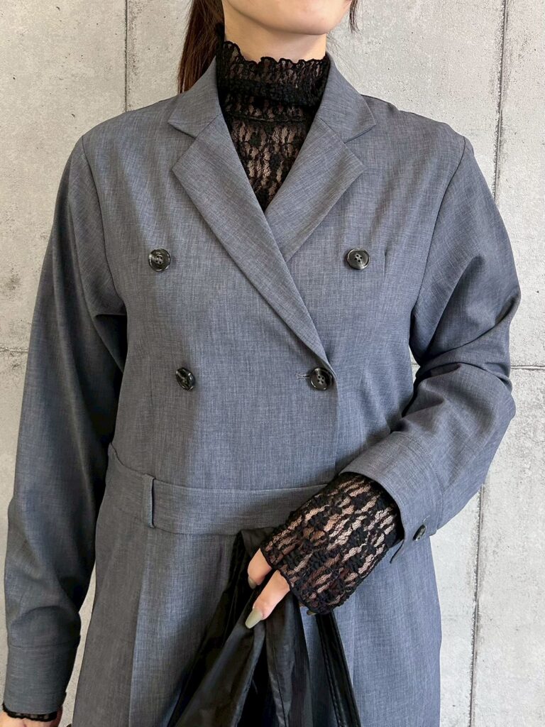 首回りまで包み込むデザインでモードで女性らしい印象に。