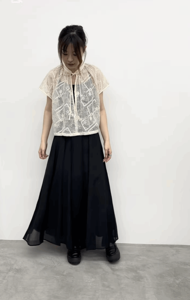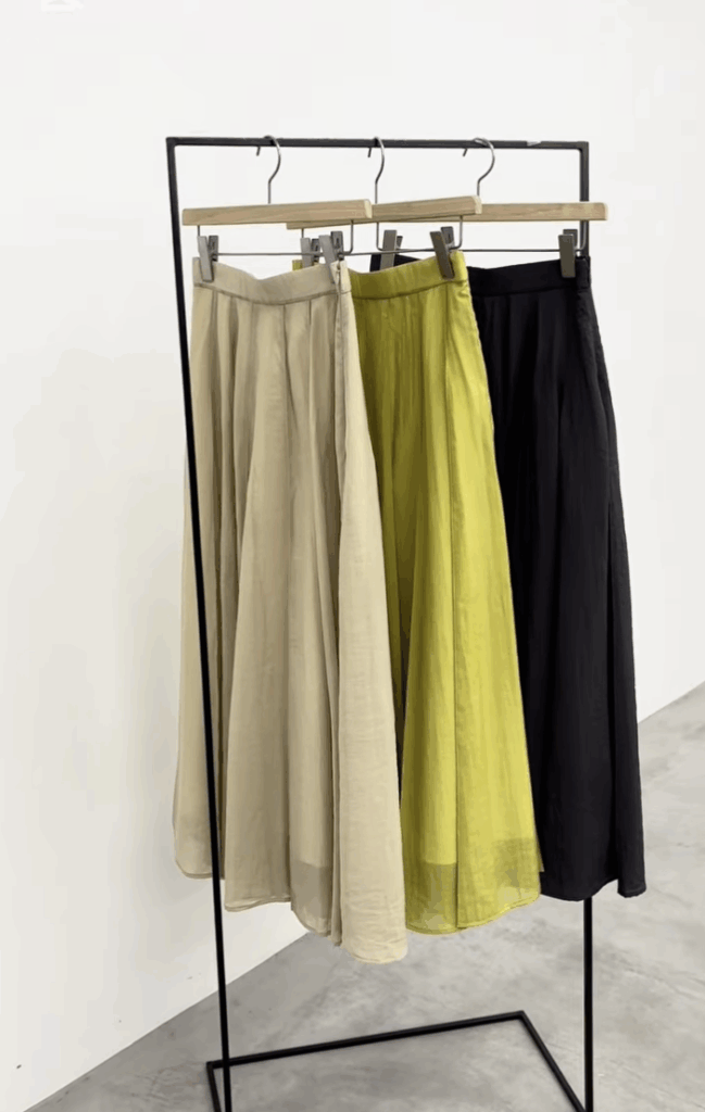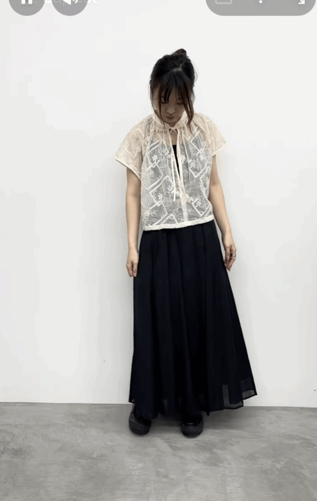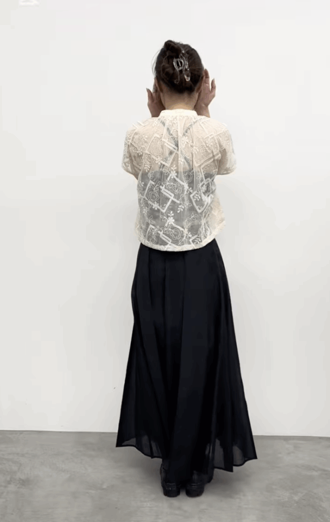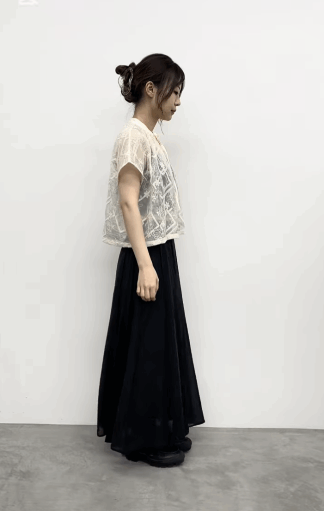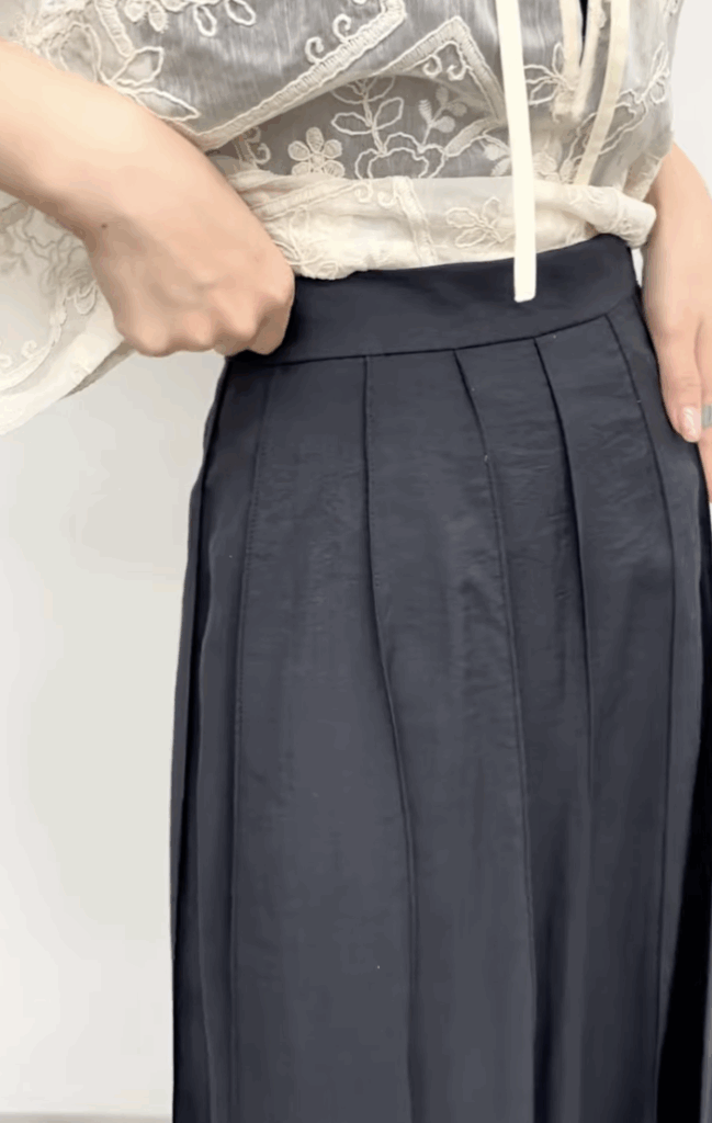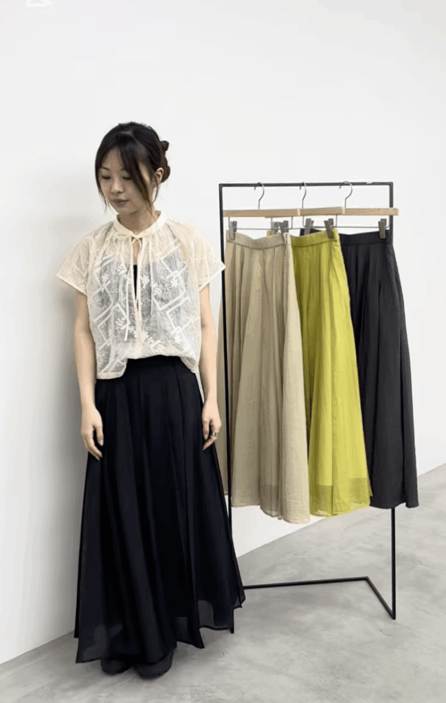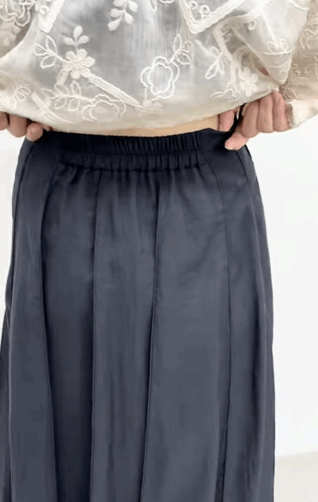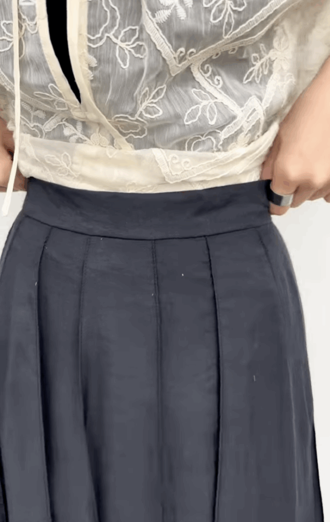 全部で14パーツで縦ラインが強調されスッキリした見え方をしています。動いた時のドレープや揺れがすごく綺麗で、つなぎ合わせたところはつまみステッチを入れ、膨らみ過ぎず広がり過ぎない絶妙なシルエットのスカートです。