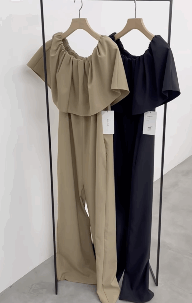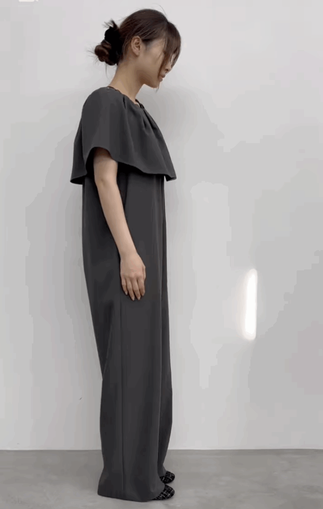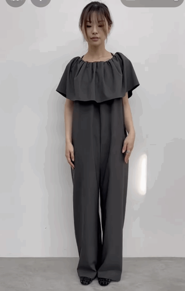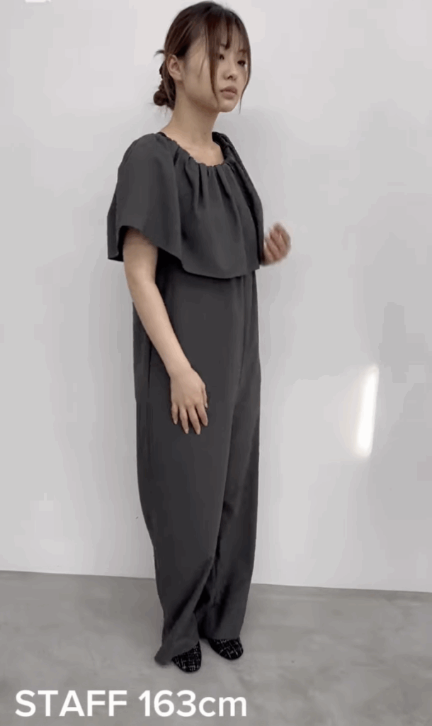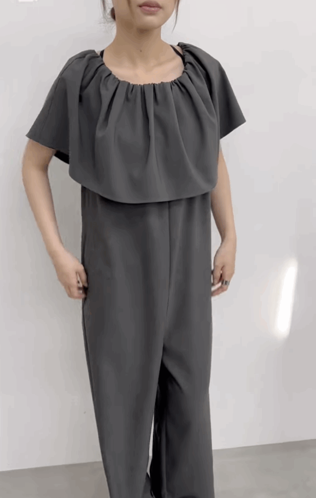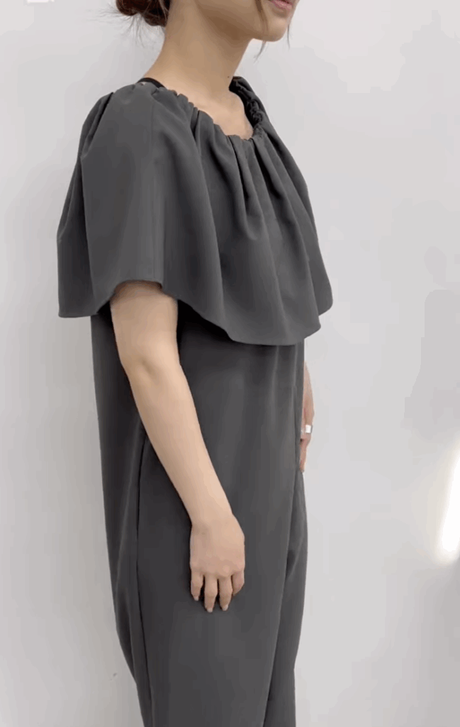 襟元の大きめラッフルがポイントのオールインワンです。着脱は襟元のゴム開きから簡単に着用でき、シワがつきにくい素材なので、楽ちん感がありながらもトレンド感もあるアイテムです。
