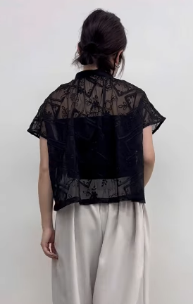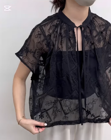 シアー素材に刺繍が施された生地を使用したフレンチスリーブのブラウスです。肩にかかる袖感とゆったりとしたサイズ感でコンパクトながらゆったりと楽に着用いただけます。