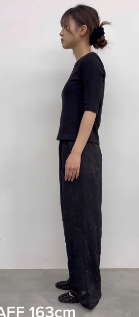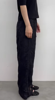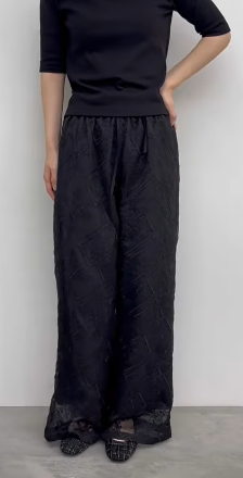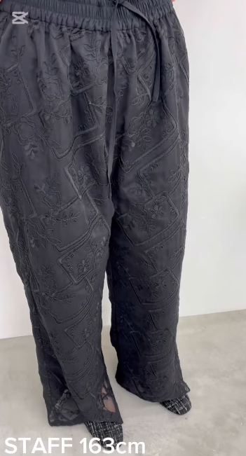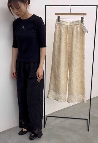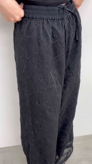 シアー素材に刺繍が施された生地を使用したワイドパンツです。肩にかかるウエストはゴムギャザー仕様でベルト同素材のドロストを付けてカジュアルに仕上げました。