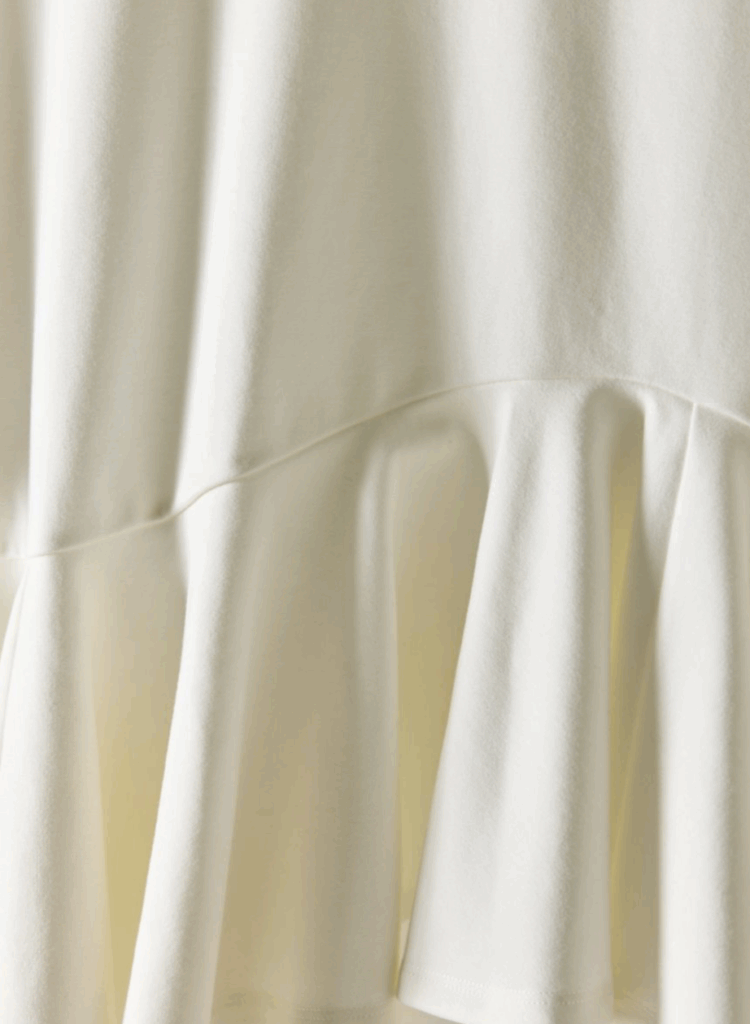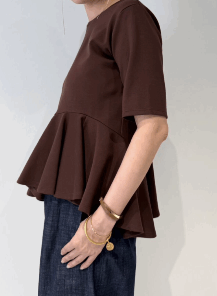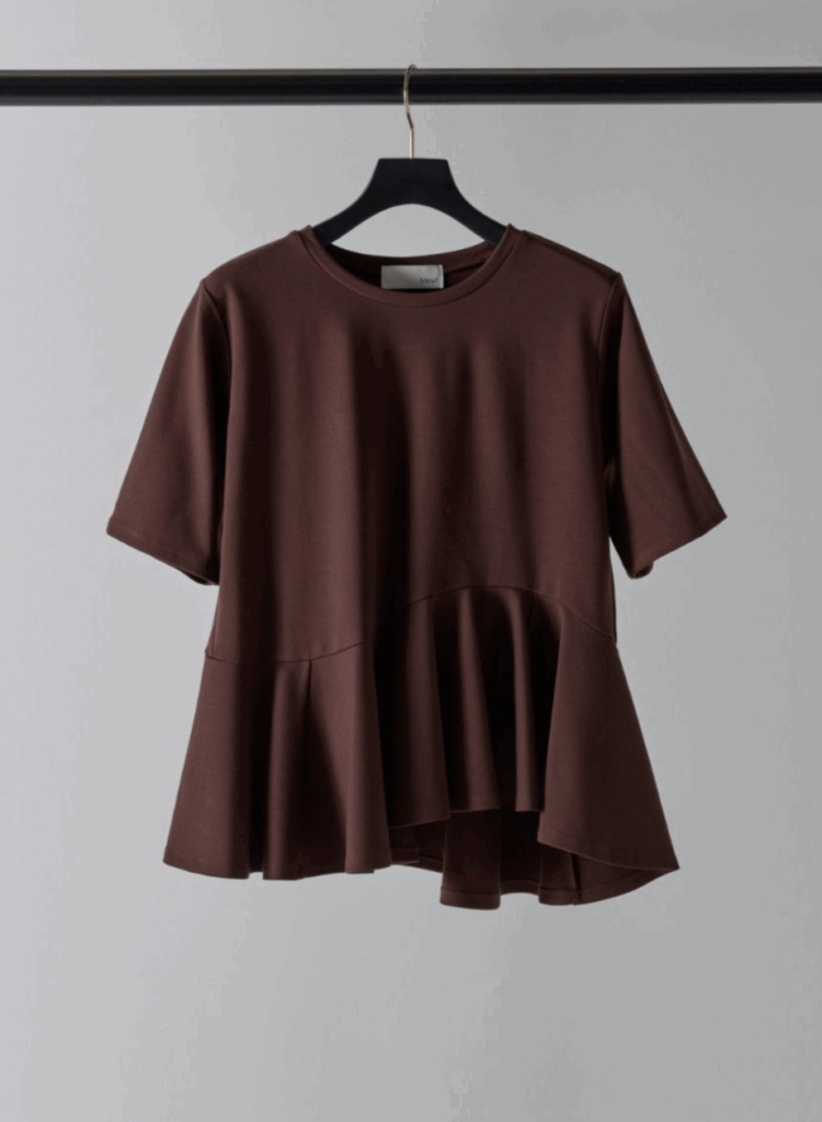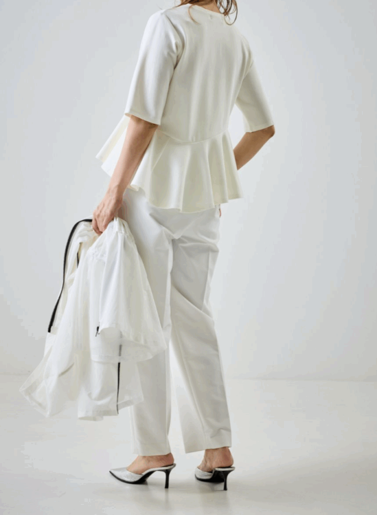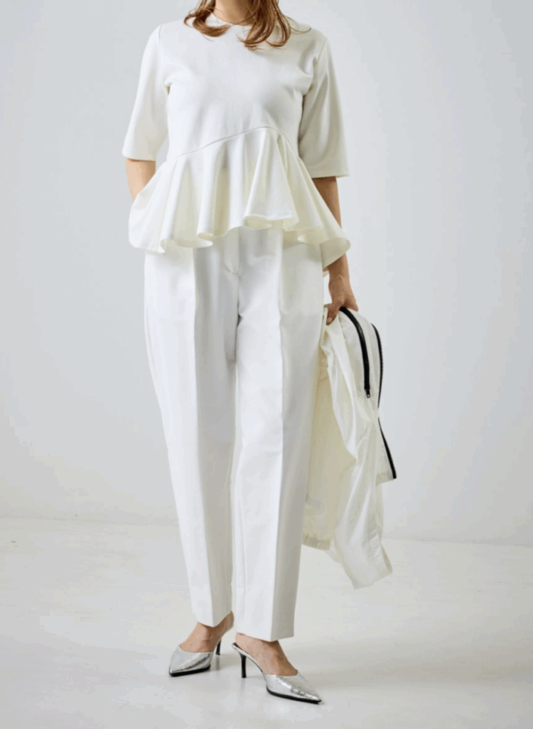 程よいボリューム感と、波打つようなアシンメトリーのペプラムが印象的な薄手ポンチ素材のキレイめカットソー。きちんと感のある表情ながら、伸びやかな着心地でデイリーに取り入れやすい一枚です。ウエストラインに合わせたペプラム切り替えが自然に視線を上げ、脚をすらりと長く見せてくれるのも嬉しいポイント。キレイめにもカジュアルにも馴染み、オンオフ問わず幅広いシーンで活躍します。マシーンウォッシュ可能でお手入れも簡単。忙しい大人の日常に寄り添う、頼れる主役トップスです。