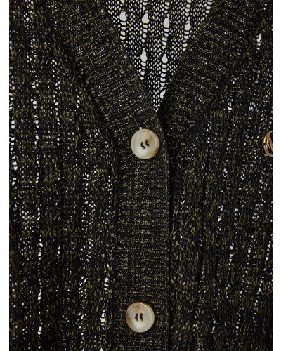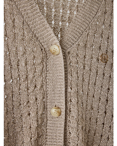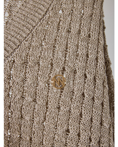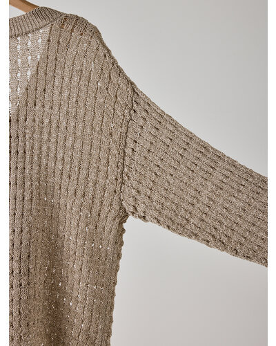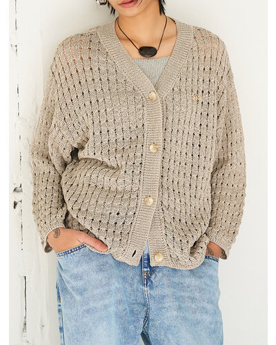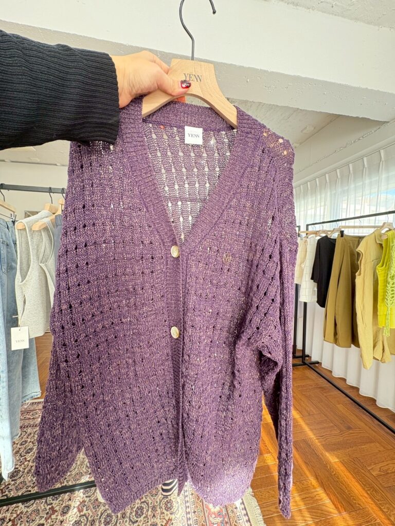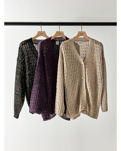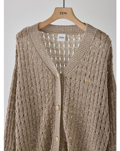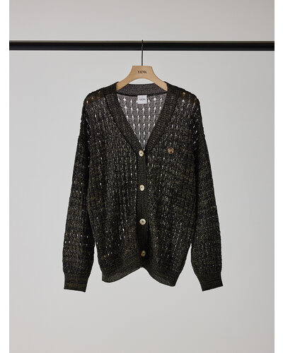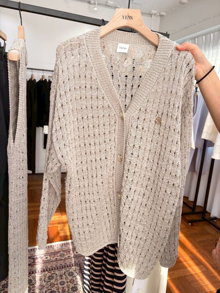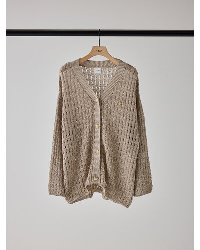 ★ マニッシュな透かし編みを採用したニットカーディガン。風合いの異なる2本の糸を引き揃えることで、独特なシャリ感と清涼感のある着心地を実現しました。微配色の糸使いにより、杢調の奥行きある表情が生まれ、シンプルながら存在感のある一枚に。あえて9分丈に設定した袖丈は、腰巻きや肩掛けなどアレンジもしやすく、スタイリングの幅を広げてくれます。胸元にはYENNの金属チャームをあしらい、さりげなく価値観を高めた仕上がりです。