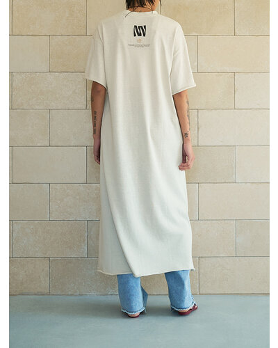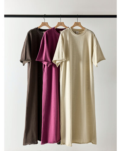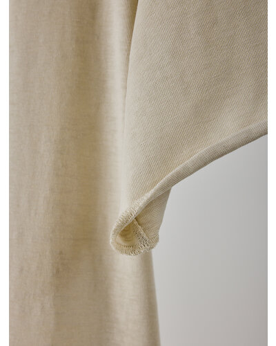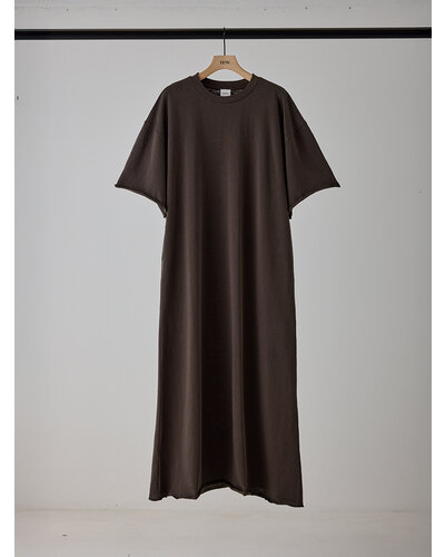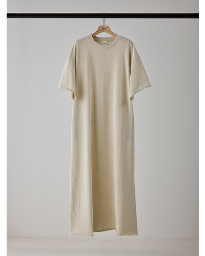 ダブル編みでも軽さがあり、夏にぴったりのイージーケアなカットソー素材を使用した、オーバーサイズのTシャツをそのままワンピースにしたようなデザインです。 袖口と裾の端はロック始末であえて簡易に仕上げてカジュアル感をプラス。