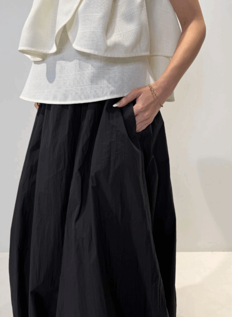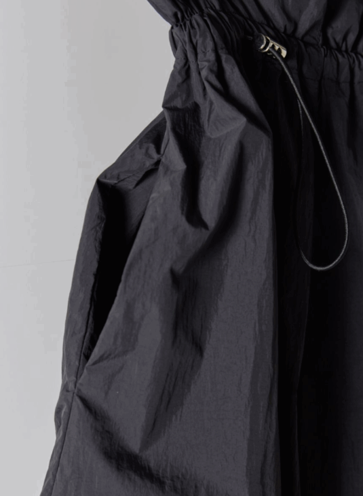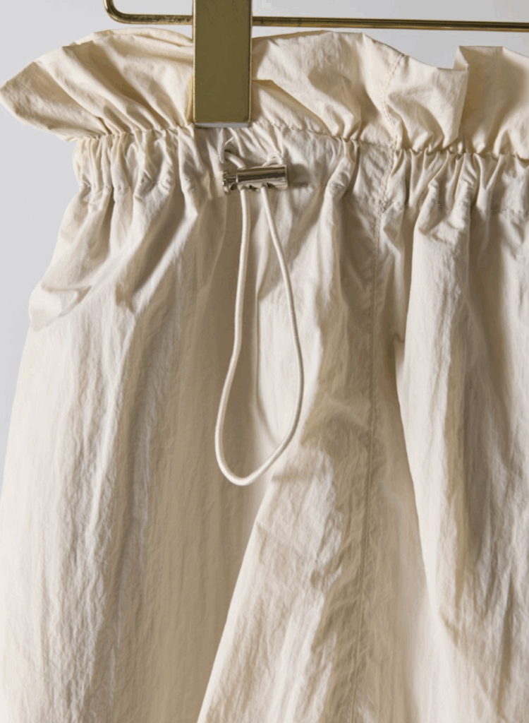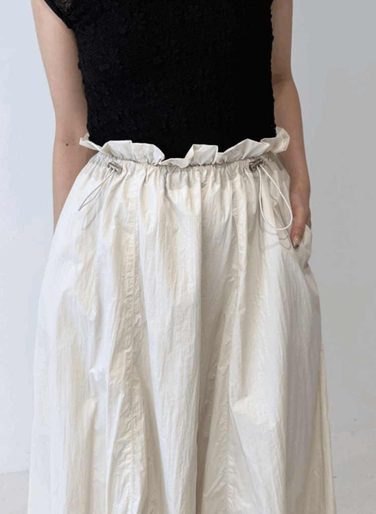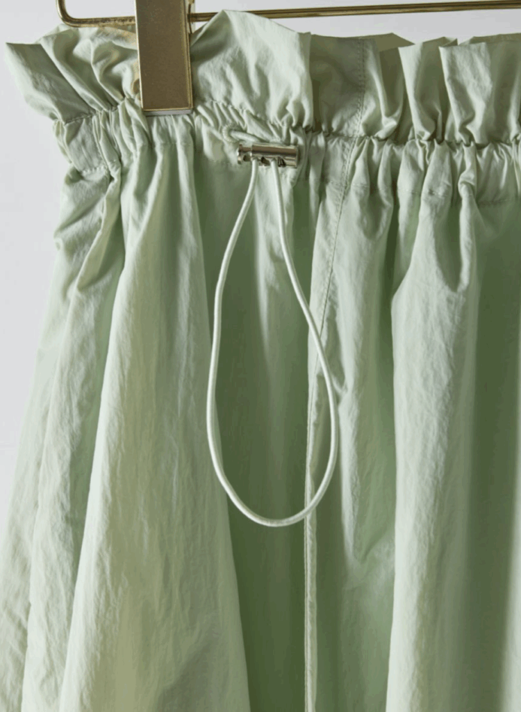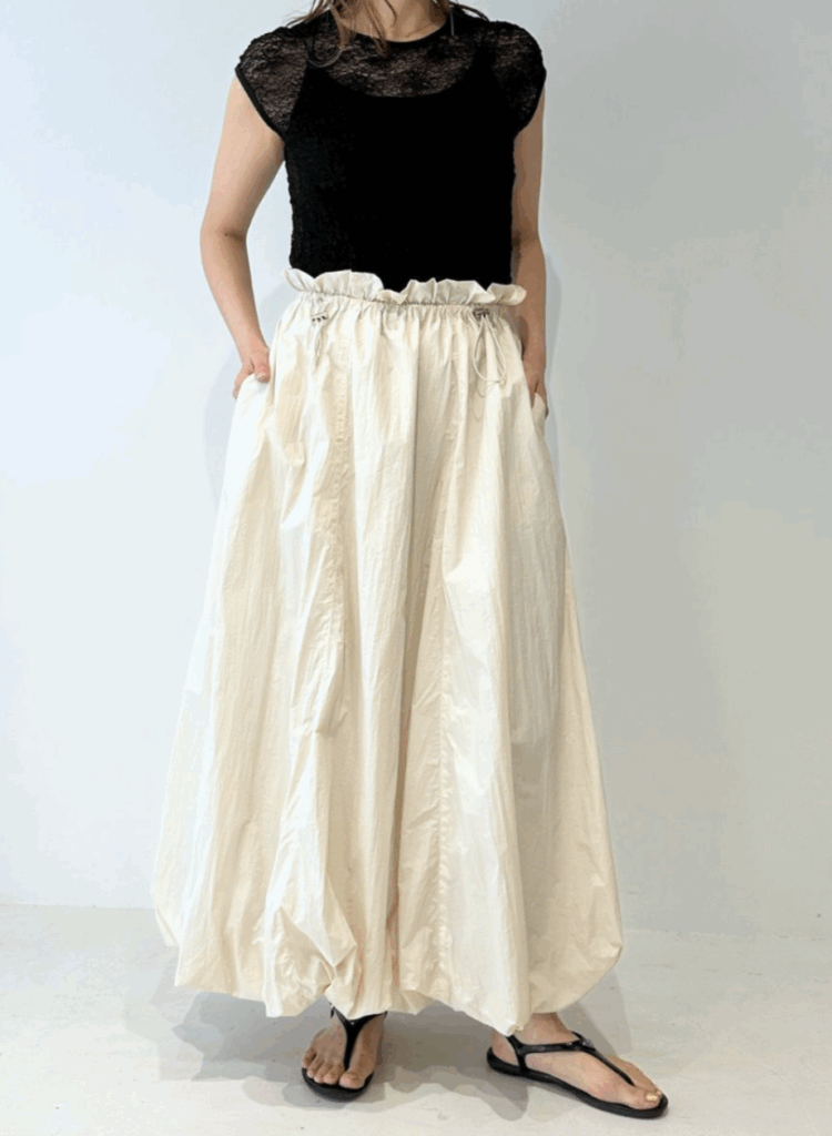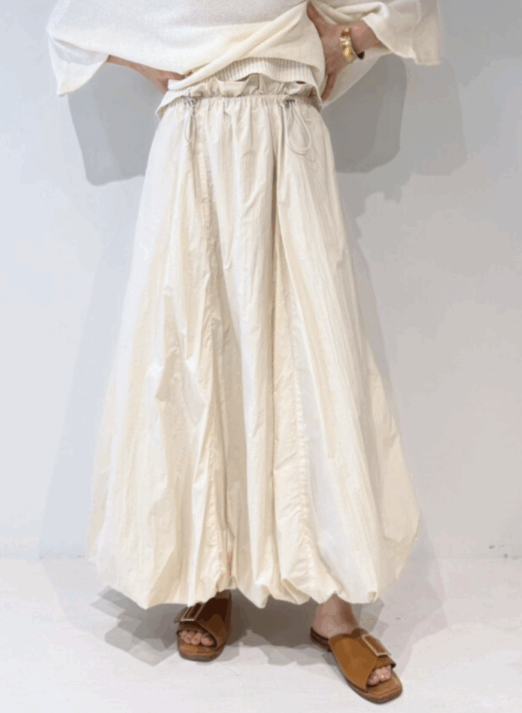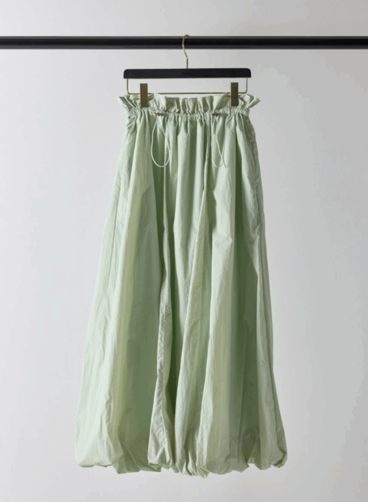 軽やかなナイロン素材を使用し、ふんわりとした立体感が印象的なバルーンスカート。ウエストはドローストリング仕様でサイズ調整ができ、締め付け感のないストレスフリーな穿き心地を叶えます。縦の切り替えラインを入れることで、トップスをインした際もすっきりと見え、自然にスタイルアップ。バルーン裾には伸縮性を持たせ、ボリュームがありながらも足さばきの良さをキープしました。ポケット付きで実用性も高く、デイリーからお出かけまで活躍する、大人のための軽やかスカートです。