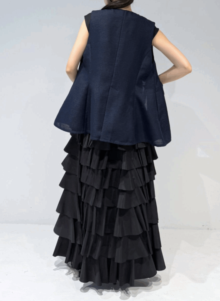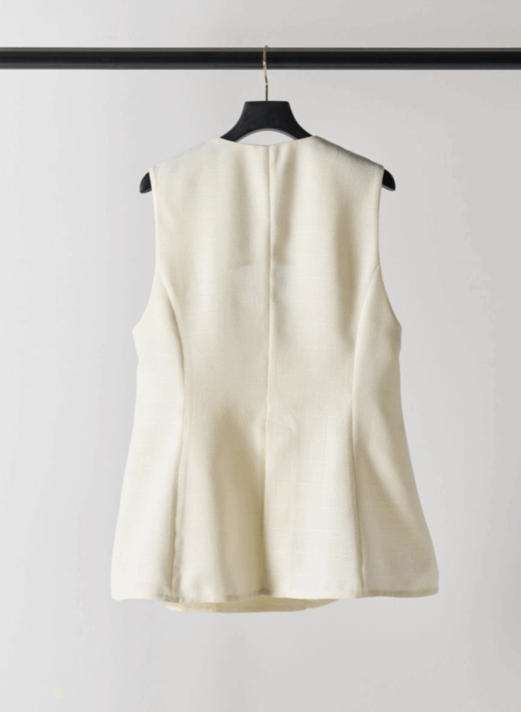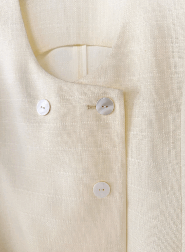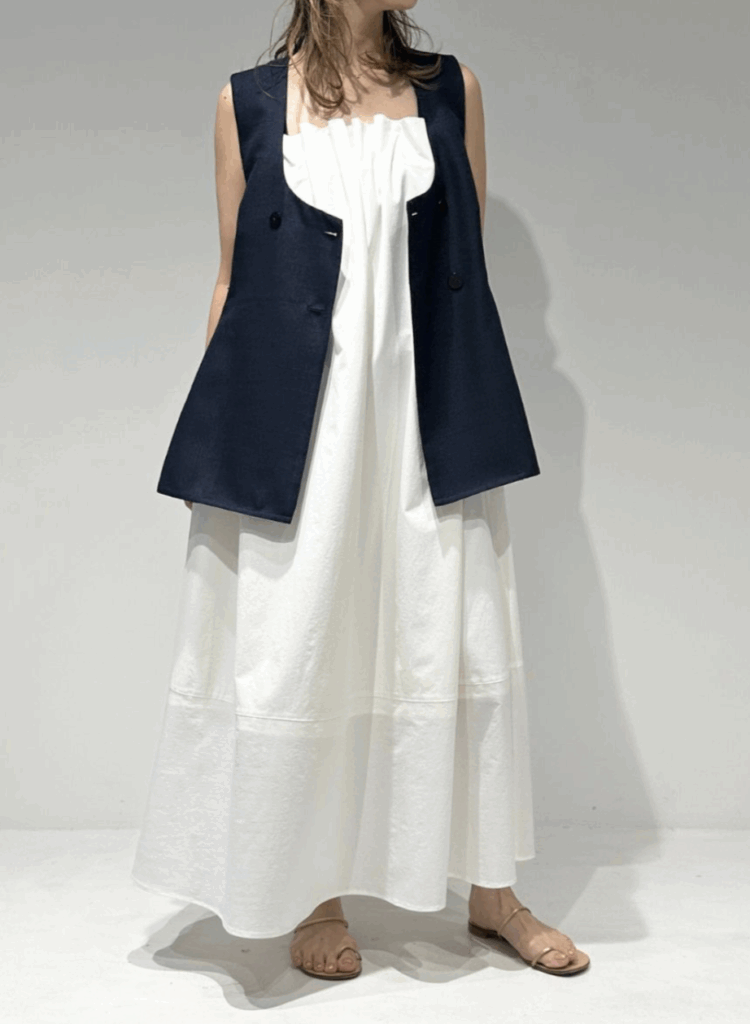 ワントーンで織り上げた、表情豊かなスクエア調サマーツイード素材のジレ。立体感のある生地がシンプルな装いにも奥行きを与え、上品な存在感を放ちます。大きめのUネックが程よいやわらかさと抜け感を演出し、ジレ特有のかたさを抑えた印象に。裾にかけてほんのりフレアを効かせることで、柔らかなシルエットを描きながら下半身をすっきりと見せてくれます。フラットな貝調ボタンがモードなアクセントとなり、ポケット付きで実用性も備えています。同素材シリーズのパンツと合わせたセットアップスタイルもおすすめの一着です。