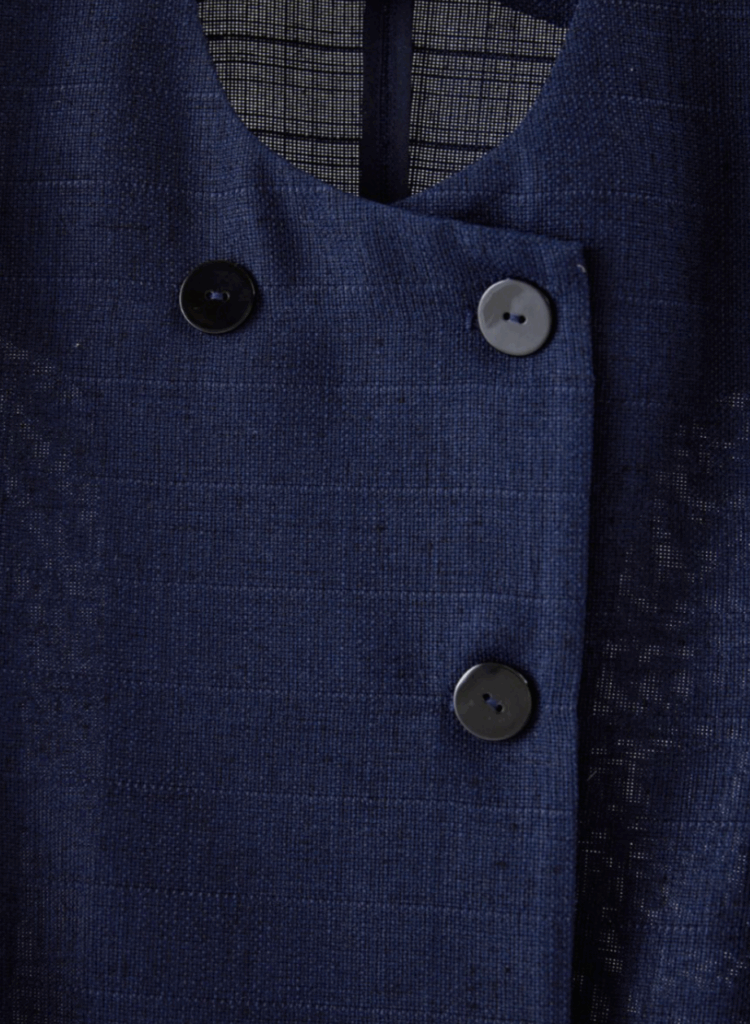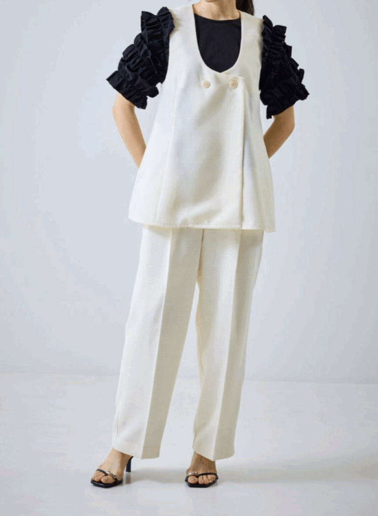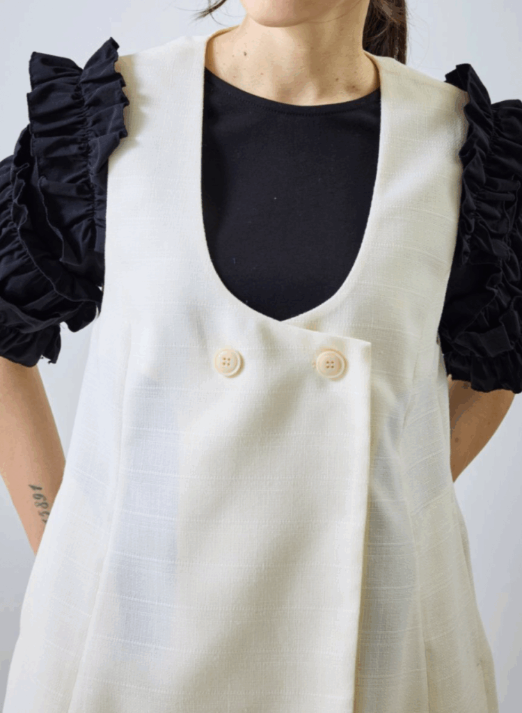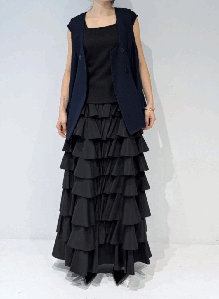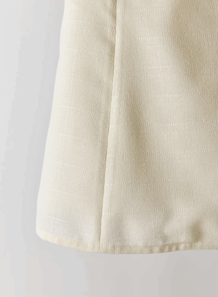 ワントーンで織り上げた、表情豊かなスクエア調サマーツイード素材のジレ。立体感のある生地がシンプルな装いにも奥行きを与え、上品な存在感を放ちます。大きめのUネックが程よいやわらかさと抜け感を演出し、ジレ特有のかたさを抑えた印象に。裾にかけてほんのりフレアを効かせることで、柔らかなシルエットを描きながら下半身をすっきりと見せてくれます。フラットな貝調ボタンがモードなアクセントとなり、ポケット付きで実用性も備えています。同素材シリーズのパンツと合わせたセットアップスタイルもおすすめの一着です。