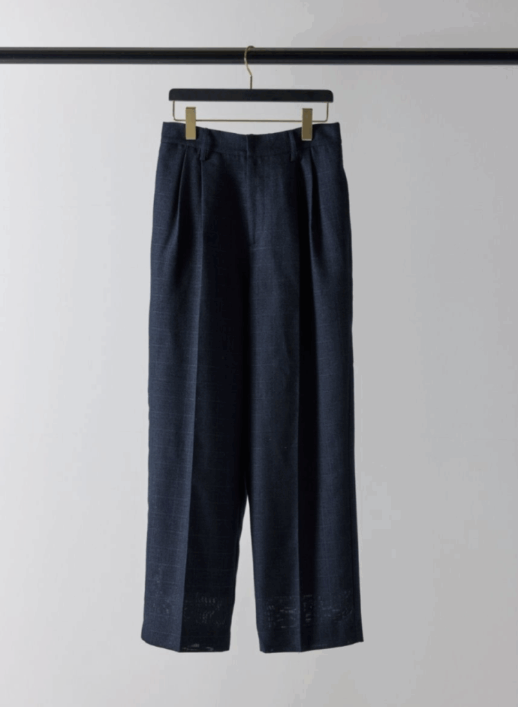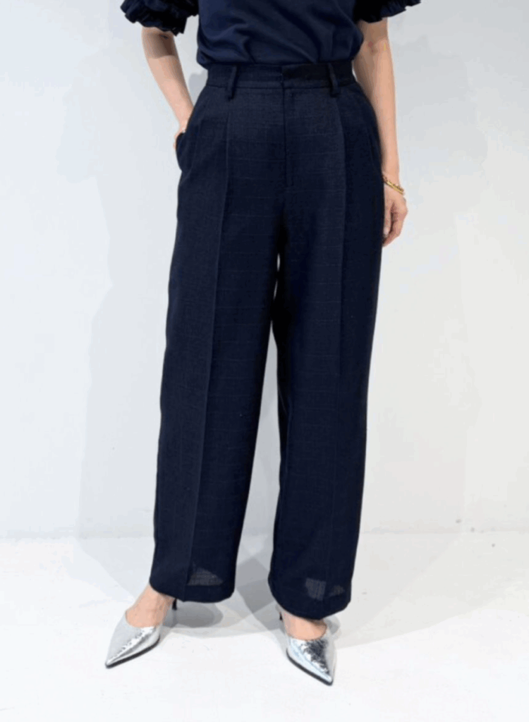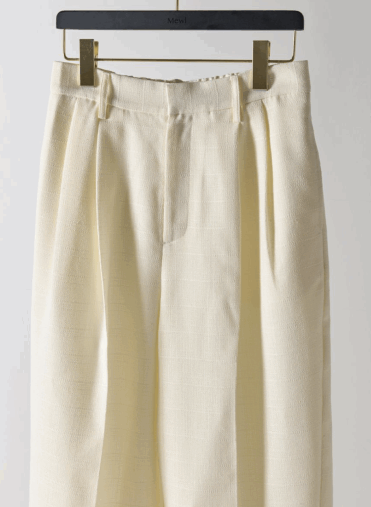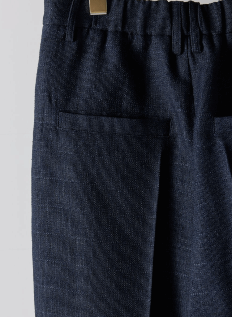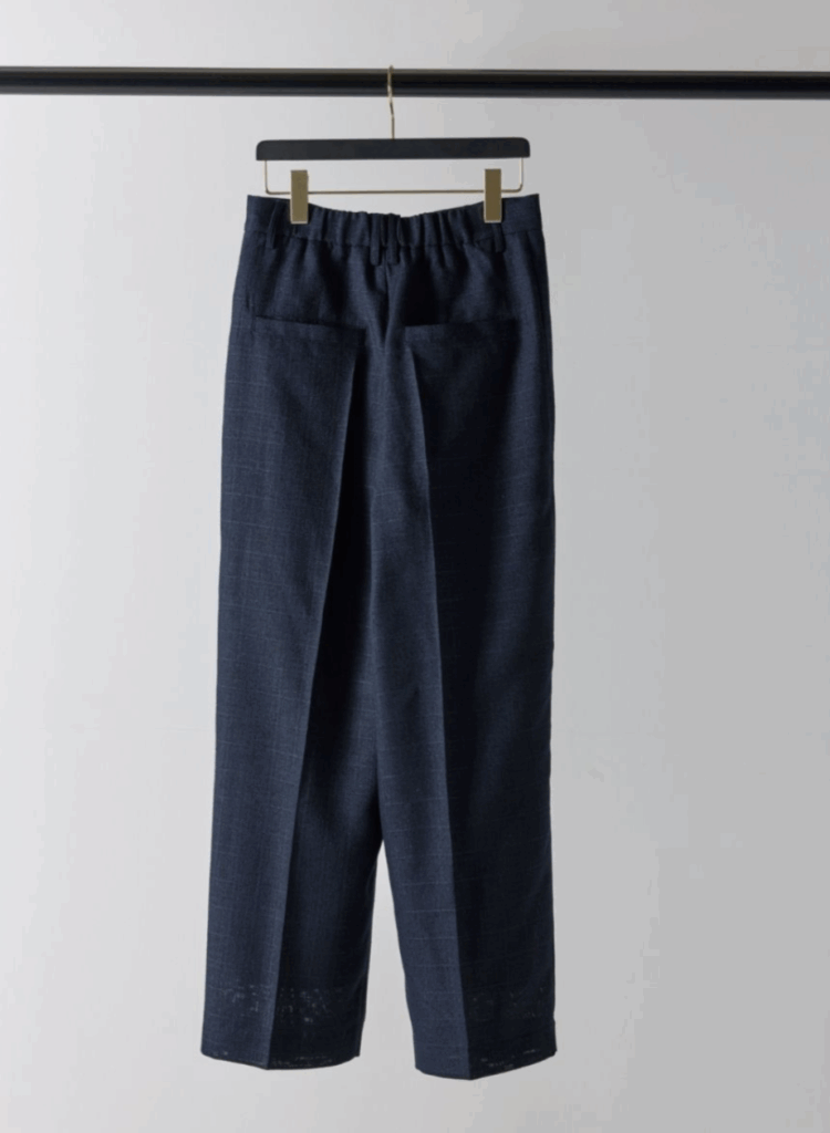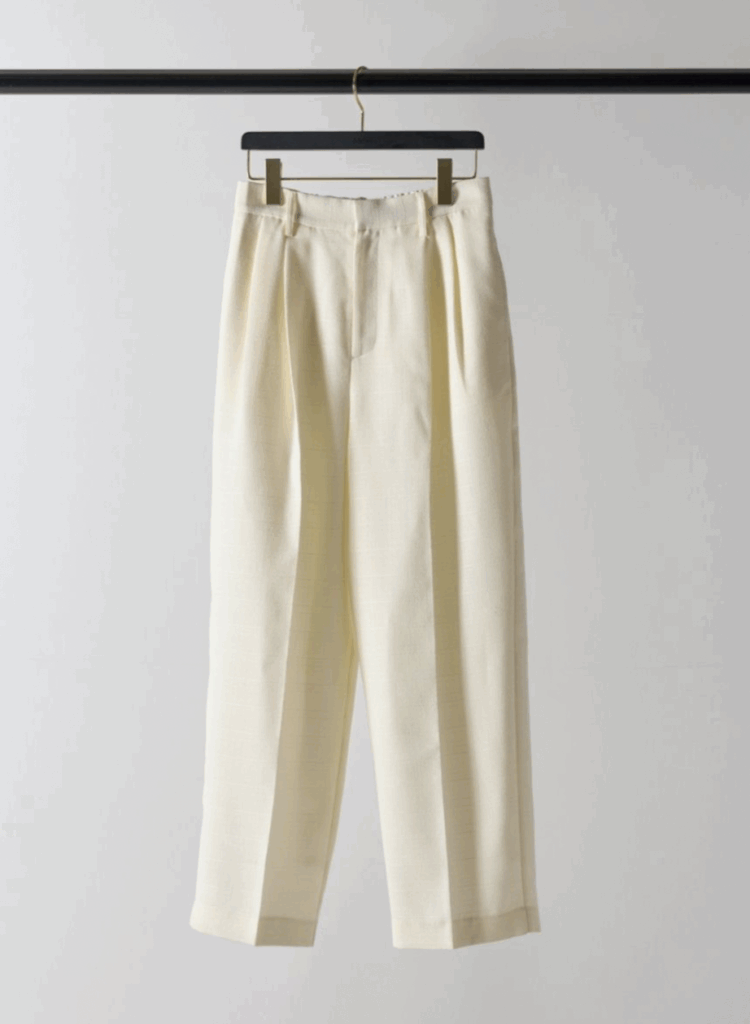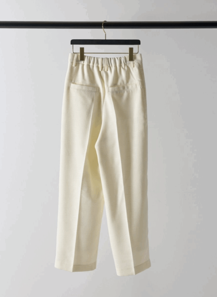 ワントーンで織り上げた、表情豊かなスクエア調サマーツイード素材の2タックパンツ。立体感のある生地が、シンプルな装いにも奥行きを与え、上品な存在感を演出します。さまざまなトップスと合わせやすい、2タック入りのワイドストレートシルエットで、程よく体のラインを拾わないバランスに。フロントはベルトまわりをすっきりと仕上げ、バックウエストはゴム仕様で快適な穿き心地を叶えました。後ろ姿をきれいに見せるポケット付きで、実用性にも配慮。同素材のジレやブラウスと合わせたセットアップスタイルはもちろん、スニーカーとも好相性で、きれいめからカジュアルまで幅広いスタイリングを楽しめる一本です。