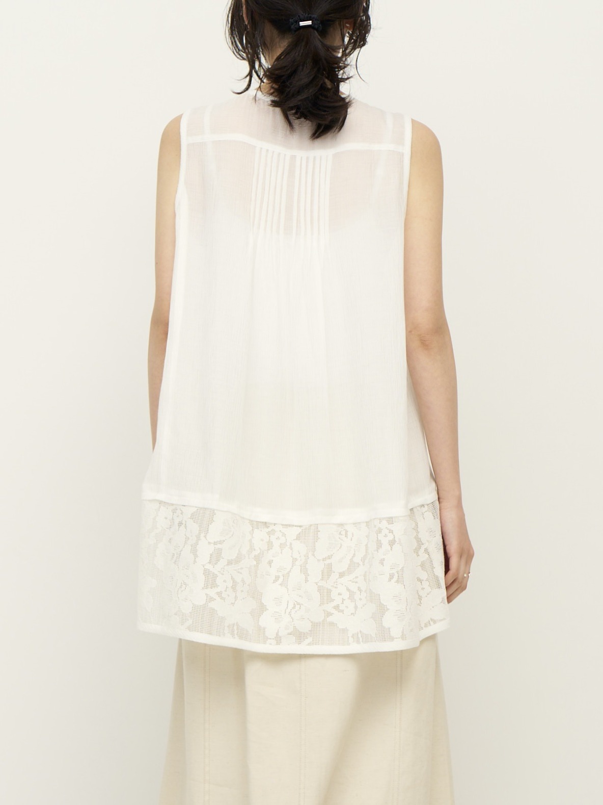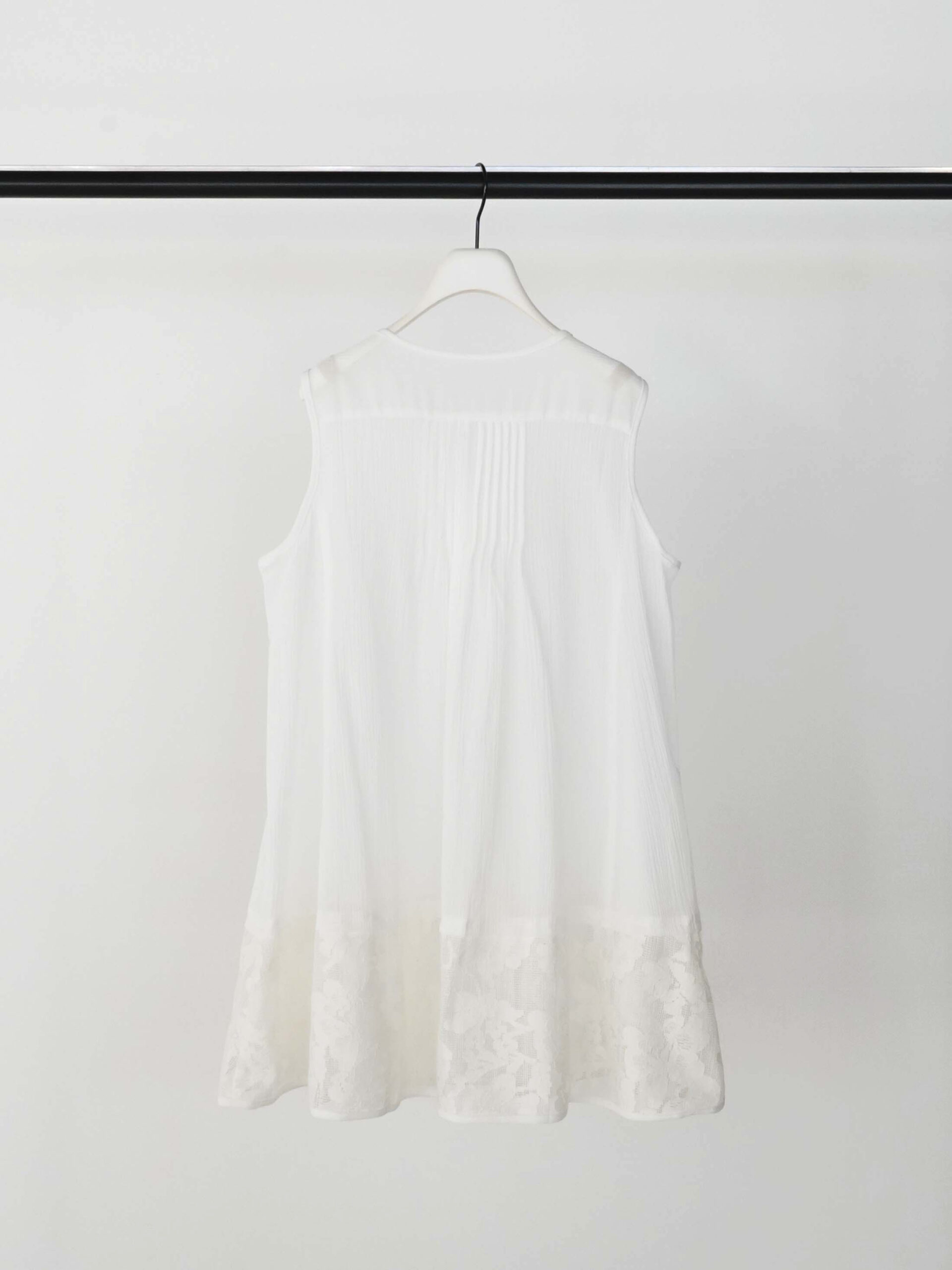 フロントとバックにピンタックをあしらい、すっきりとしたノースリーブ×ゆるやかなフレアシルエットで上半身を華奢に見せてくれます。