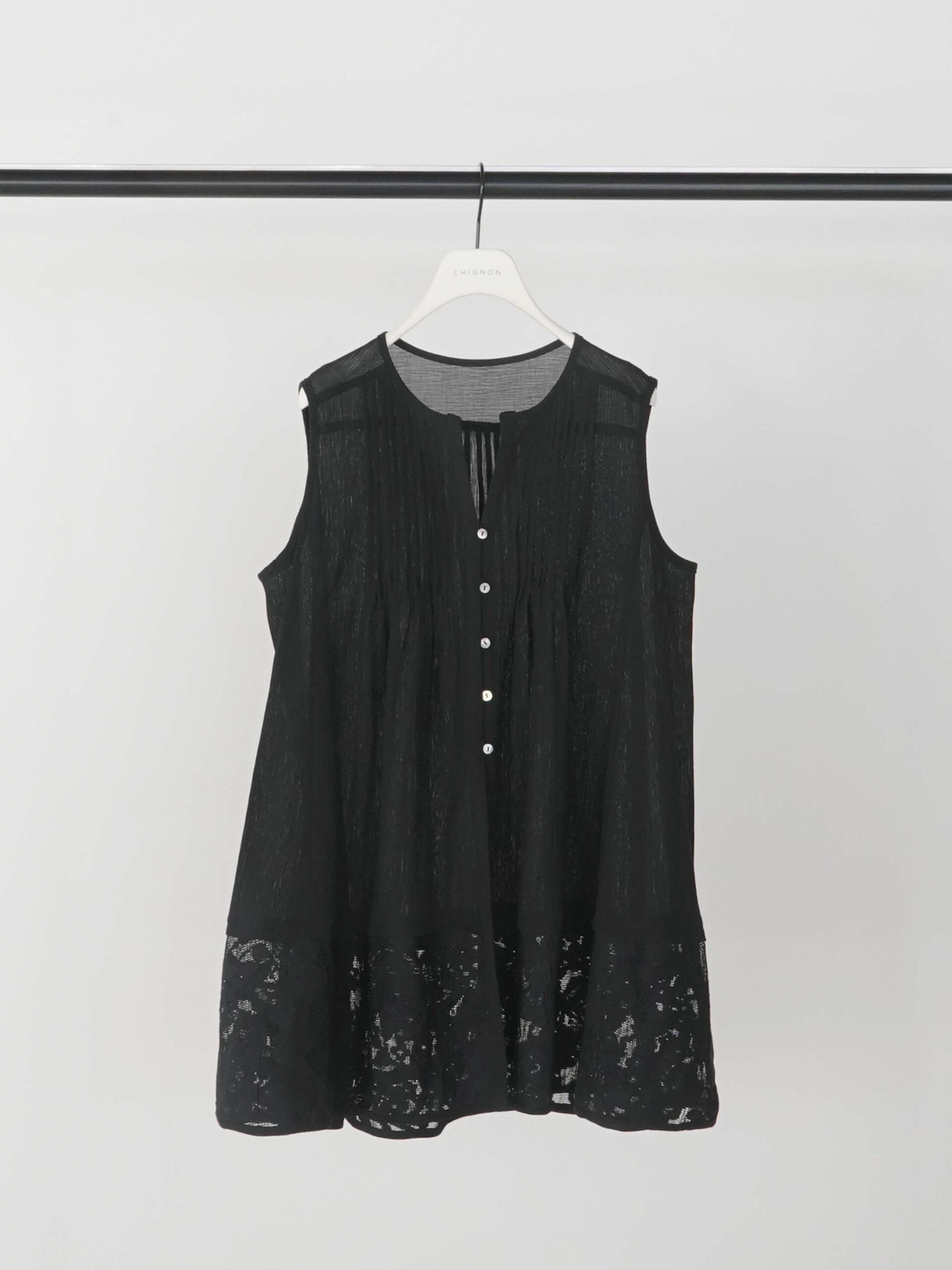 綿をベースにした表面感ある格子状メッシュと、ゆったりとしたフラワーモチーフのレースをドッキングした、夏らしい爽やかなチュニックブラウスです。