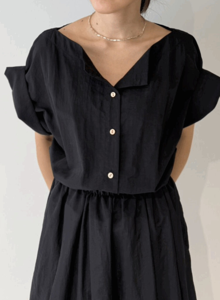 長めのフレンチスリーブは、ひと折りして着ることで程よい抜け感とこなれた印象に。
