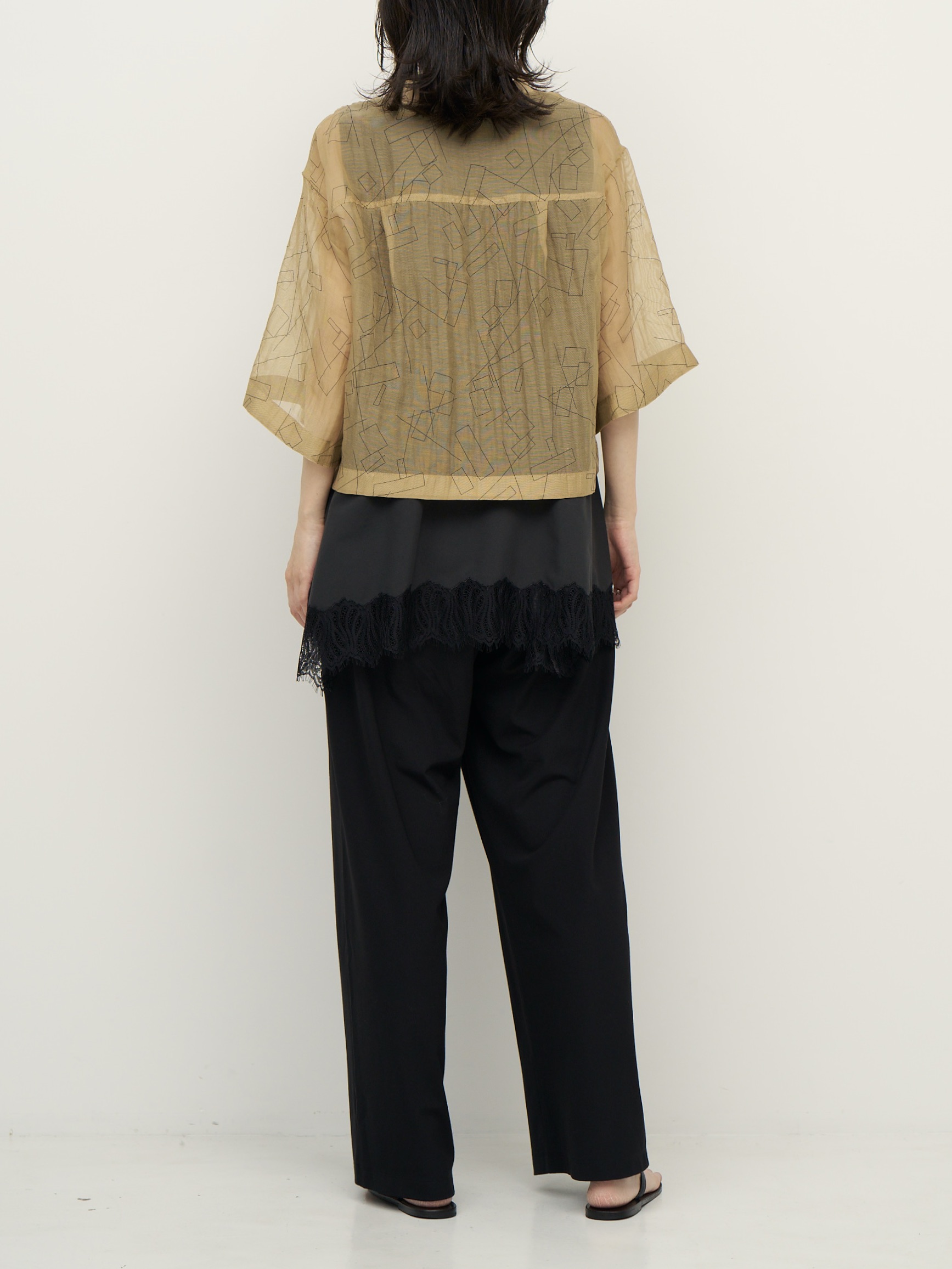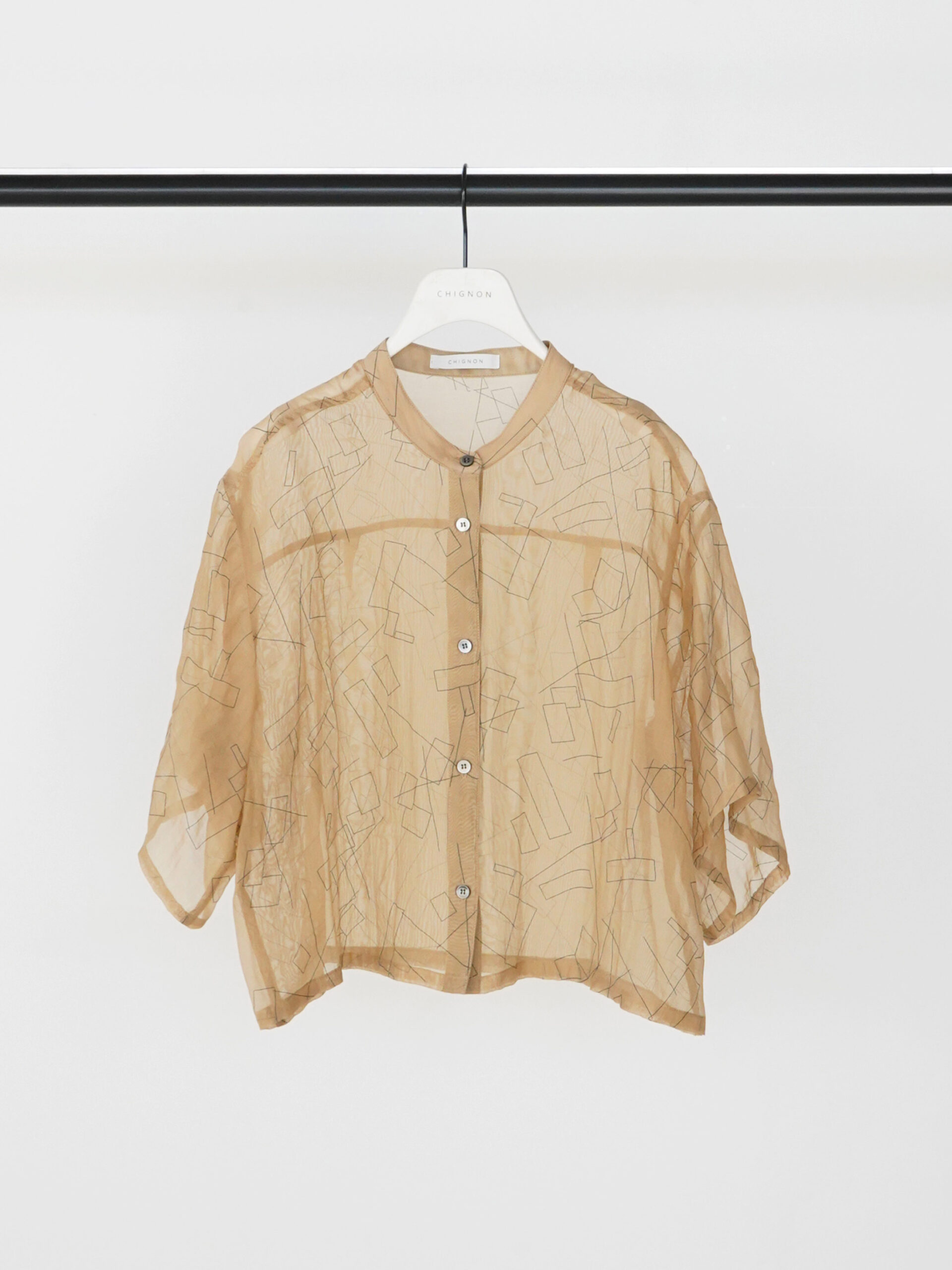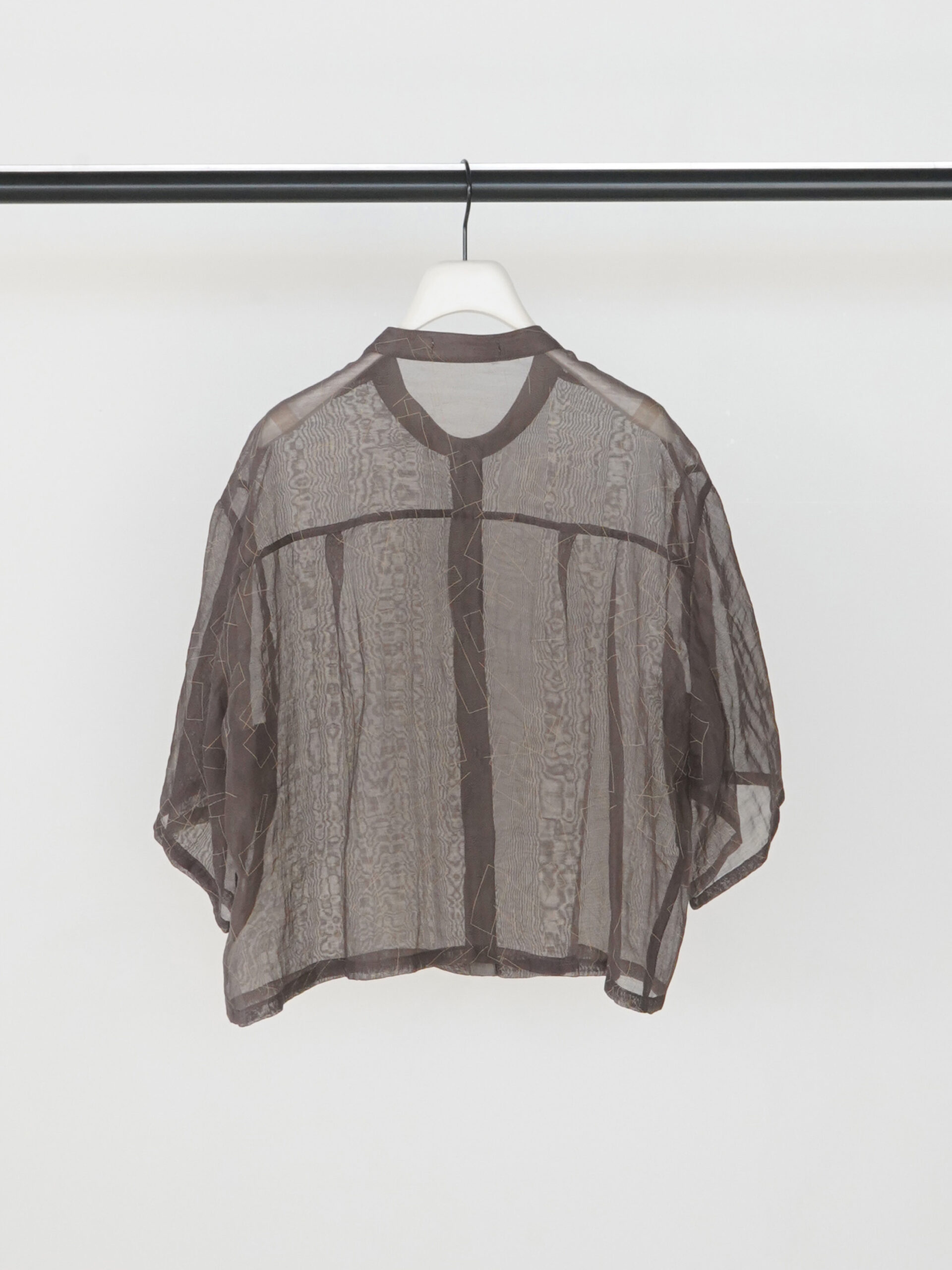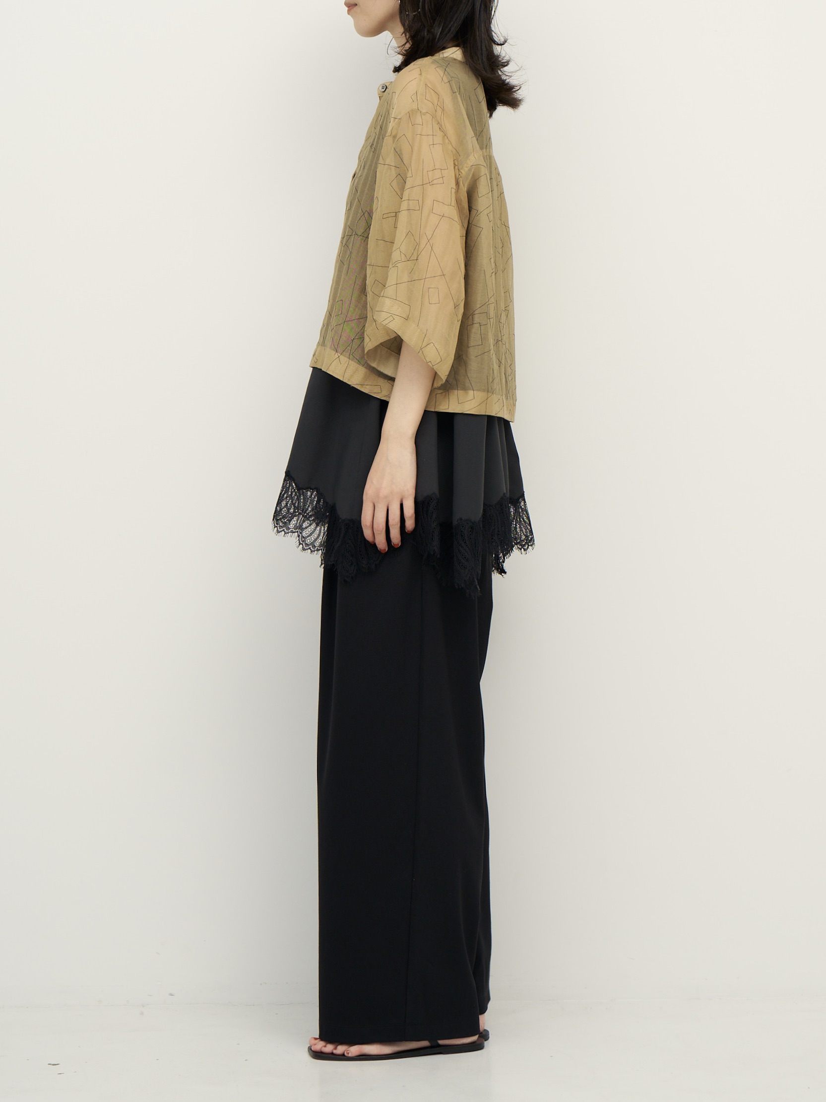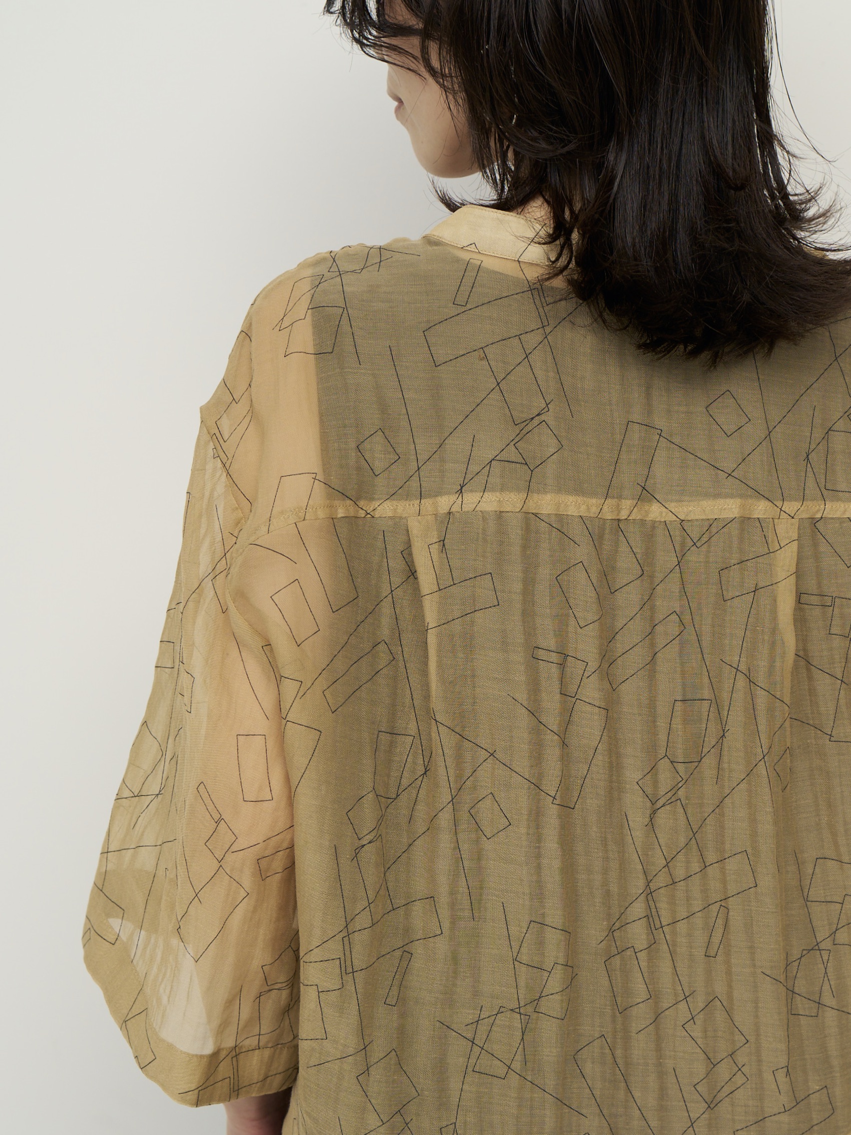 首元に沿うバンドカラーと、肘まで隠れる袖丈が、抜け感があってどこか女性らしい1枚。