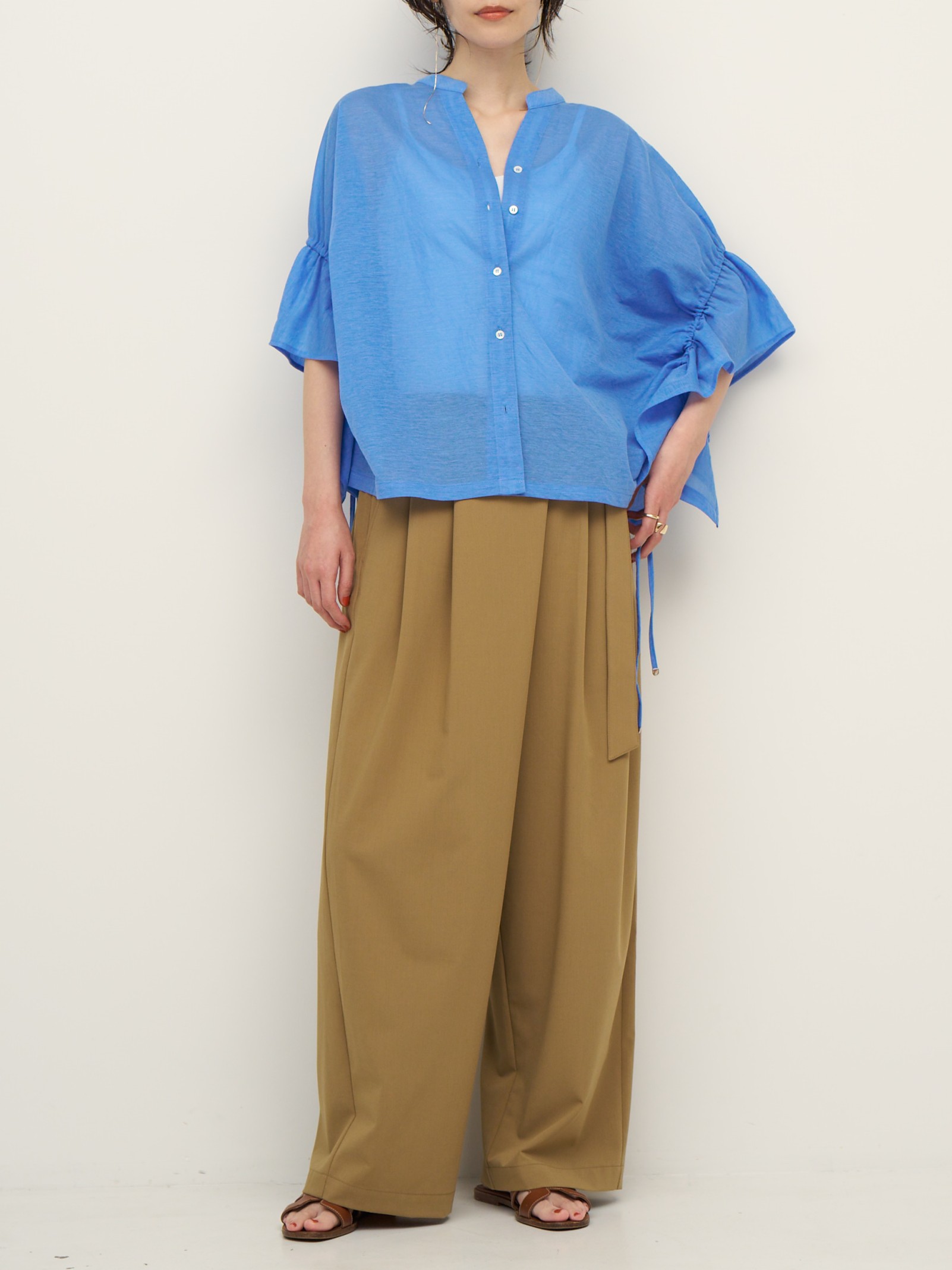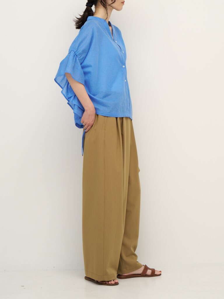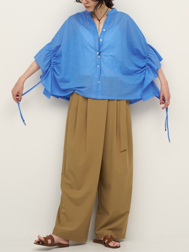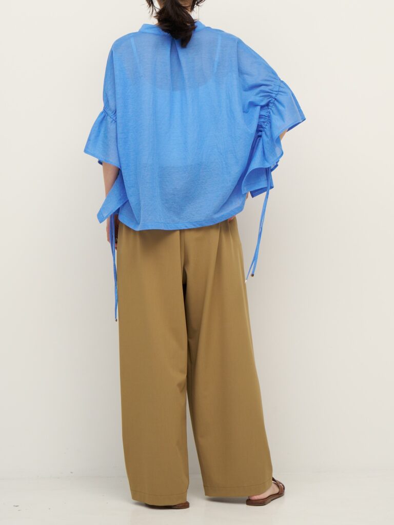 サイドの紐を絞って頂くと、ふらしている袖口部分ににフレアが入り、半袖のブラウスを着ているようなシルエットに変わります。