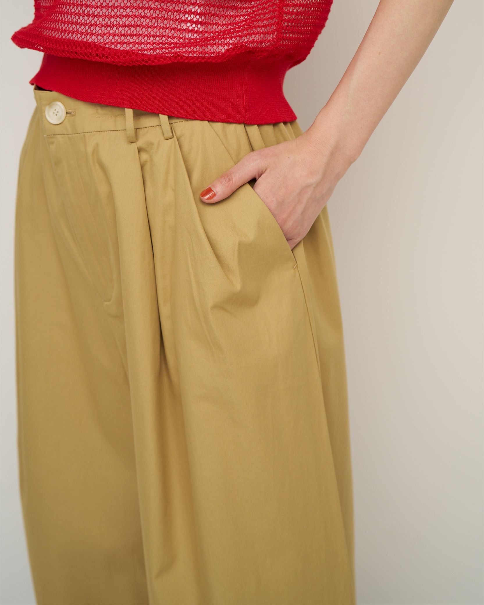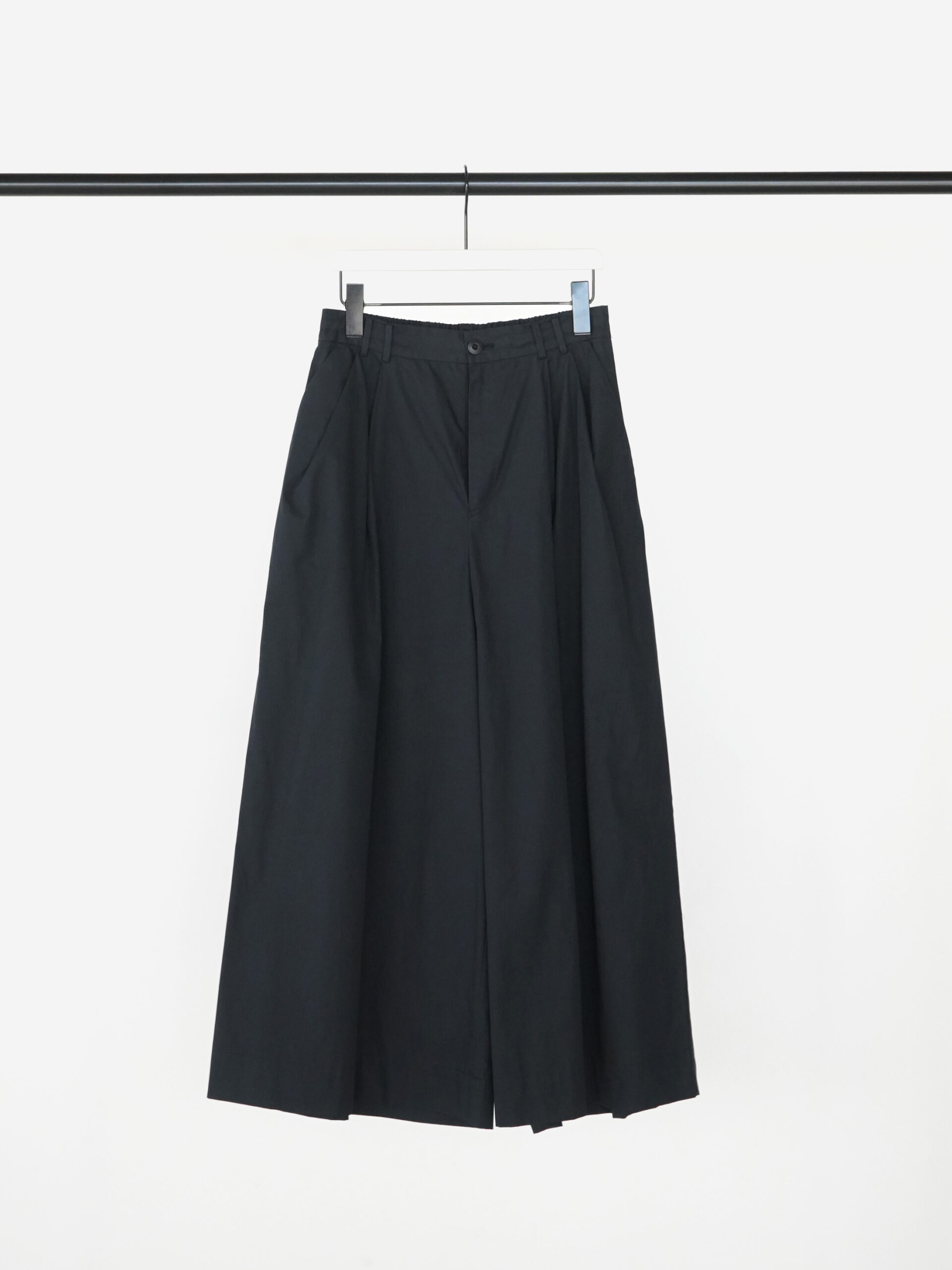 ワイドなシルエットにバランスを考えながらタックを入れることで、構築的で立体感のあるフォルムに仕上げたタックワイドパンツ。