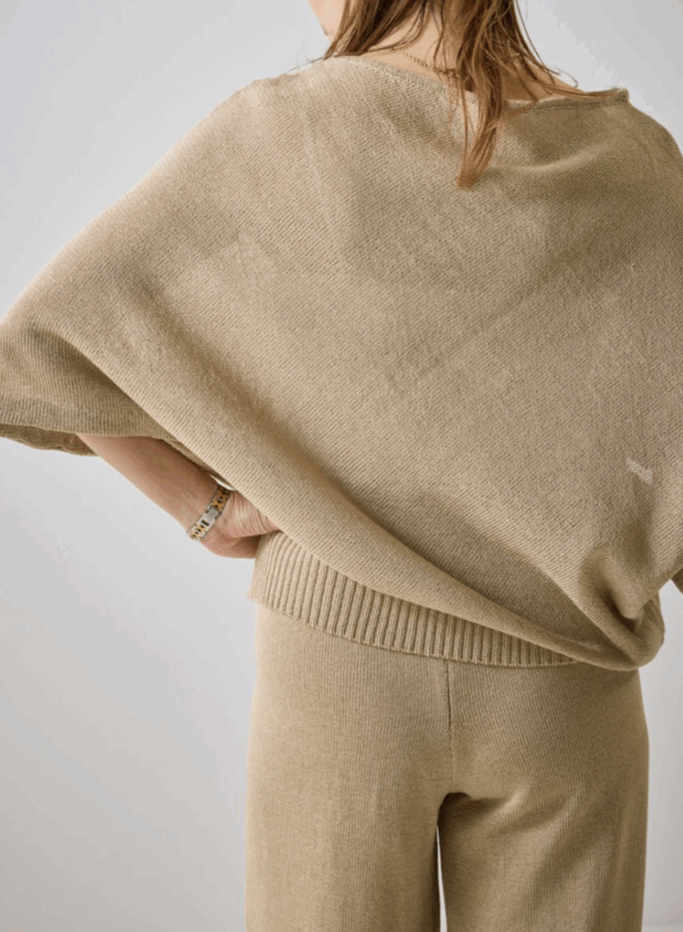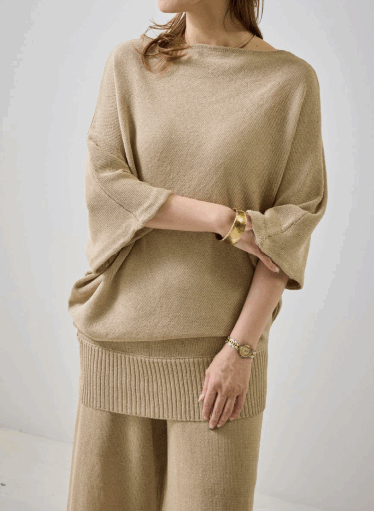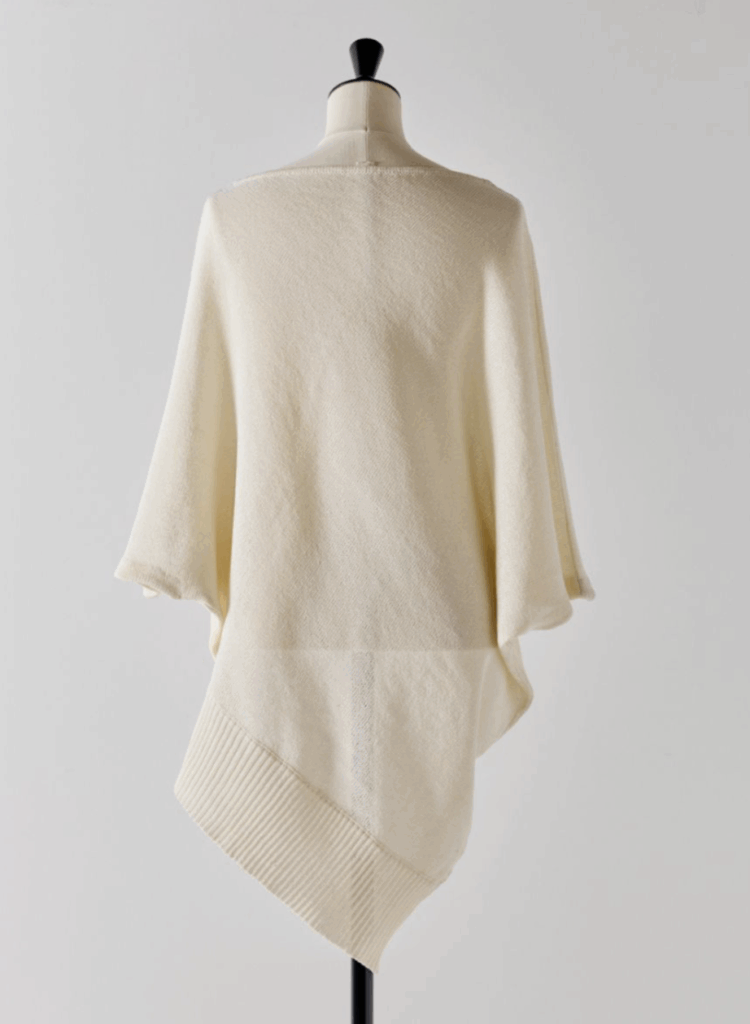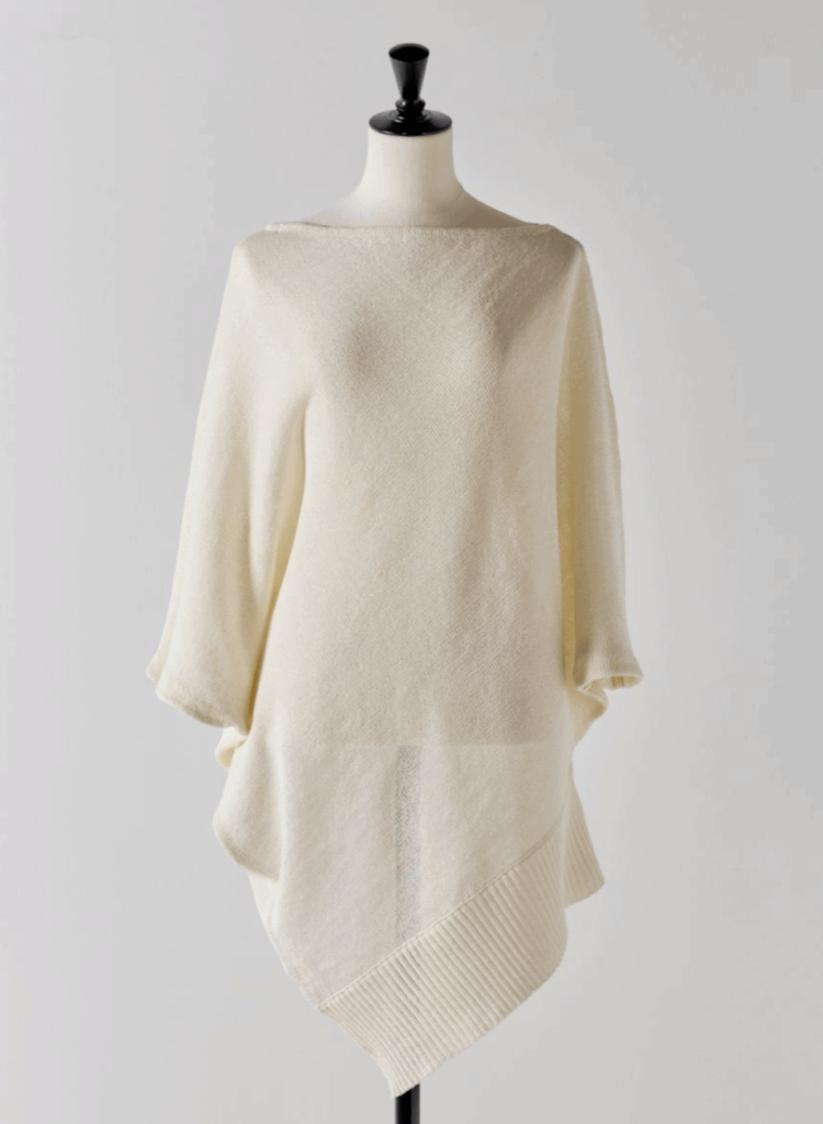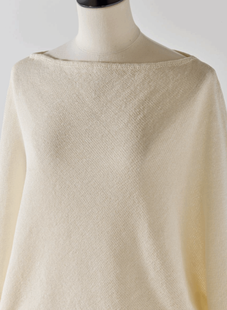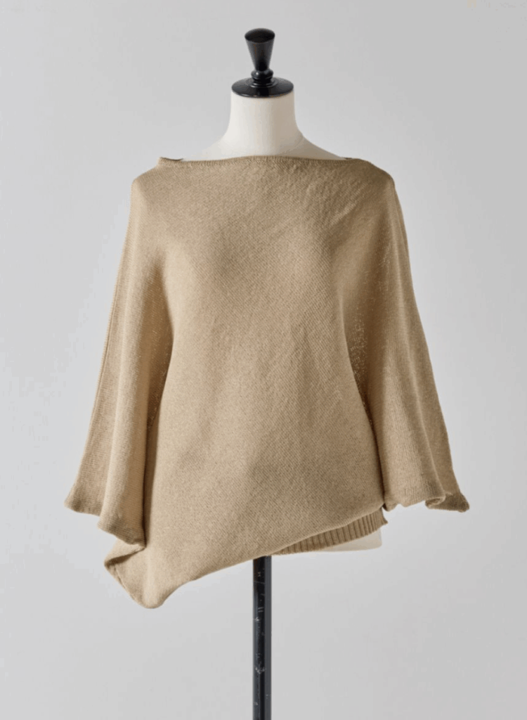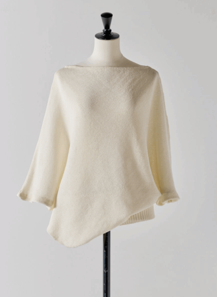 ストールのような見え方ながら、着用すると大胆なアシンメトリーシルエットが生まれ、自然と“大人の余裕”を演出します。