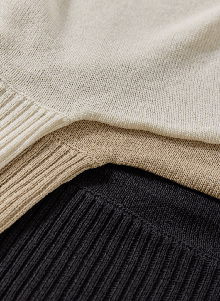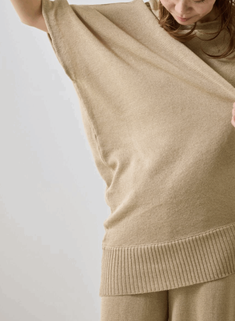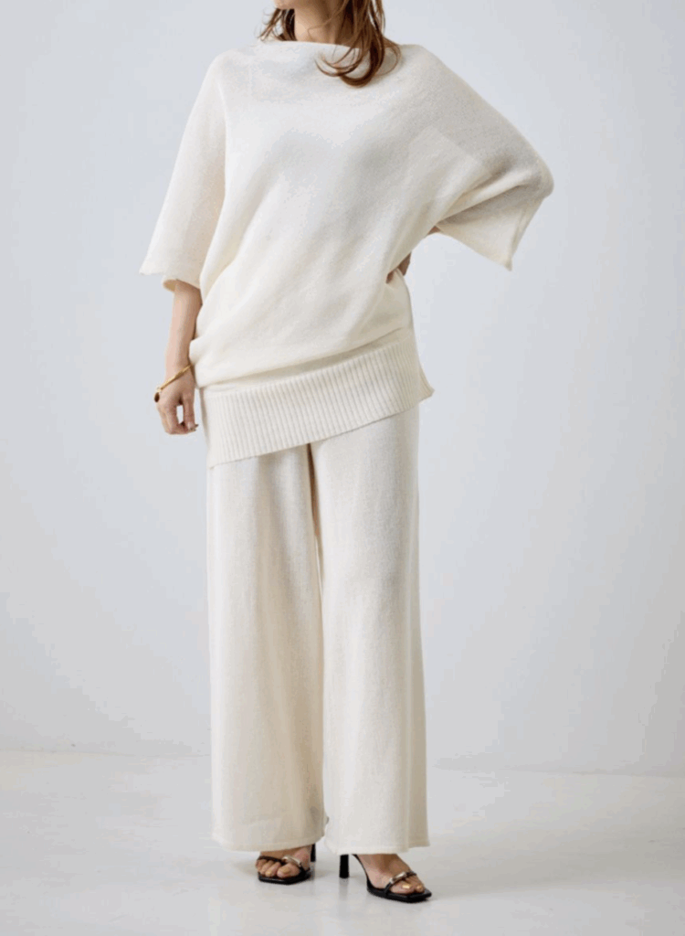 同素材のニットパンツとセットアップで着れば、きれいめなのに肩の力が抜けた、夏の理想的なラフスタイルが完成。