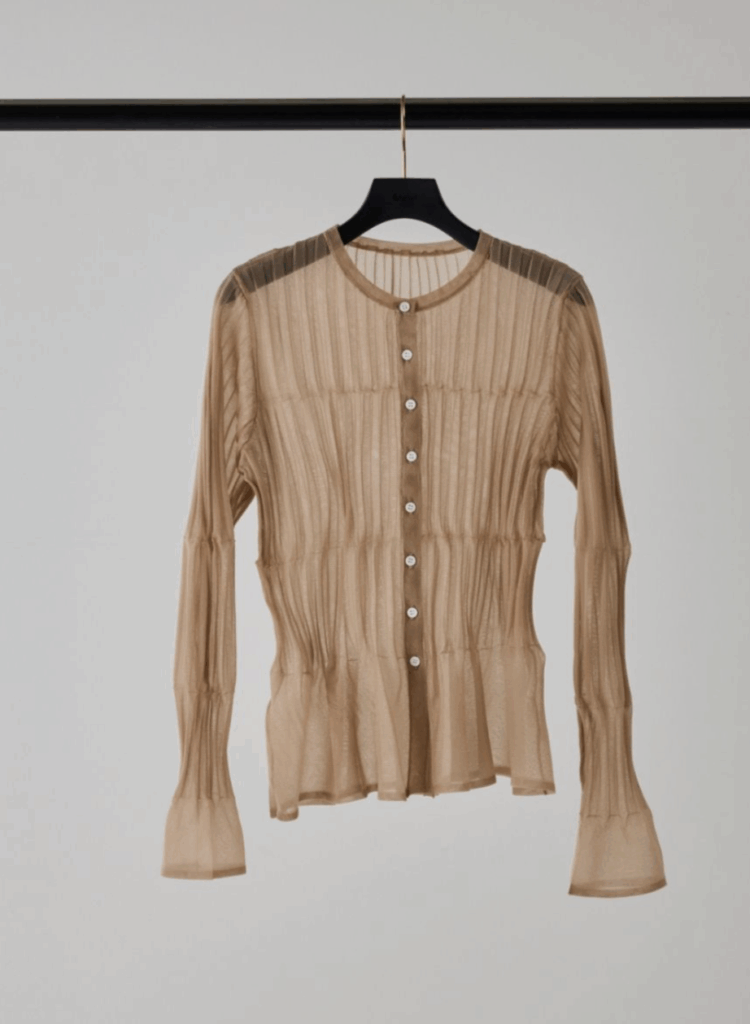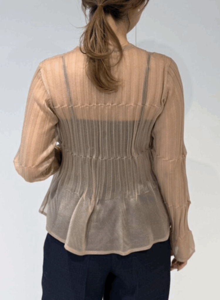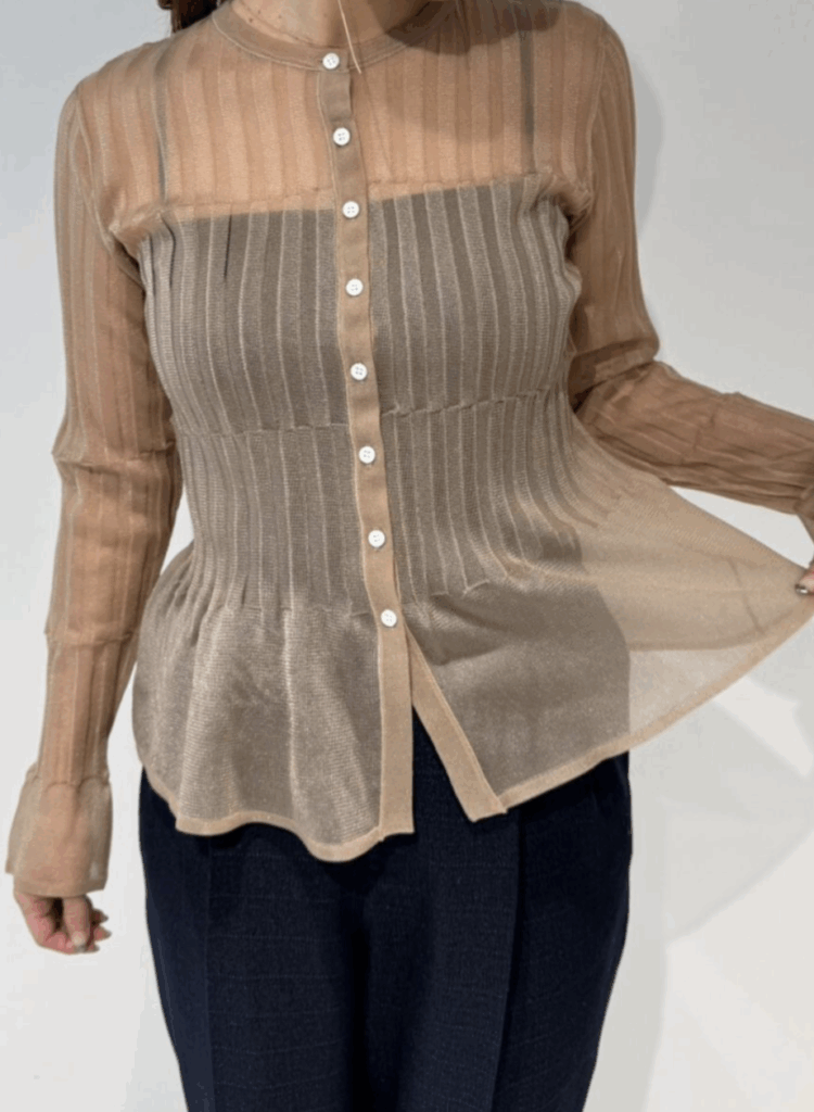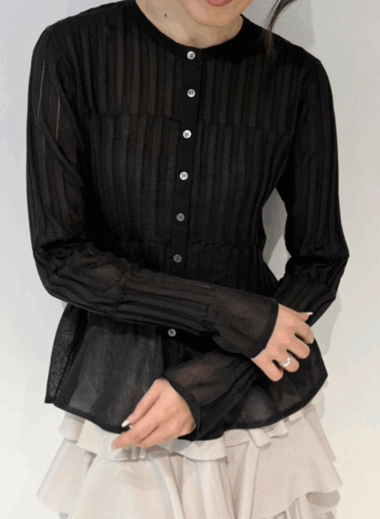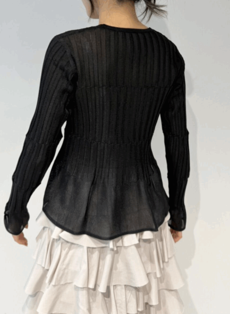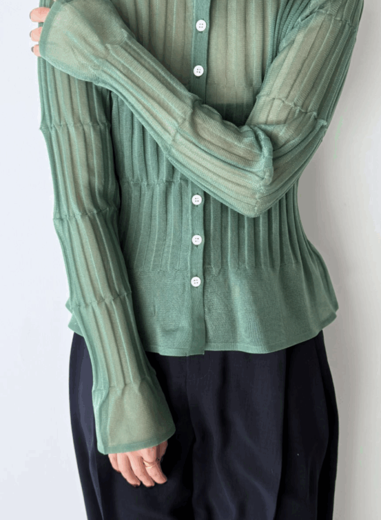 ランダムリブが印象的なシアーニットカーディガン。袖口と裾をフレアに編み立てることで、動きのあるフェミニンな表情に仕上げました。程よいハリ感のある素材が甘さを抑え、モードな雰囲気をプラス。トップスとしても、羽織りとしても活躍し、合わせるインナー次第で春から秋まで長く愛用していただけます。肌なじみの良いカラー展開に、配色の貝調ボタンがさりげないアクセントとなる一枚です。