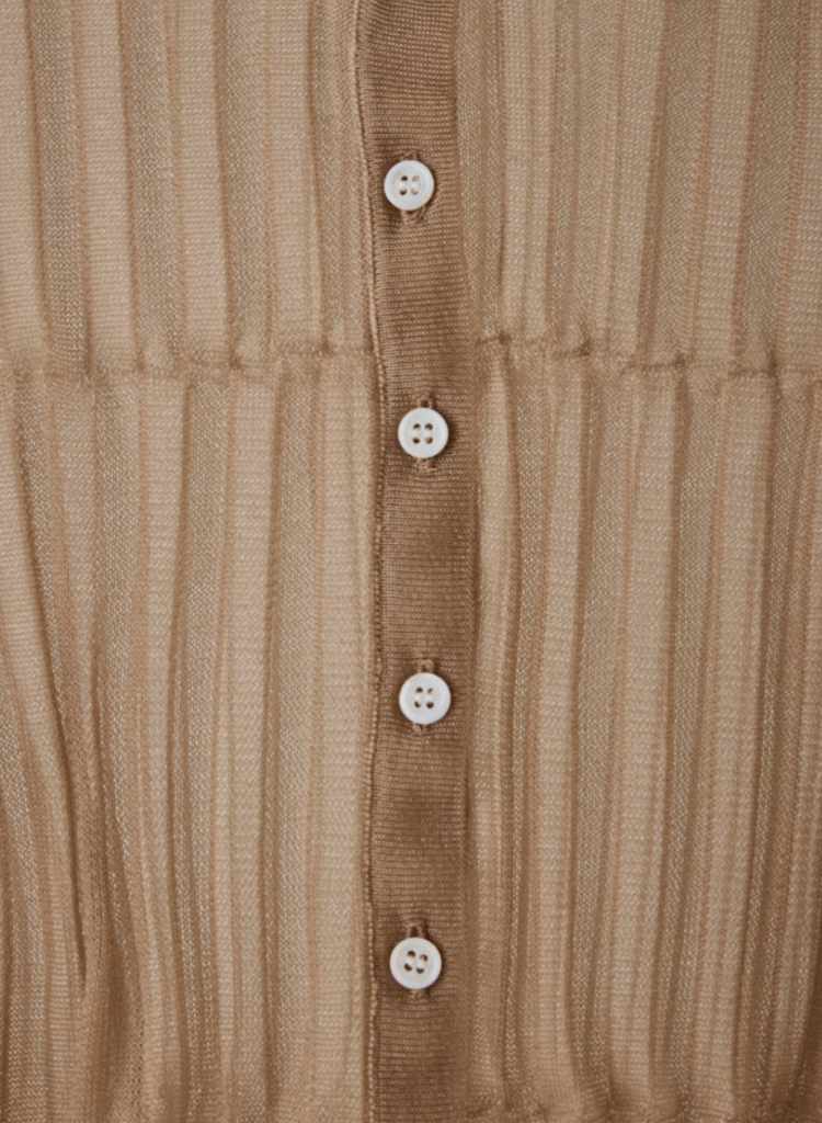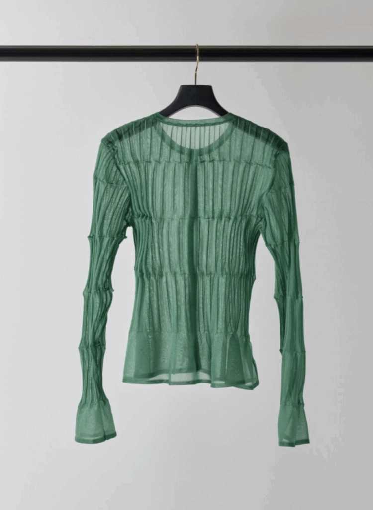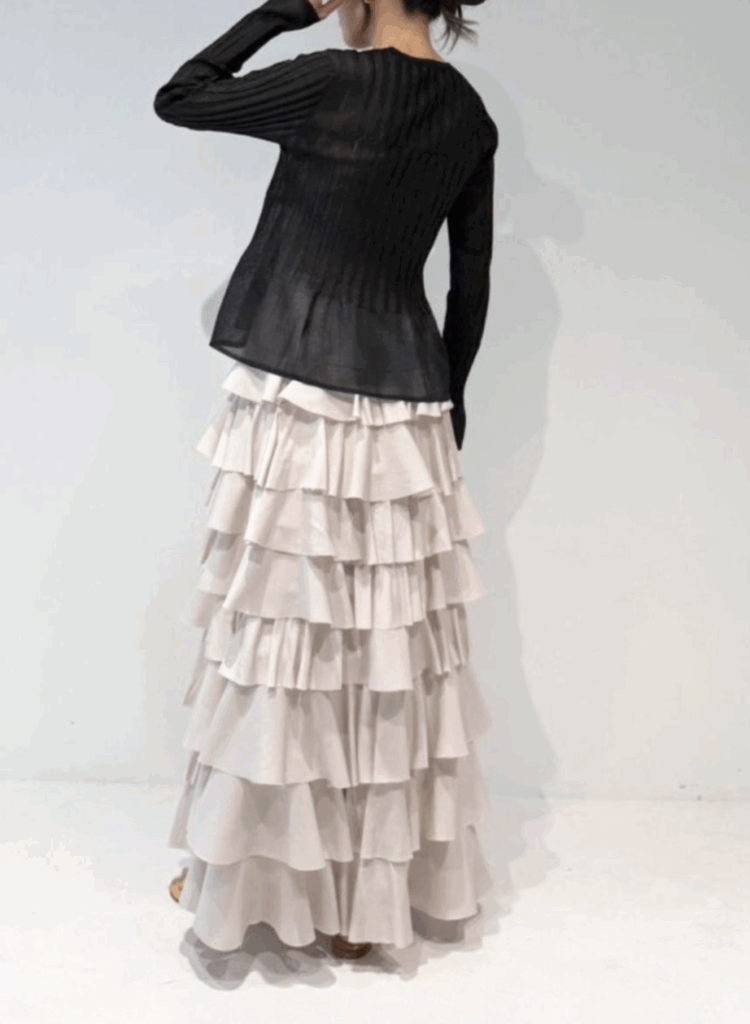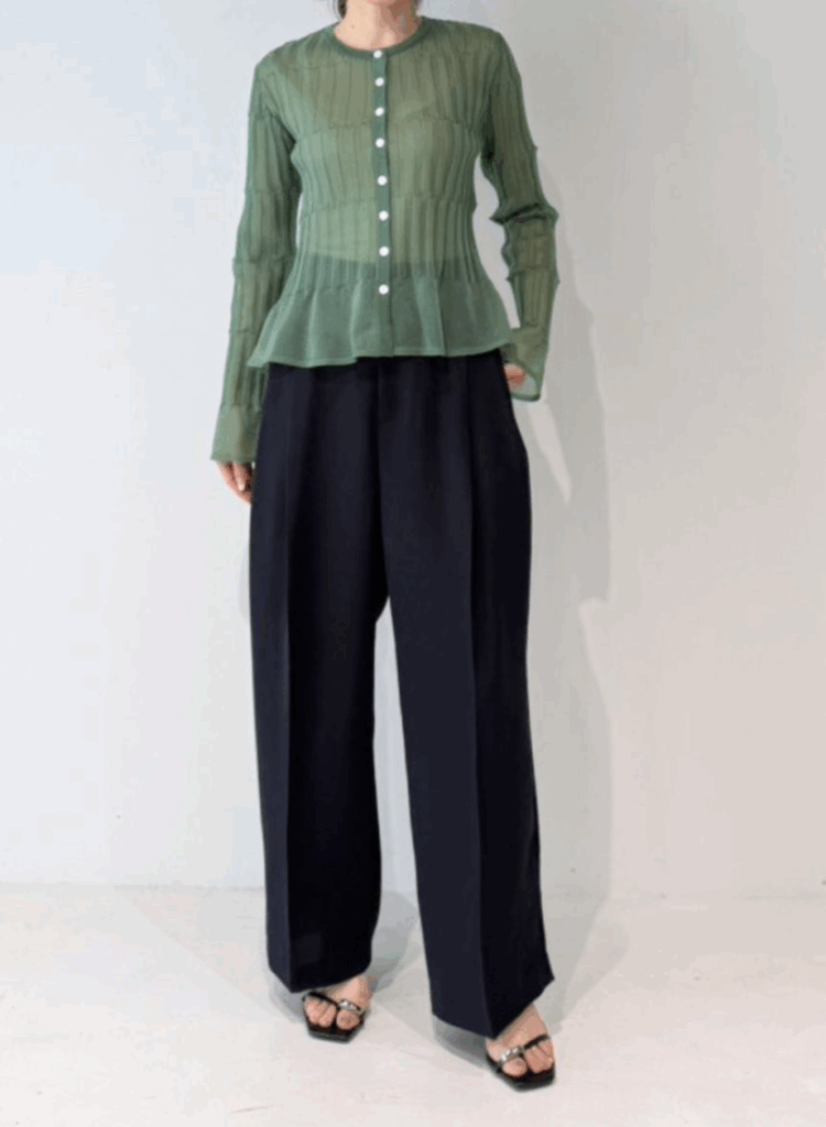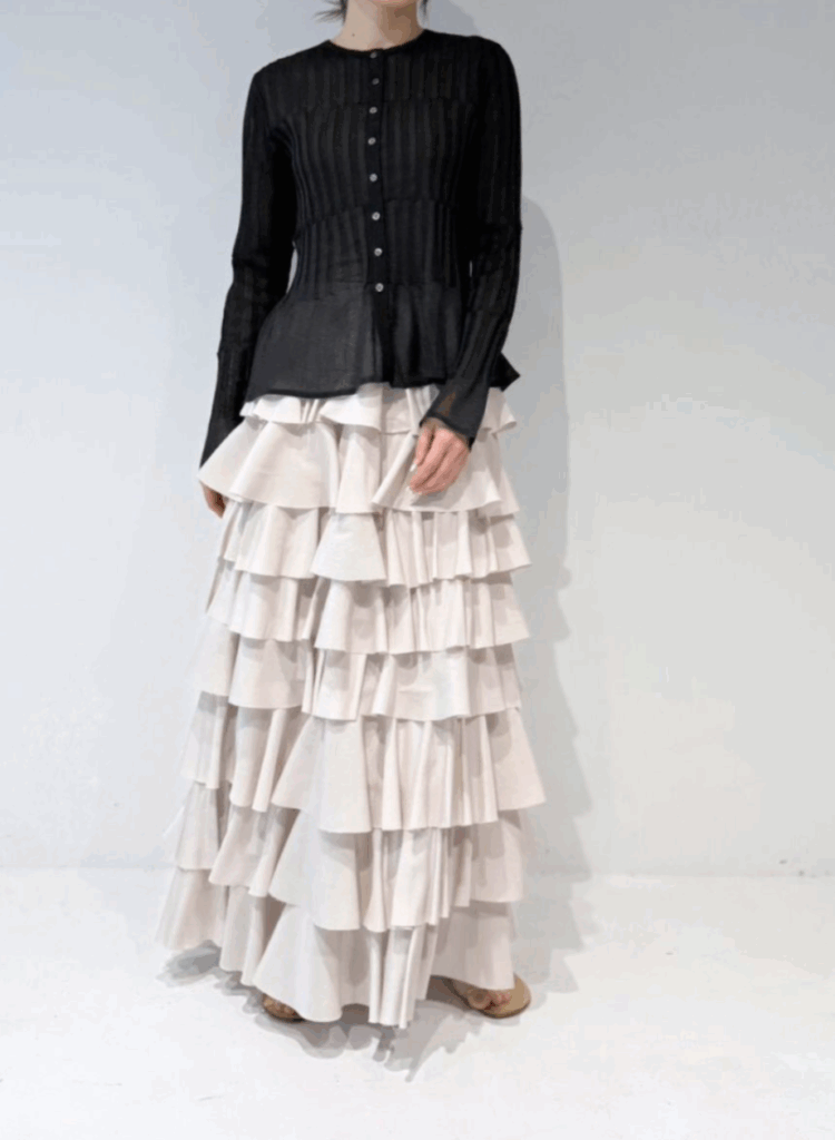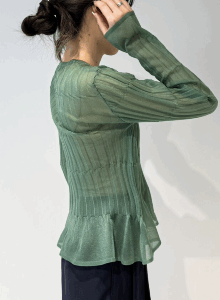 ランダムリブが印象的なシアーニットカーディガン。袖口と裾をフレアに編み立てることで、動きのあるフェミニンな表情に仕上げました。程よいハリ感のある素材が甘さを抑え、モードな雰囲気をプラス。トップスとしても、羽織りとしても活躍し、合わせるインナー次第で春から秋まで長く愛用していただけます。肌なじみの良いカラー展開に、配色の貝調ボタンがさりげないアクセントとなる一枚です。