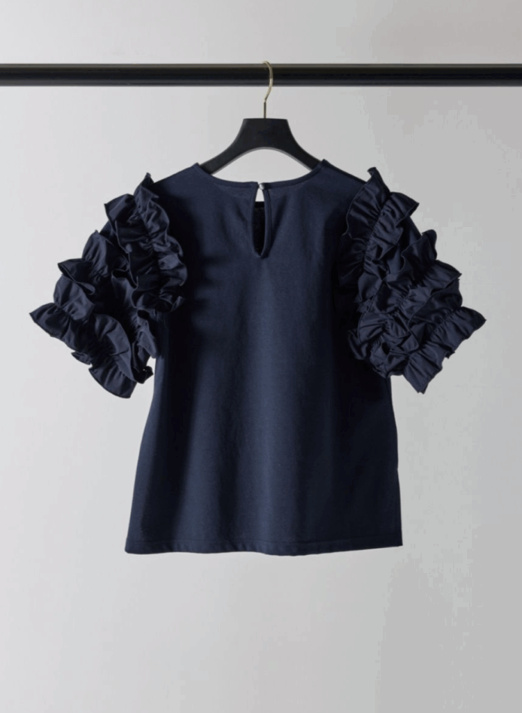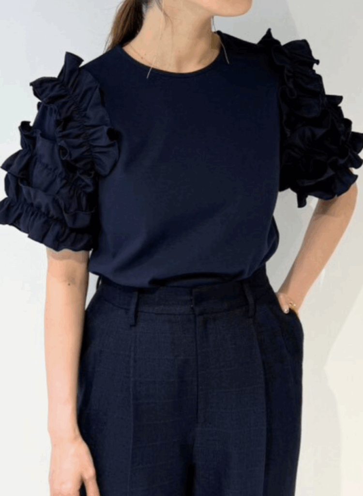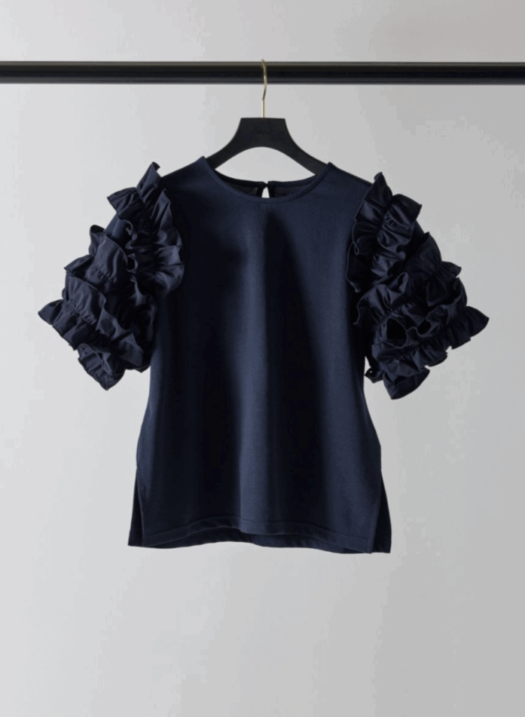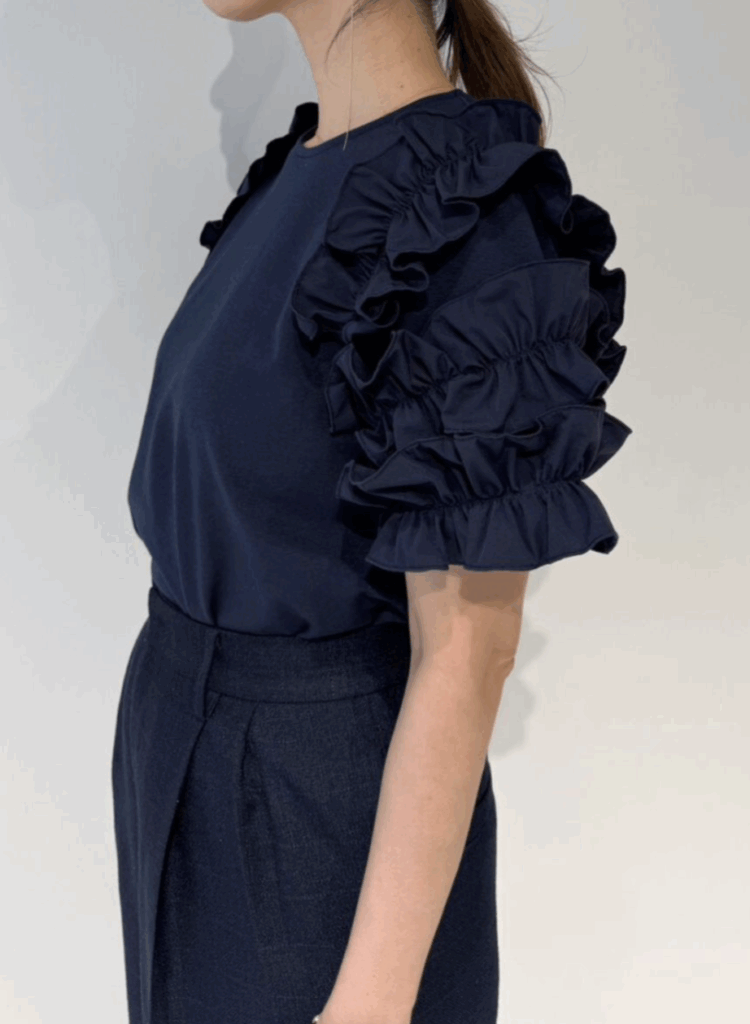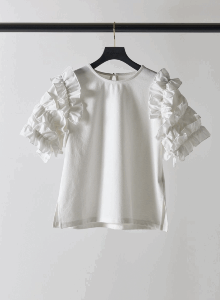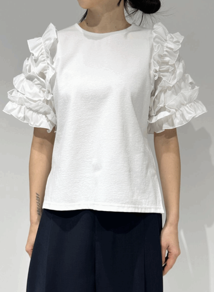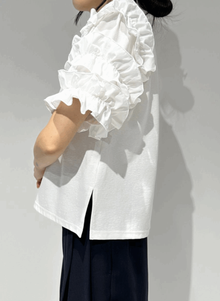 薄手のきれいめポンチ素材を使用し、カジュアルになりすぎない、ほどよいきちんと感を備えたカットソー。袖には布帛のフリルを重ね、華やかさを添えながらも、ワントーンでまとめることで甘さを抑えた大人の印象に仕上げました。襟ぐりは内側ですっきりと始末し、首元がきれいに見えるラインに。程よいゆとりを持たせつつ、やや高めのウエスト位置をすっきりと絞ることで、自然なスタイルアップを実現。裾にはスリットを入れ、トップスインでもアウトでもバランスよく着こなせる一着です。