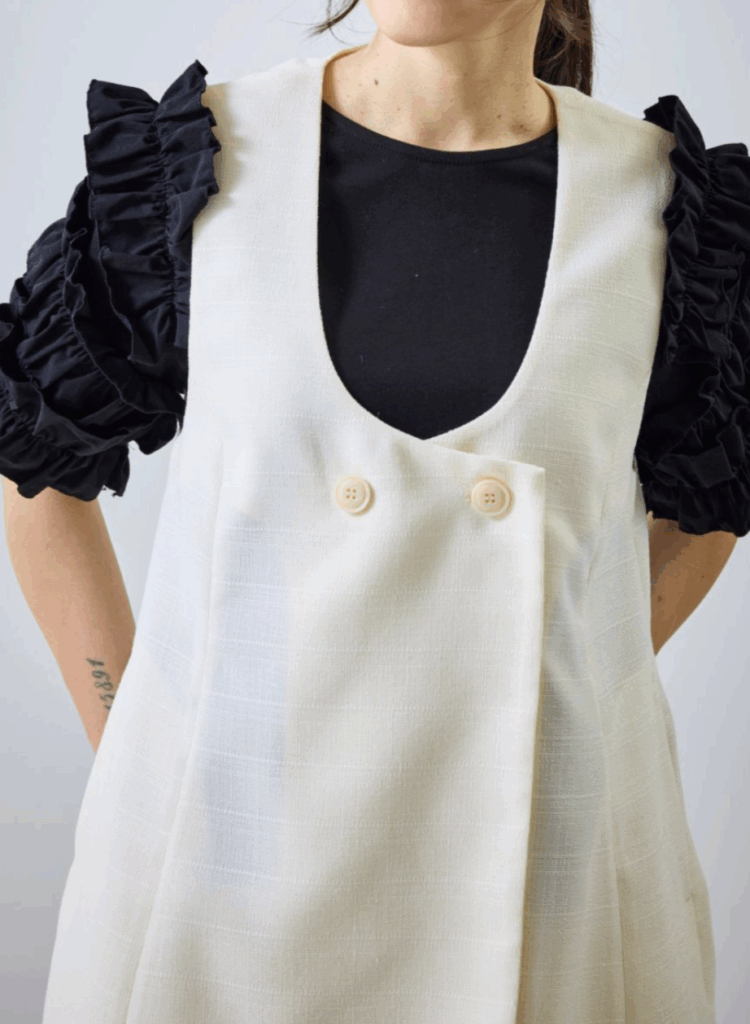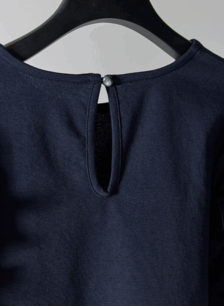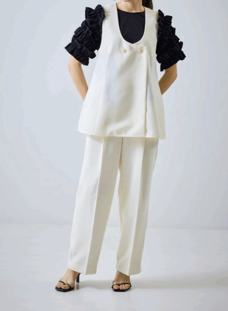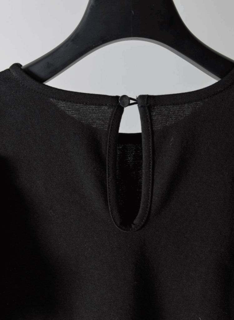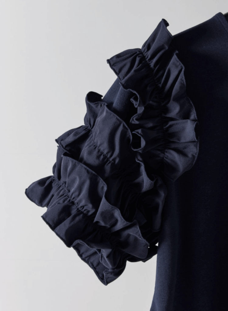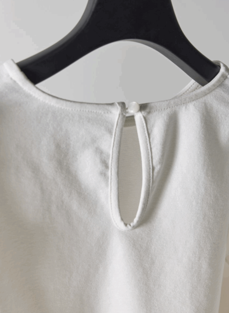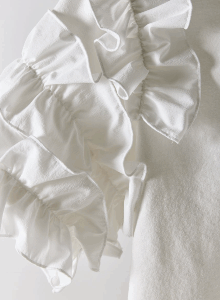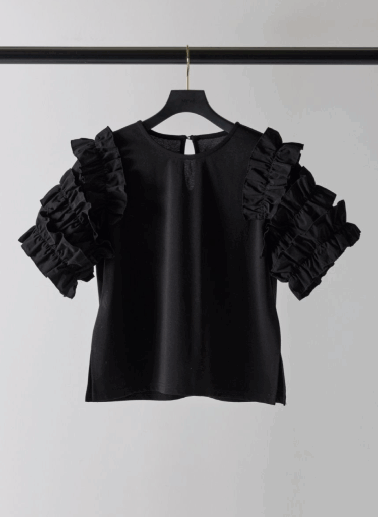 薄手のきれいめポンチ素材を使用し、カジュアルになりすぎない、ほどよいきちんと感を備えたカットソー。袖には布帛のフリルを重ね、華やかさを添えながらも、ワントーンでまとめることで甘さを抑えた大人の印象に仕上げました。襟ぐりは内側ですっきりと始末し、首元がきれいに見えるラインに。程よいゆとりを持たせつつ、やや高めのウエスト位置をすっきりと絞ることで、自然なスタイルアップを実現。裾にはスリットを入れ、トップスインでもアウトでもバランスよく着こなせる一着です。