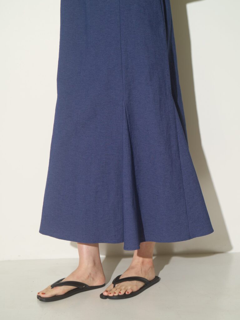 ほどよくハリのある素材感で裾に三角マチを沢山入れて、動くたびに綺麗なフレアシルエットを描きます。