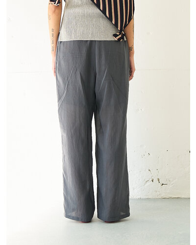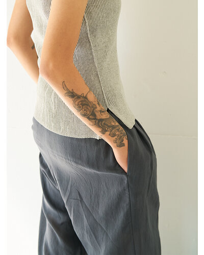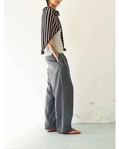 通常はブラウスで使用するような極薄の柔らかい素材をあえてパンツで採用。 真夏でもマニッシュな雰囲気のかっこよく着こなせるパンツに仕上げました。 とにかく薄くて軽いのがポイントです。 洗い加工と樹脂加工を施して、皴が多少目立たなくなるよう改良を重ねて作り上げた、シンプルながらも『こんなパンツが欲しい』ポイントを追求して作り上げました。