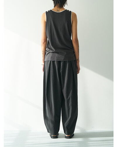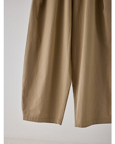 前後に深く斜めにいれたタックで作るカーブシルエットになっていて、肌に張り付かない涼しく履けるメンズライクな印象のパンツに仕上げました。 ゴムパンツとは違った、イージーながらもすっきりと履き込めるのがうれしいポイントです。