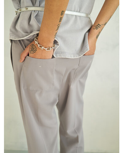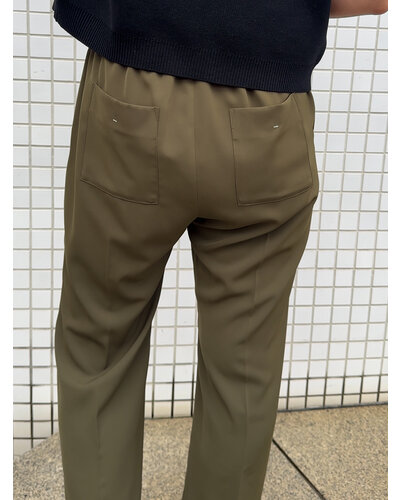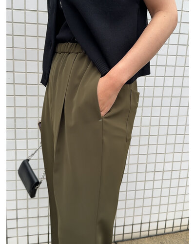 ゴム仕様でストレスフリー、フロントにタックを入れているので、おなか周りをカバーしながらきれいなシルエットで