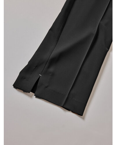 裾には両サイドにスリットが入っていて、スリットが広がると脚がまっすぐに見えるシルエットに変化します。