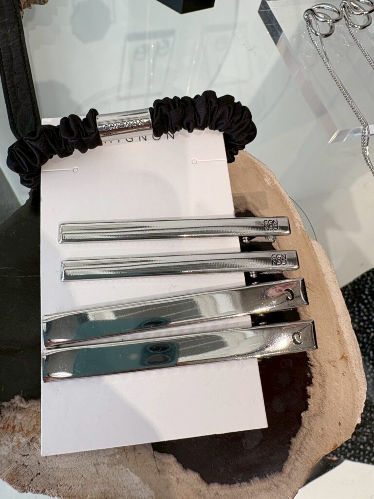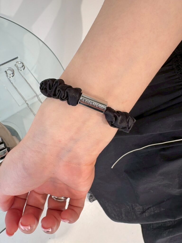 ブラックのミニシュシュとシンプルな2サイズのヘアクリップを組み合わせた5本セットヘアアクセは、シンプルながらも存在感があり、コーディネートにも合わせやすいアイテムとなっております。ミニシュシュにはCHIGNONの刻印入り円柱プレートが付いているので腕につけるだけでも可愛いのでオススメです。ヘアクリップはそれぞれ「C」と「CGN」と刻印が施されており、シンプルですが細部まで拘ったアイテムとなっております。5本セットなので様々な着け方を楽しめるのも嬉しいポイントです。