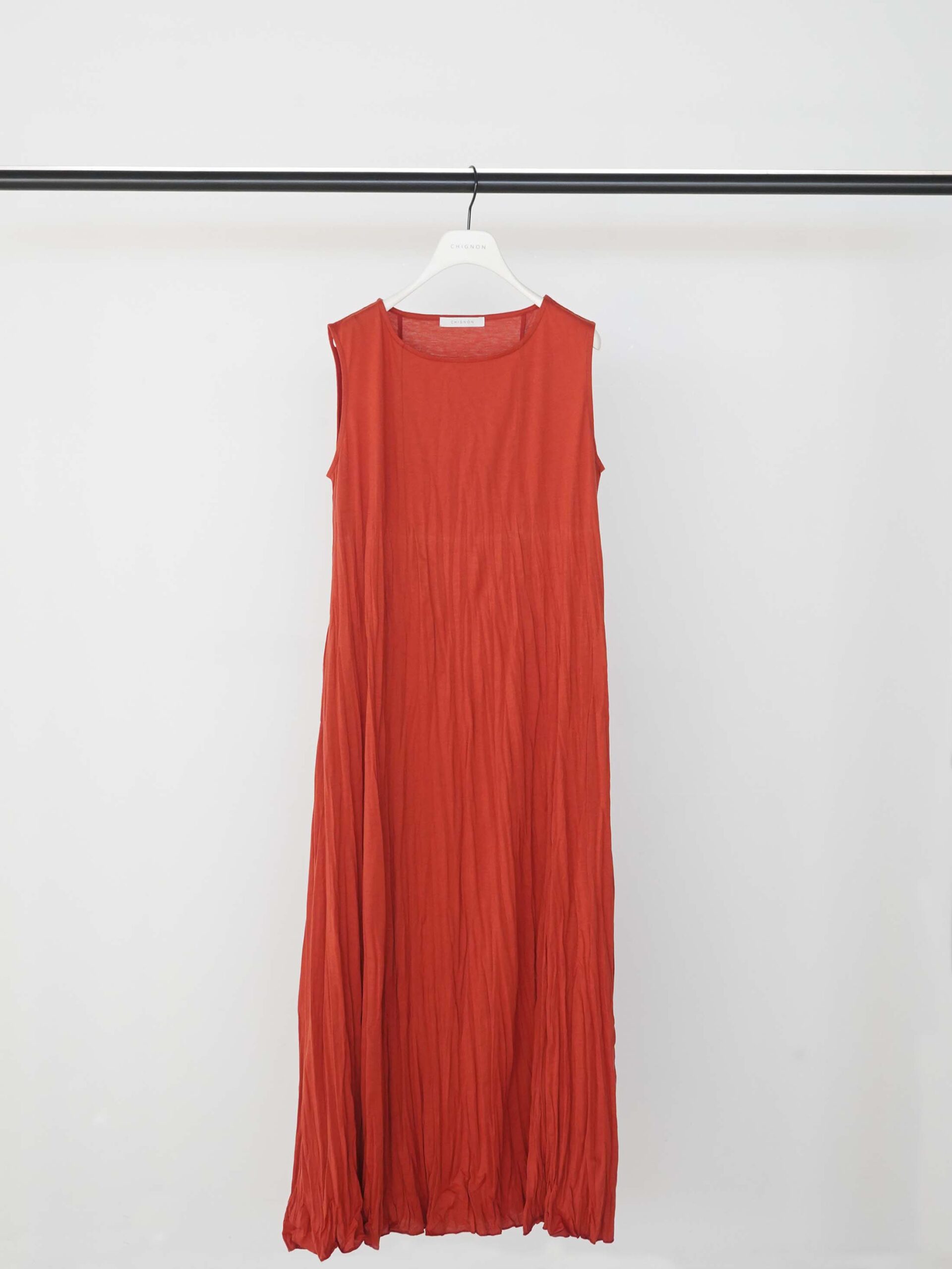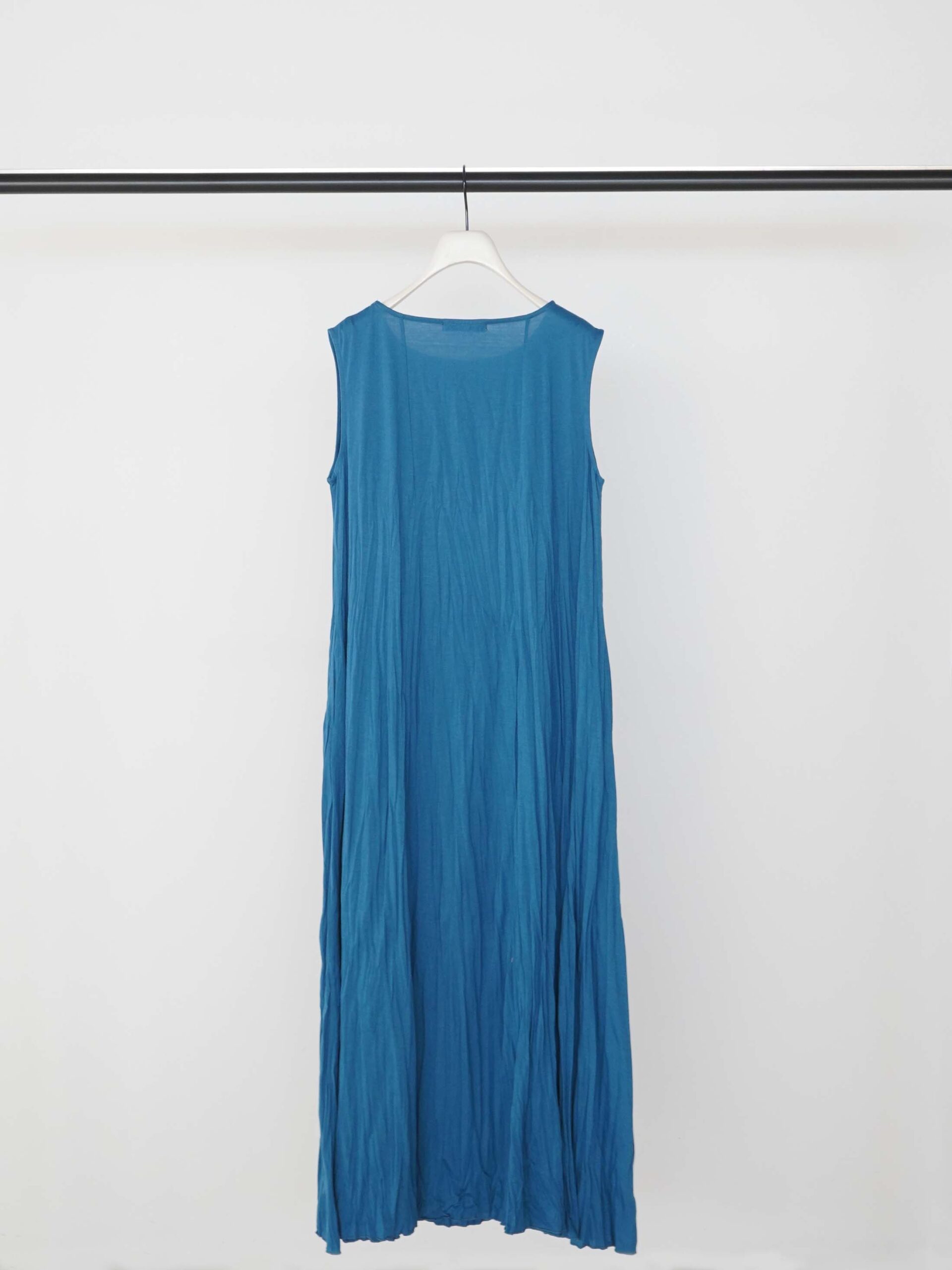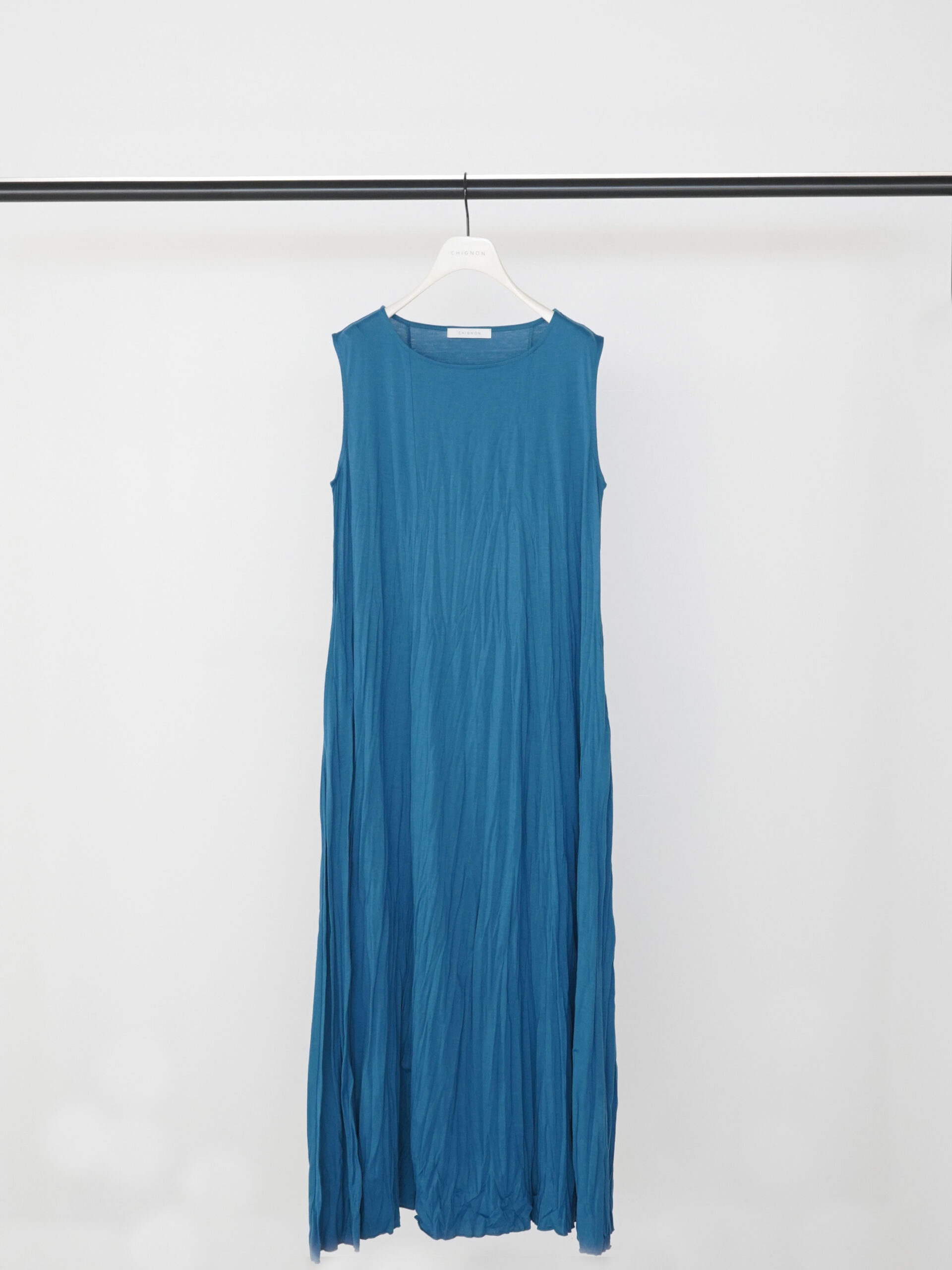 6枚のパターンで構築したAラインシルエットにシワ加工を施したデザインワンピース。上身頃はあえて加工を入れず、分量の多い裾部分にむけて1点1点加工を施し、すっきりと見える印象に。