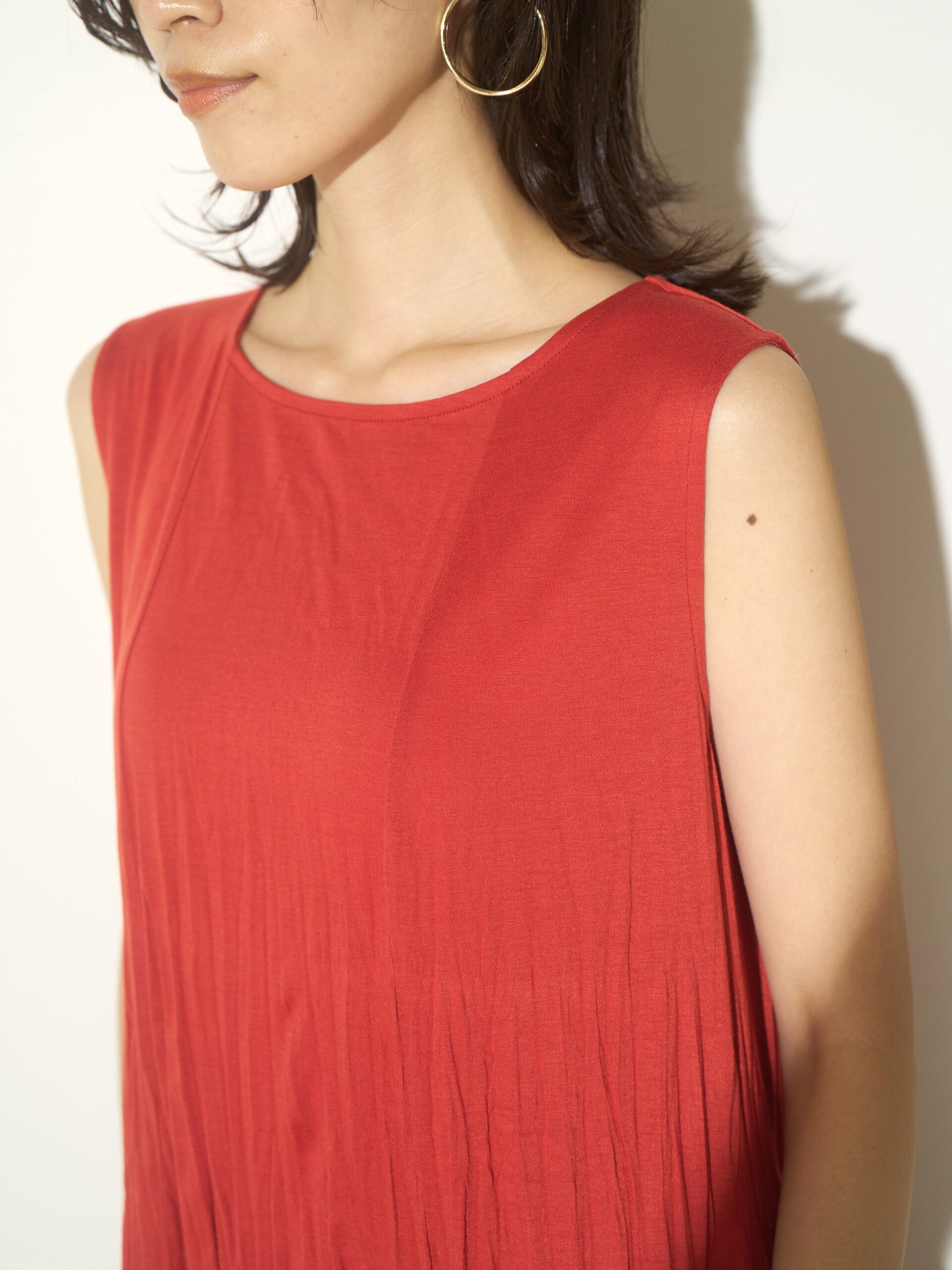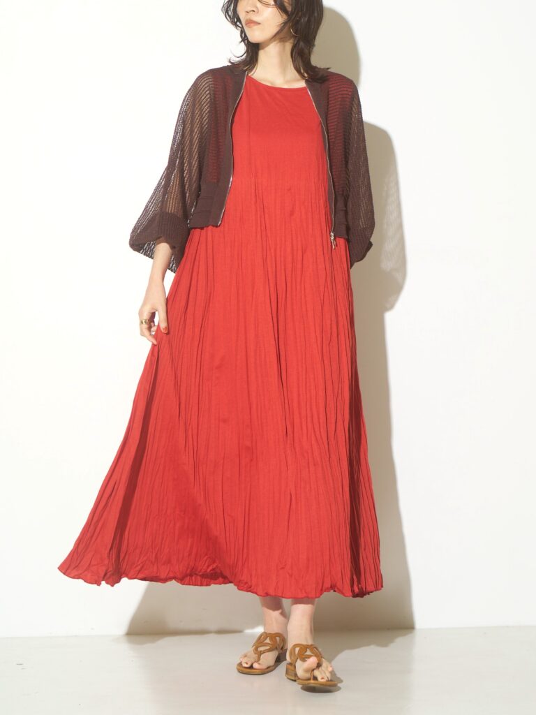 シワ加工による縦の陰影がスタイルアップ効果を生み、からだのラインを拾わずに、1枚着用するだけでこなれ感があるバランスに。シワを気にせず着用できるため、デイリーから旅行、リゾート需要まで幅広く対応します。