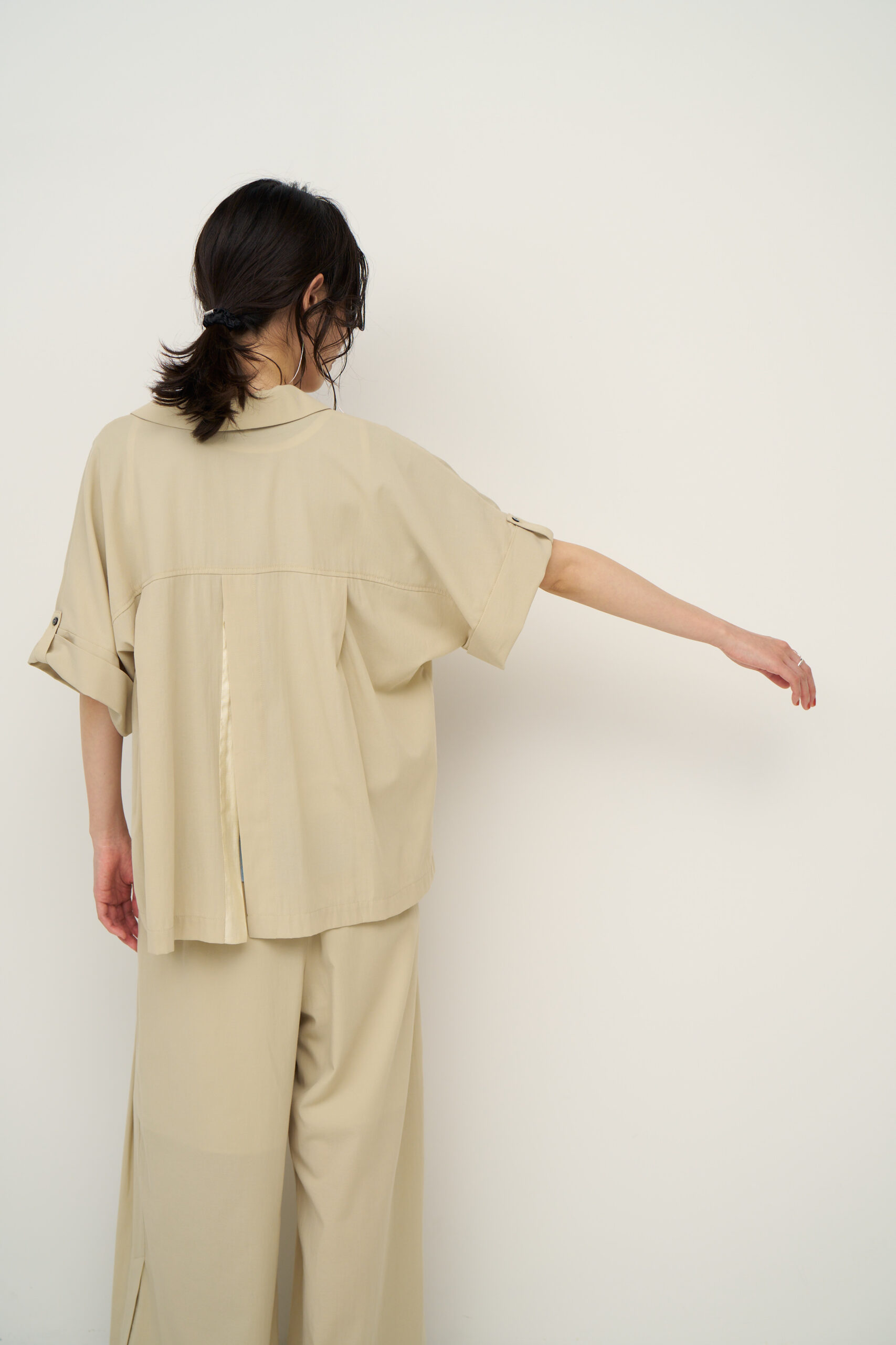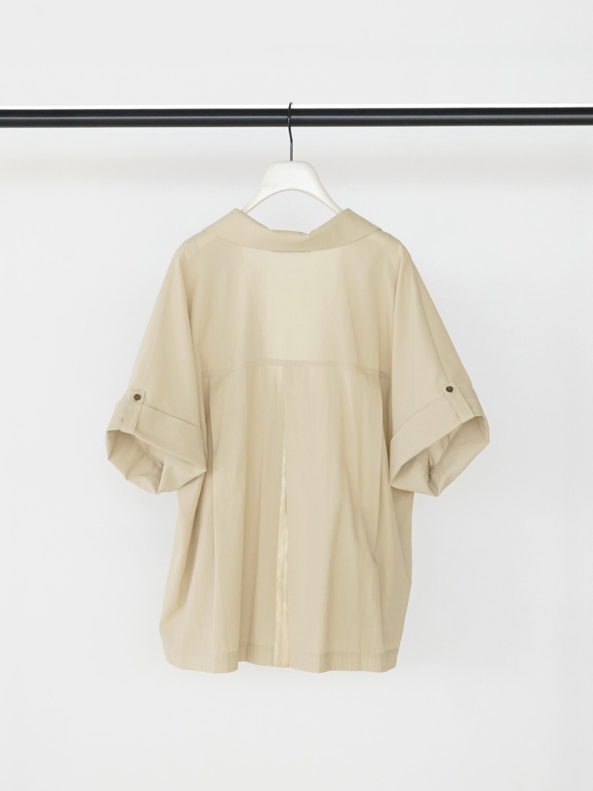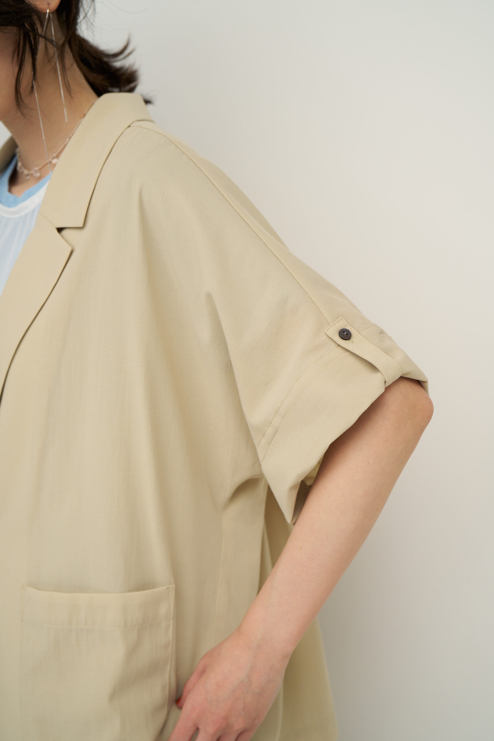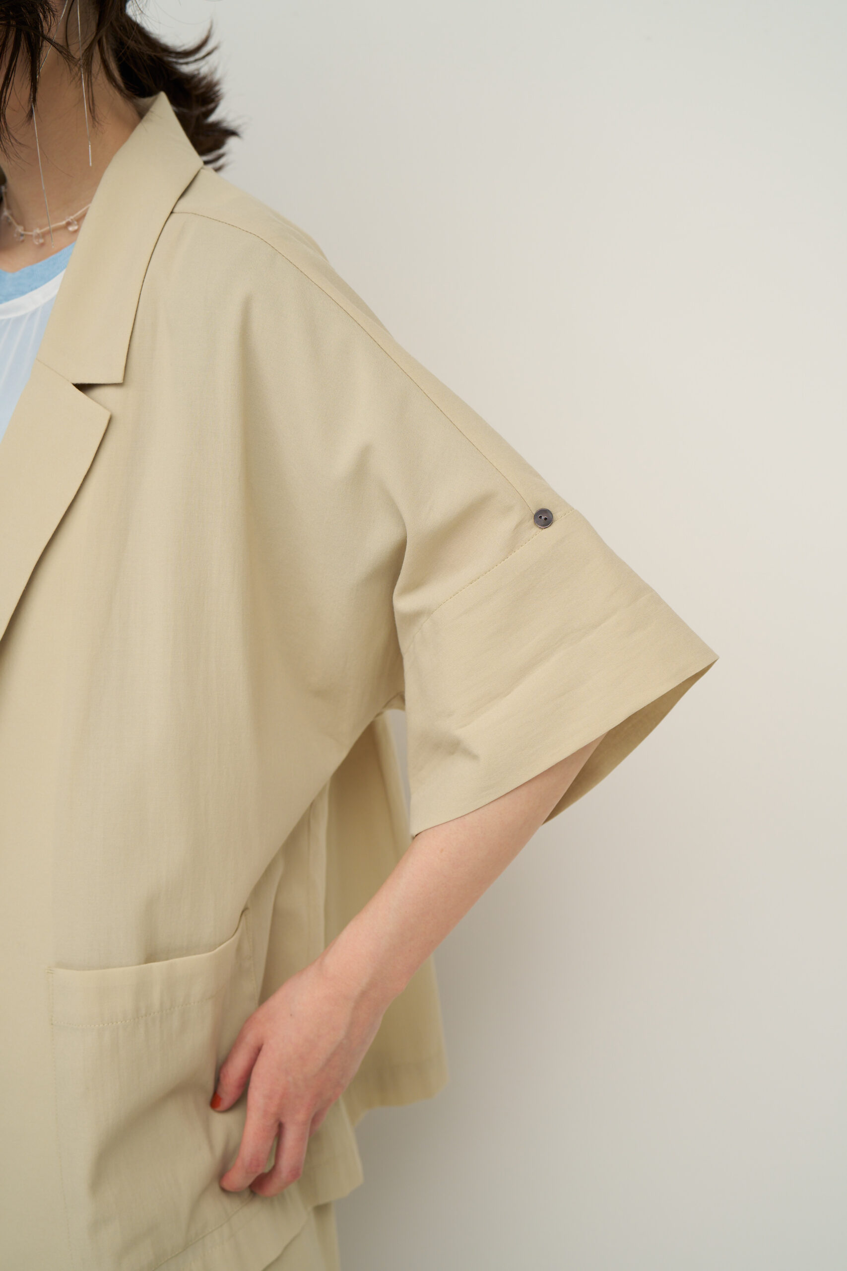 ナチュラルなシワ感のあるTCローンを使用。程よいシアー感で、清涼感のある素材で、夏にオススメな素材です。 袖丈は肘まで隠れる半袖タイプから、ロールアップで短くもできる2WAY仕様。
