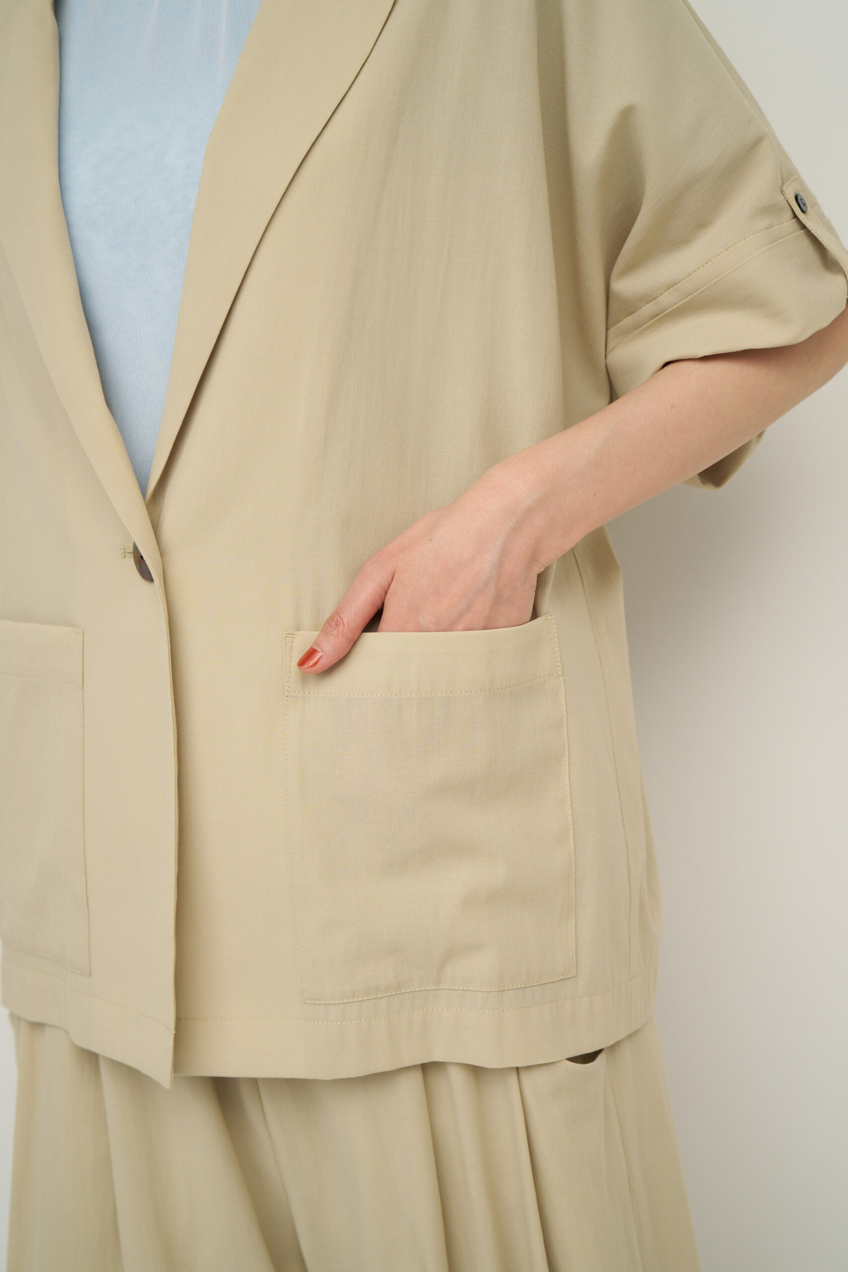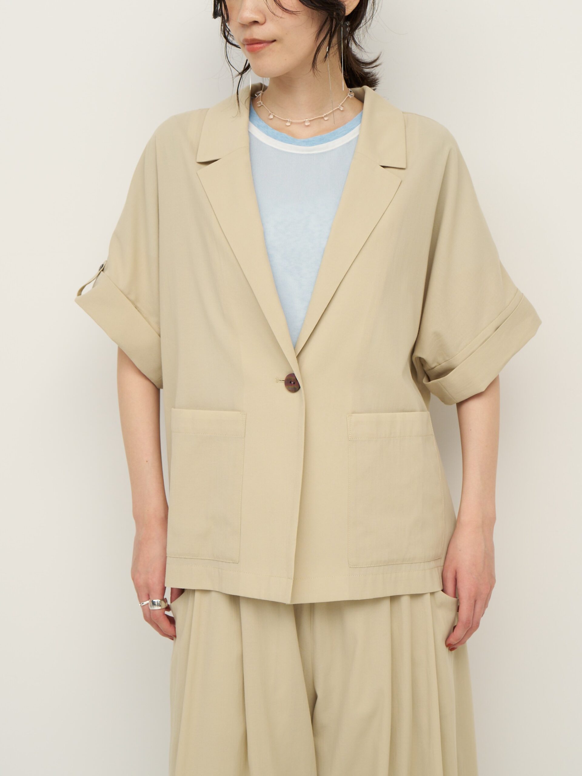 パンツとセットアップではもちろん、シャツ感覚で羽織れるライトなジャケットで、どんなコーディネートでも合わせやすい1枚です。