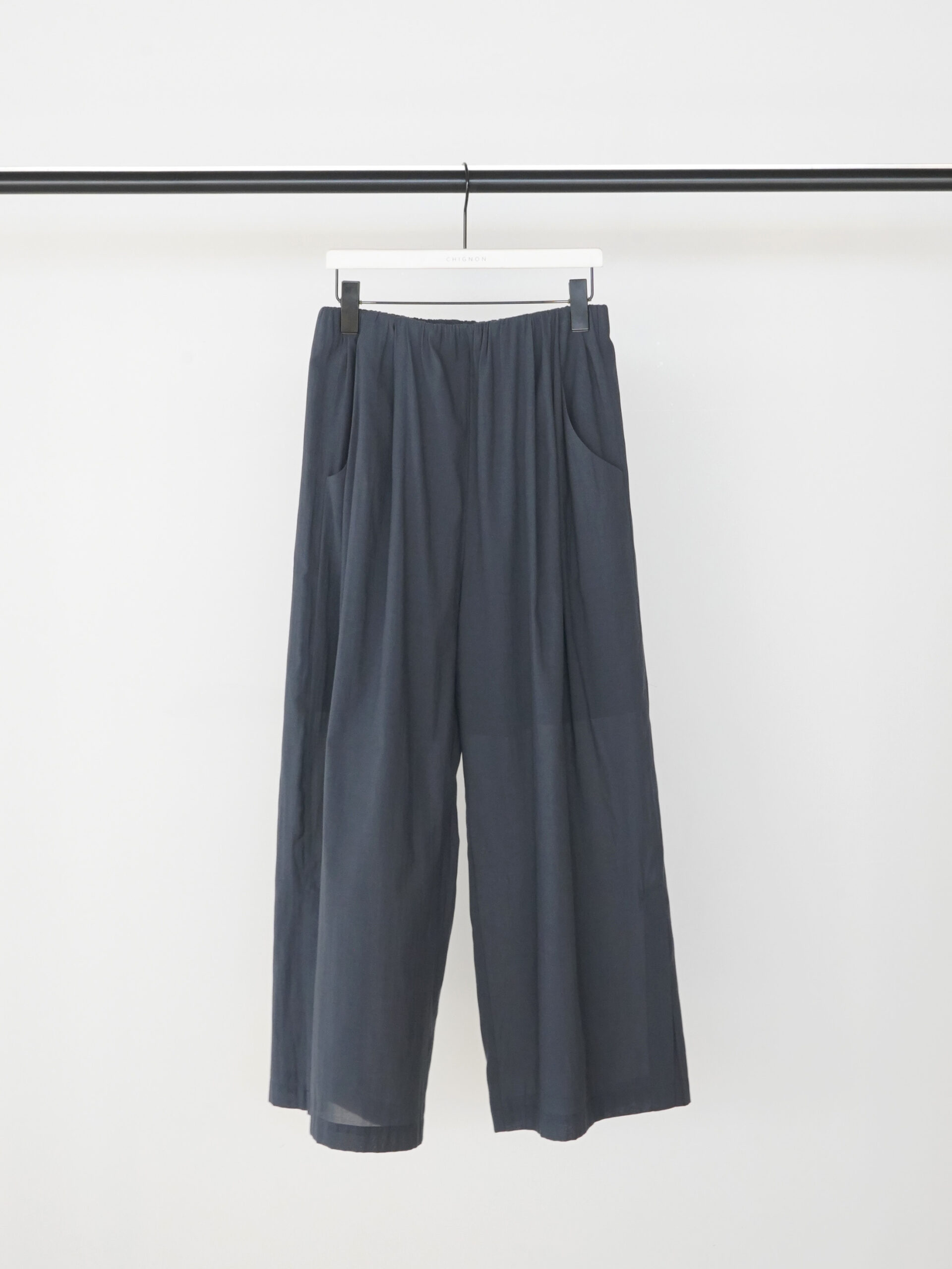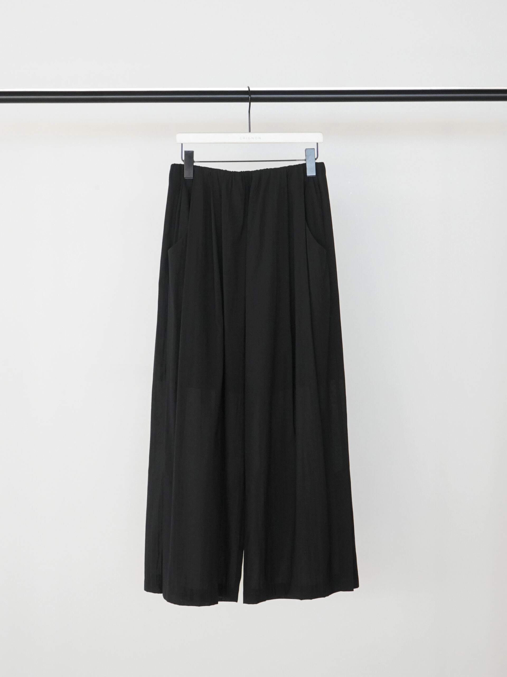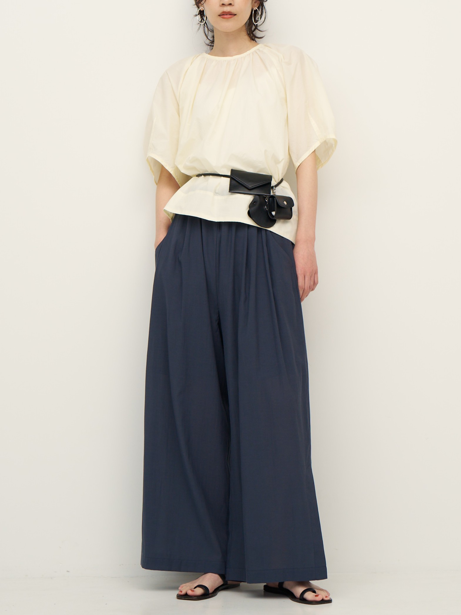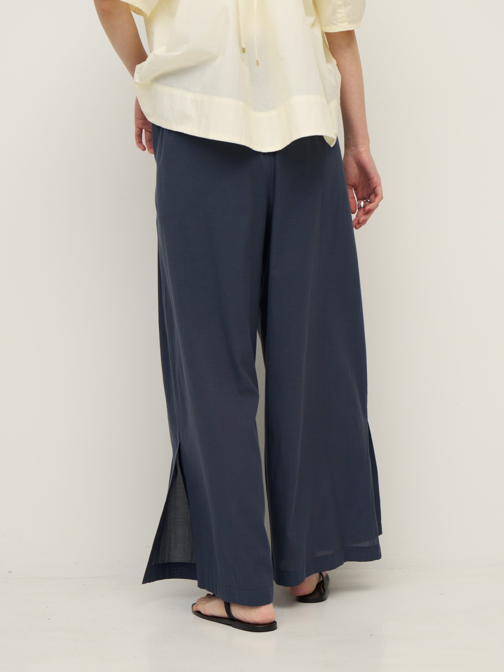 両サイドの裾には深めのベンツをプラス、軽やかな夏の足元を演出します。大胆な分量感のあるワイドシルエットでも、シアーな素材感とディティールで、程よい抜け感のあるボトムになっています。
