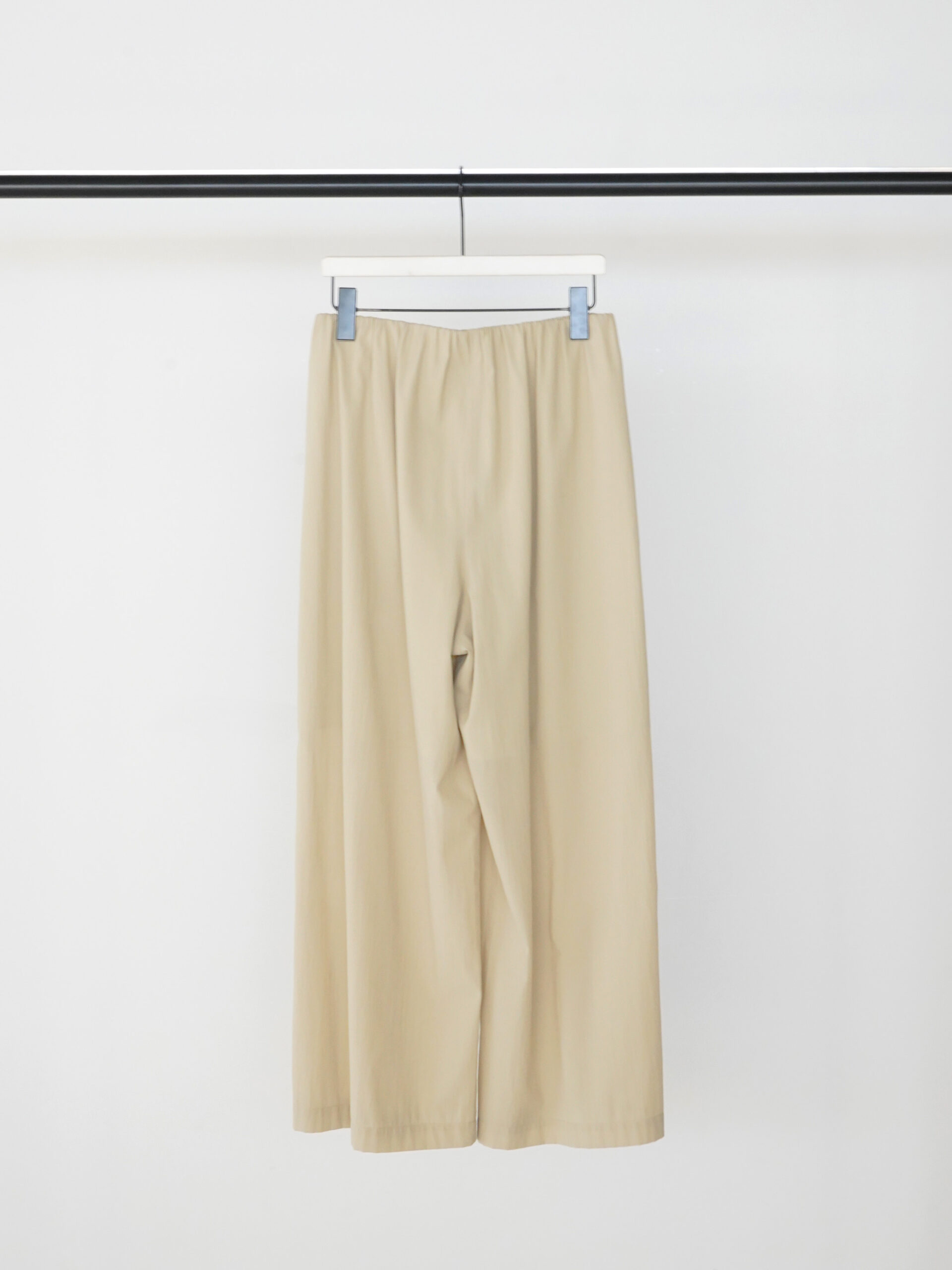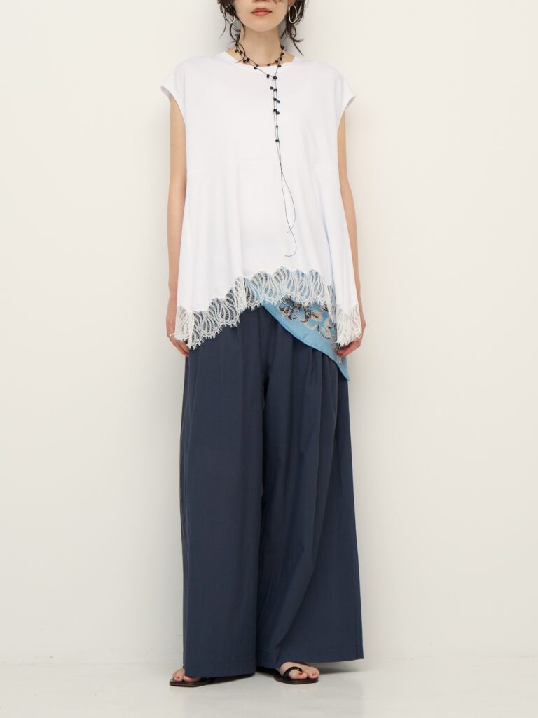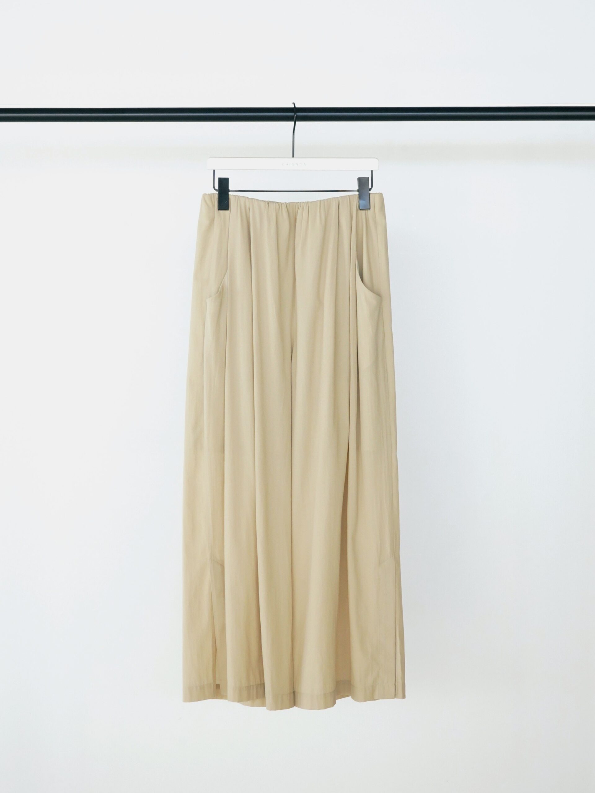 両サイドの裾には深めのベンツをプラス、軽やかな夏の足元を演出します。大胆な分量感のあるワイドシルエットでも、シアーな素材感とディティールで、程よい抜け感のあるボトムになっています。
