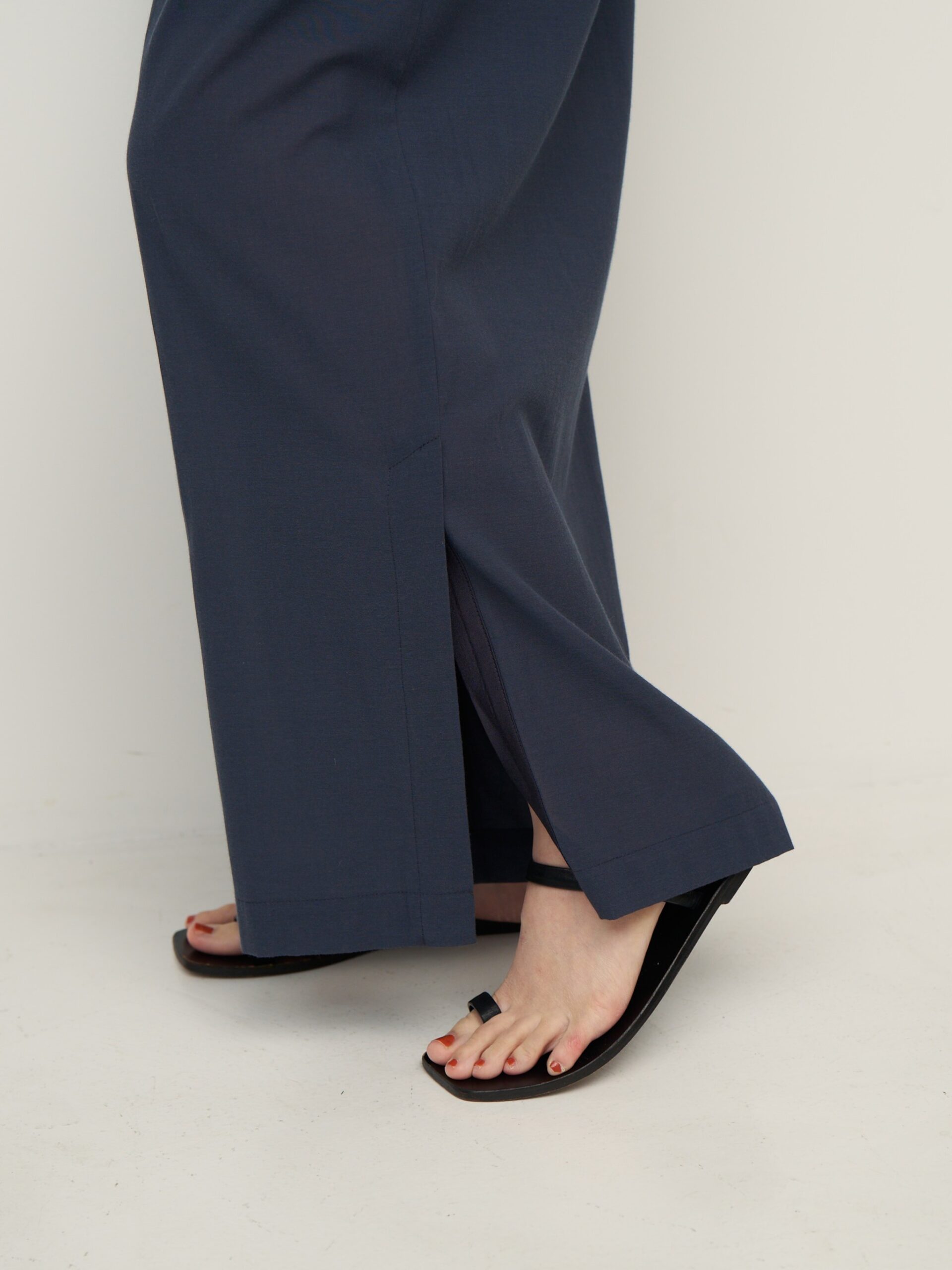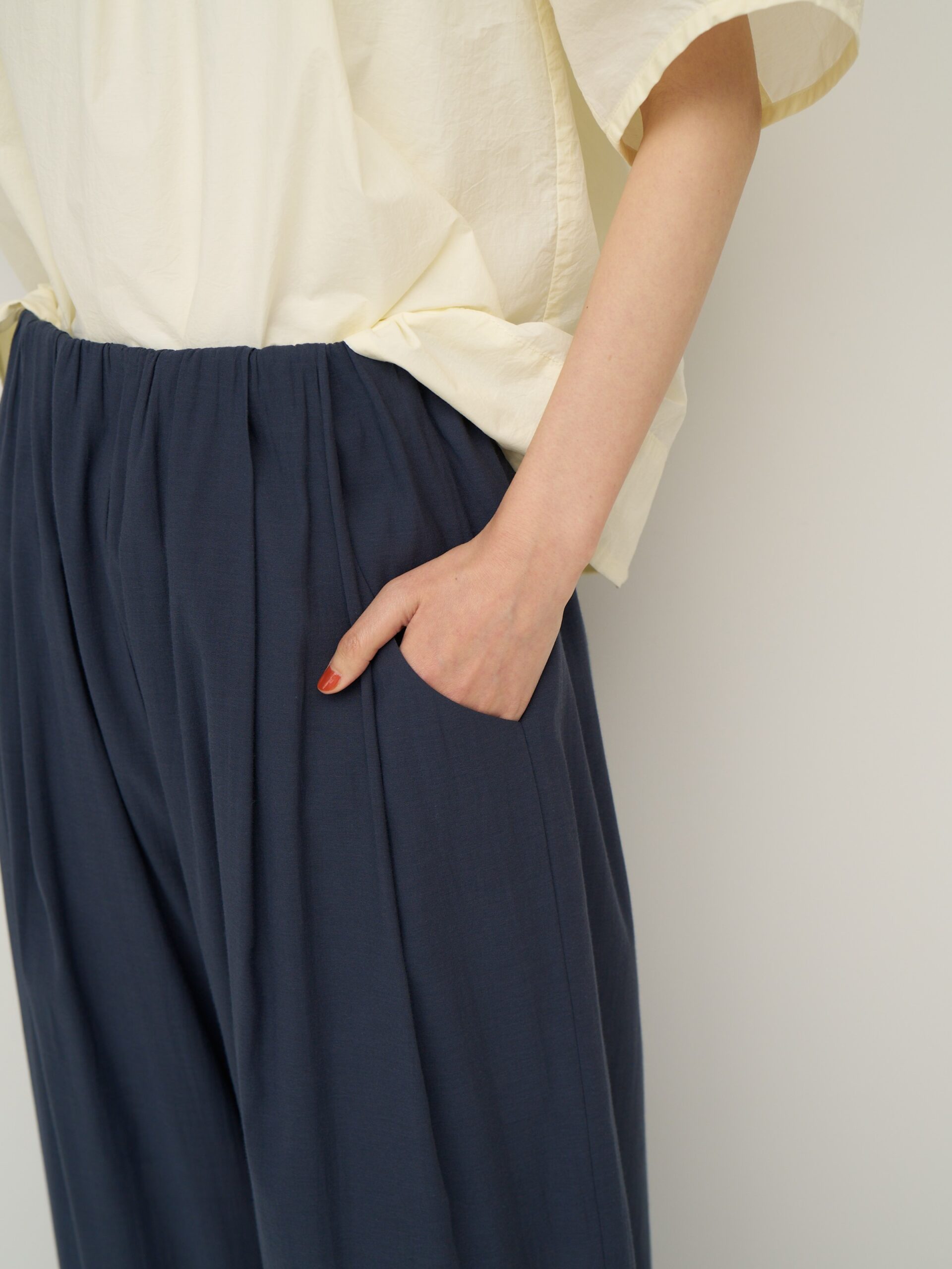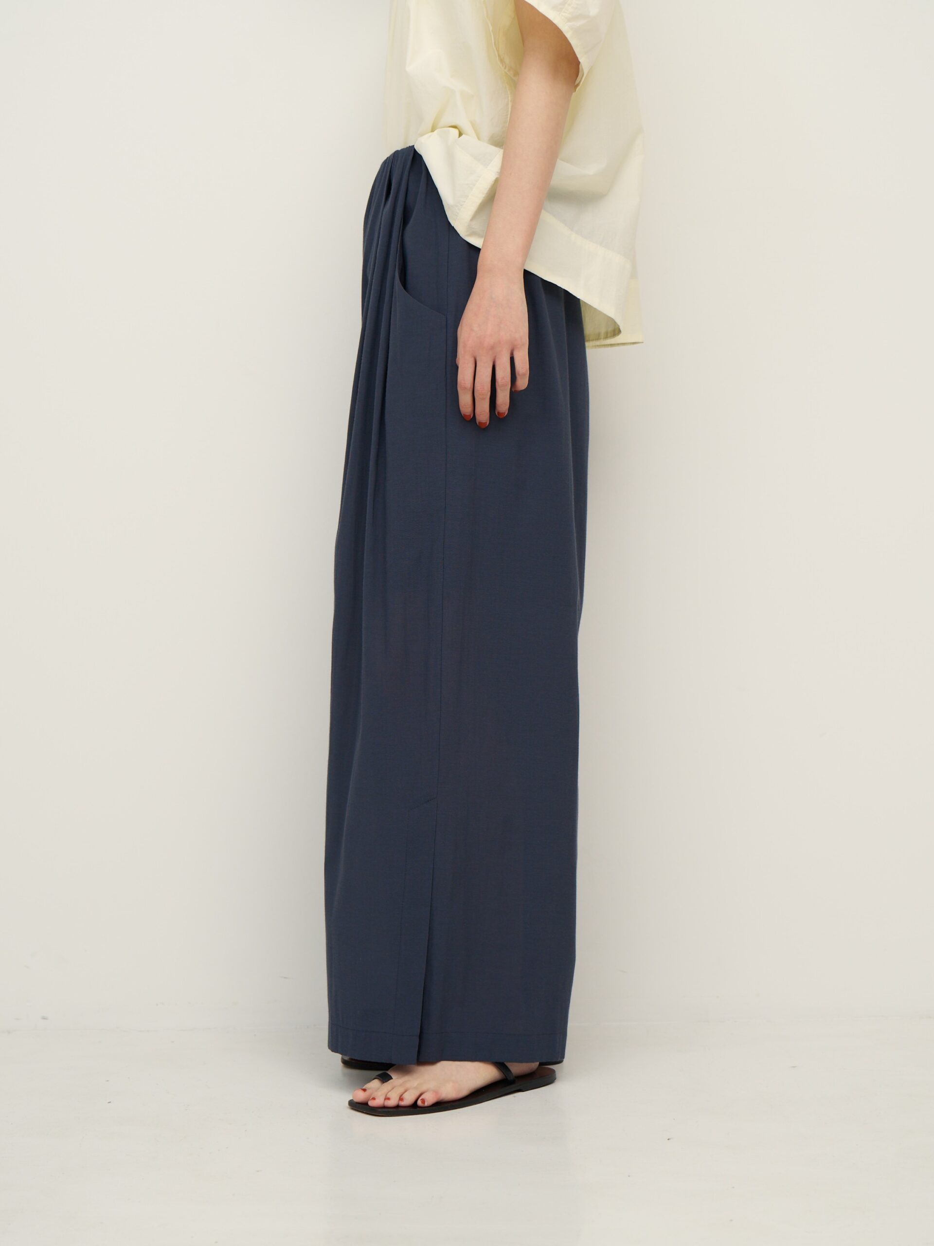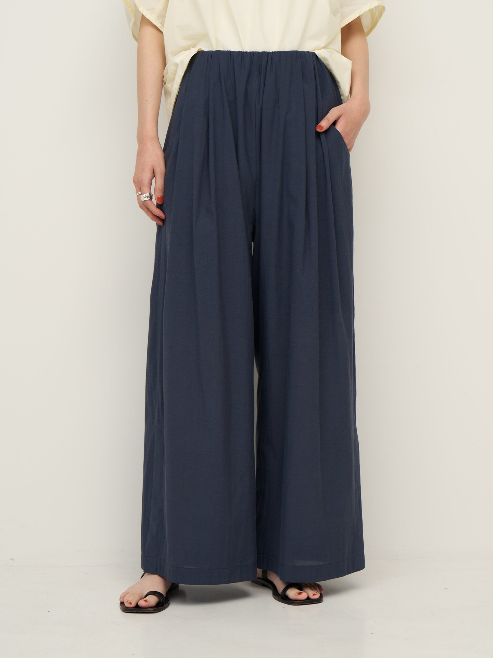 両サイドの裾には深めのベンツをプラス、軽やかな夏の足元を演出します。大胆な分量感のあるワイドシルエットでも、シアーな素材感とディティールで、程よい抜け感のあるボトムになっています。