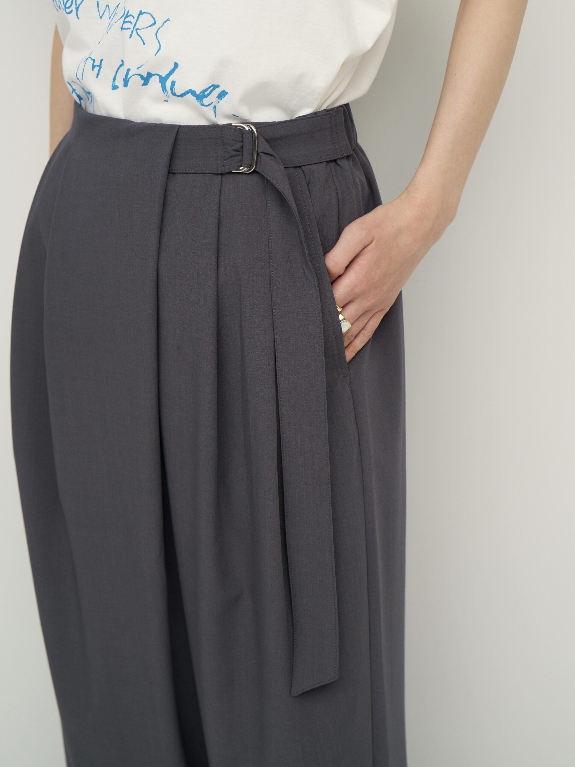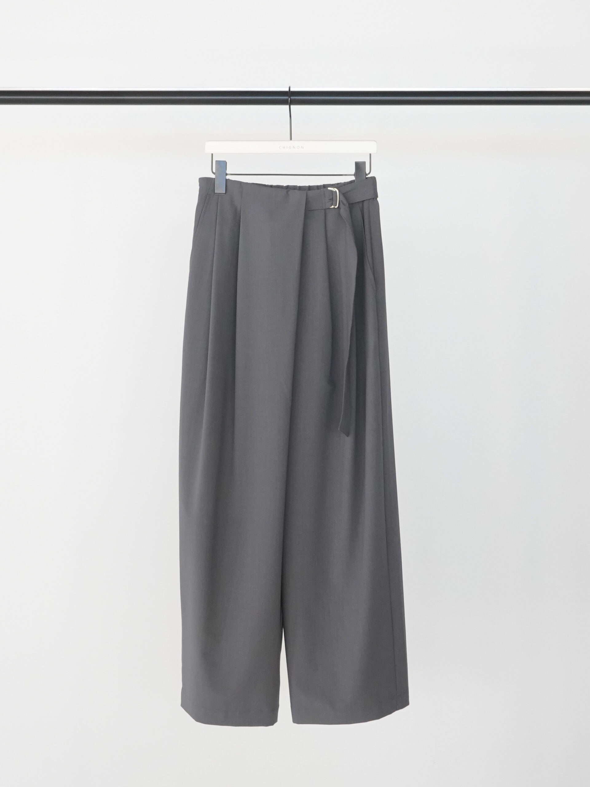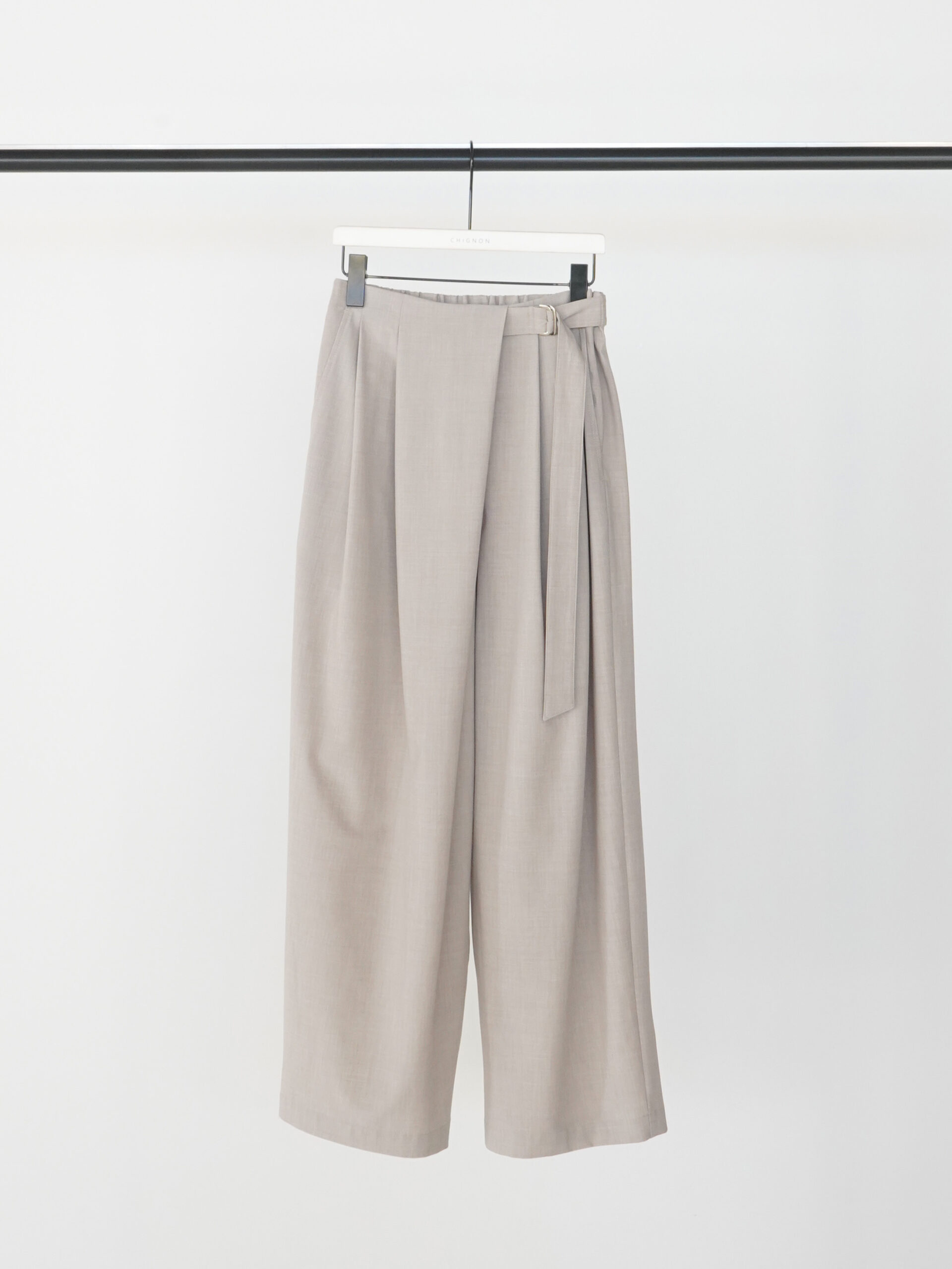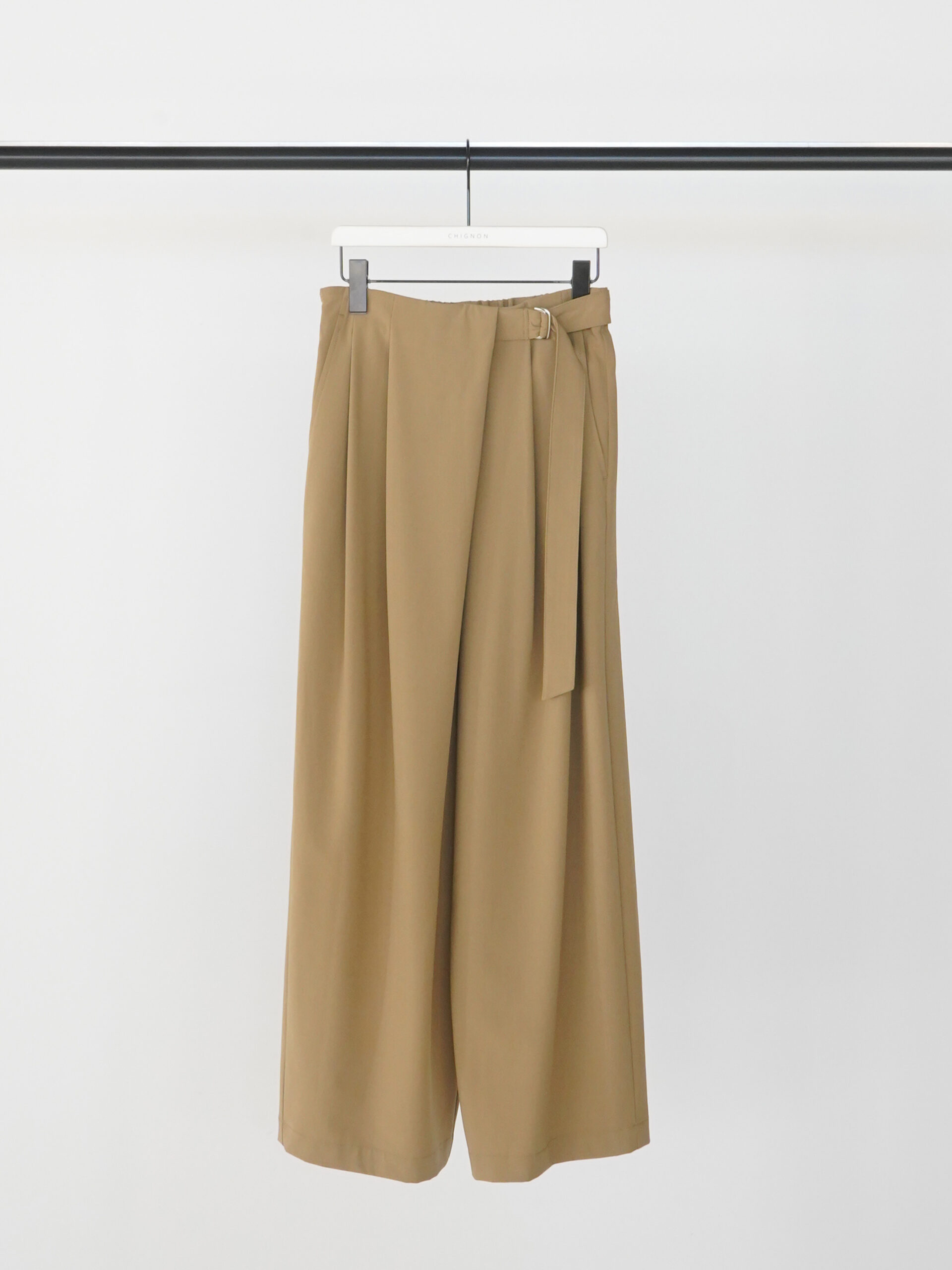 Tシャツなど、トップスがシンプル&カジュアルになってくる季節にこそ提案したい、キレイめに履けるラップ風パンツ。