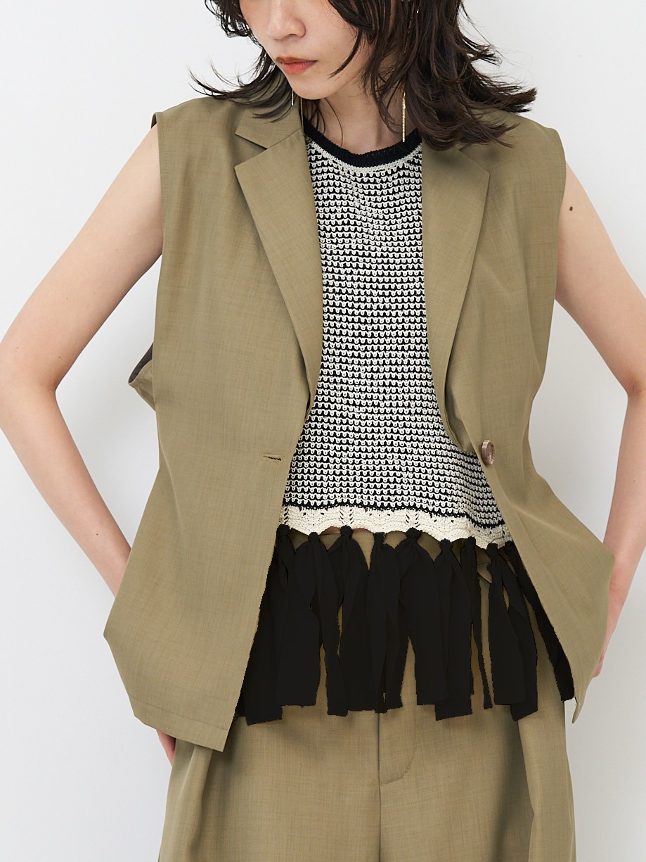身頃はドレーピングによって立体的に構築、ウエストからペプラムへと流れるラインや、飛び出るようなラペル止まりなど、クラフトテクニックを取り入れたデイリークチュールな1枚になっています。